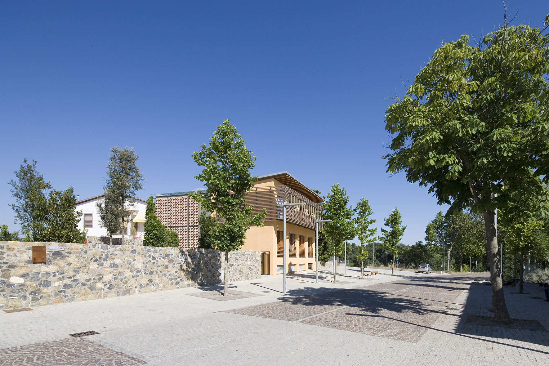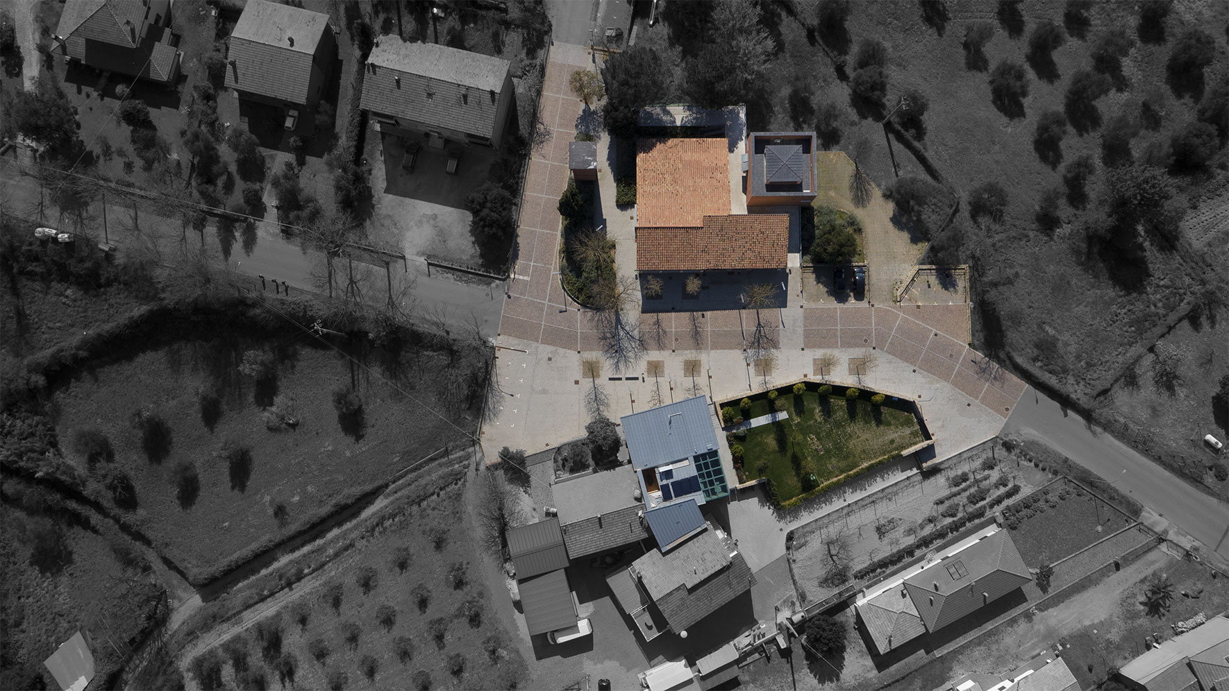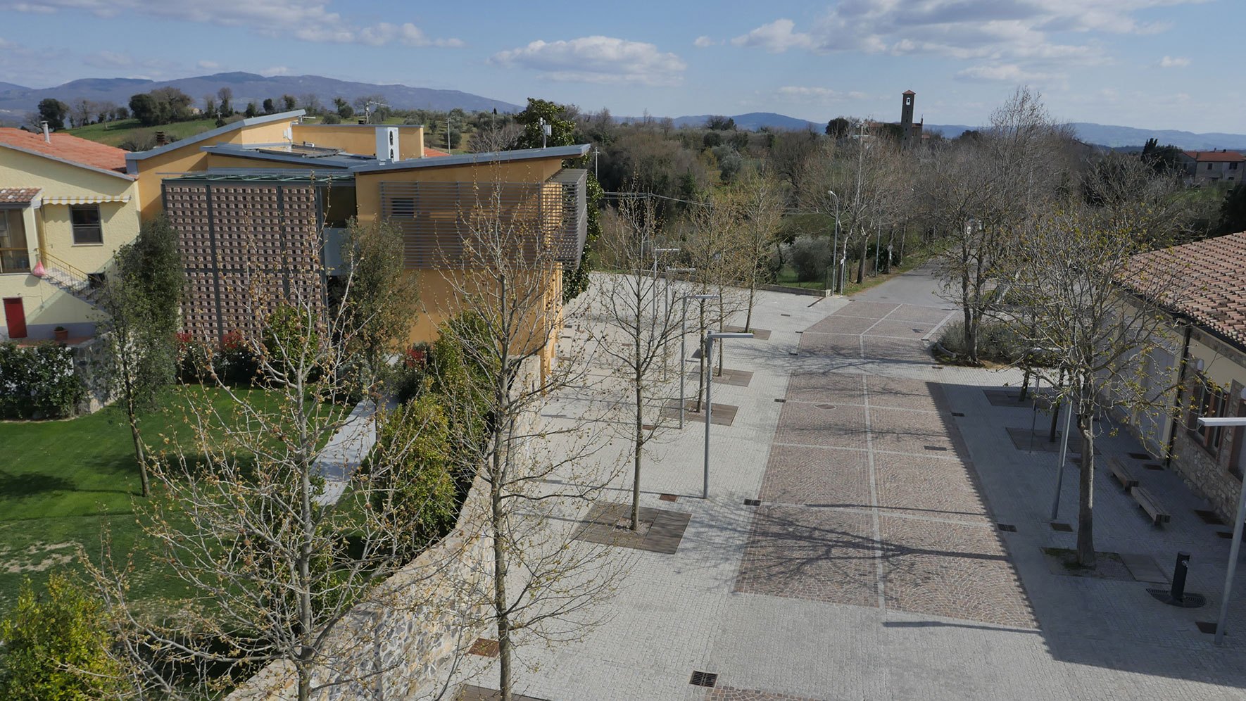 Trasformare una strada a traffico pesante in un luogo di sosta e aggregazione. Dare identità a un’area che impropriamente ha sostituito il centro storico inesorabilmente isolato dalla nuova infrastruttura provinciale. Mettere in sicurezza la settimanale frequentazione dell’ambulatorio medico. Completare quell’auspicata rivitalizzazione avviata con la riconversione della scuola elementare in emporio alimentare. Dissuadere la dittatura di un traffico carrale arrogante e presuntuoso. La piazza riacquista la sua vitalità anche grazie al nuovo emporio alla locanda “le scuole”, un piccolo albergo ricavato dalla riqualificazione dell’edifico Ardenghi.