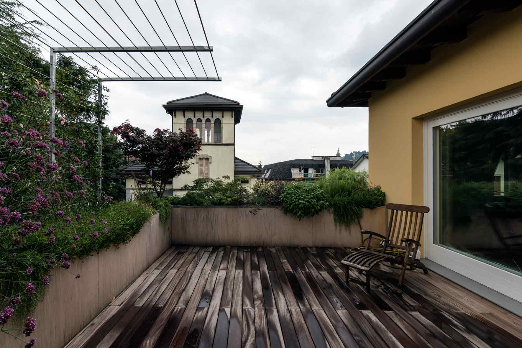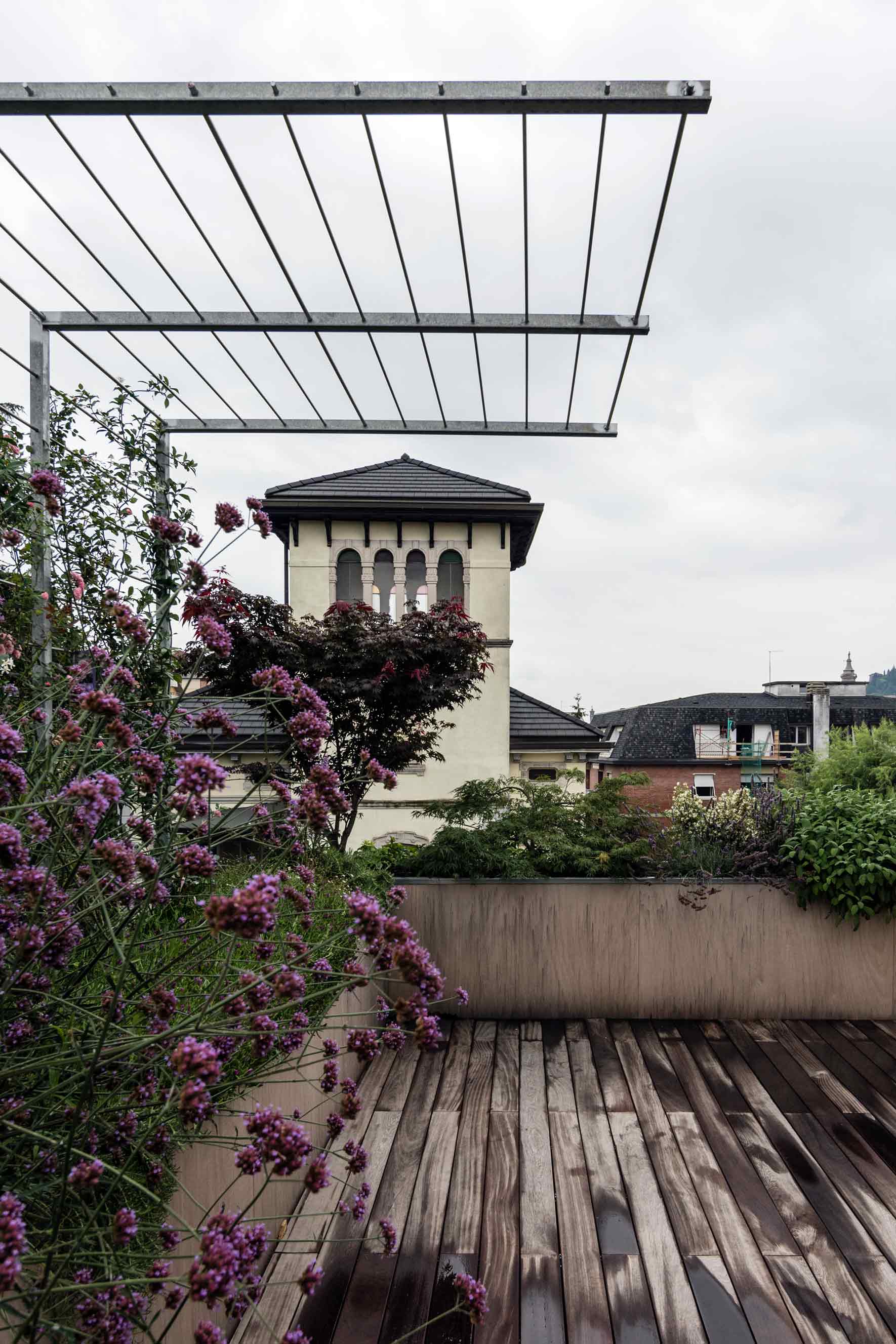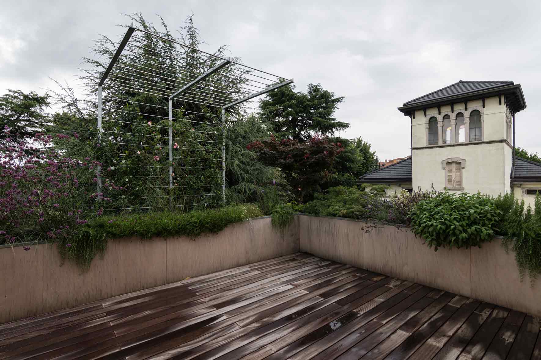 The new French window created a gap in continuity between the inside with an oak wood floor and the outside with an ipe wood floor. The new design of the terrace involved replacing the balustrade and the stone pillars with iron tanks covered with raw okoumé wood panels and two iron pergolas with climbing and carpeting plants with deciduous foliage to shield the newly made French windows from the sun. The tanks along the perimeter of the terrace were provided with aromatic plants, perennial herbaceous plants, shrubs and climbing plant.