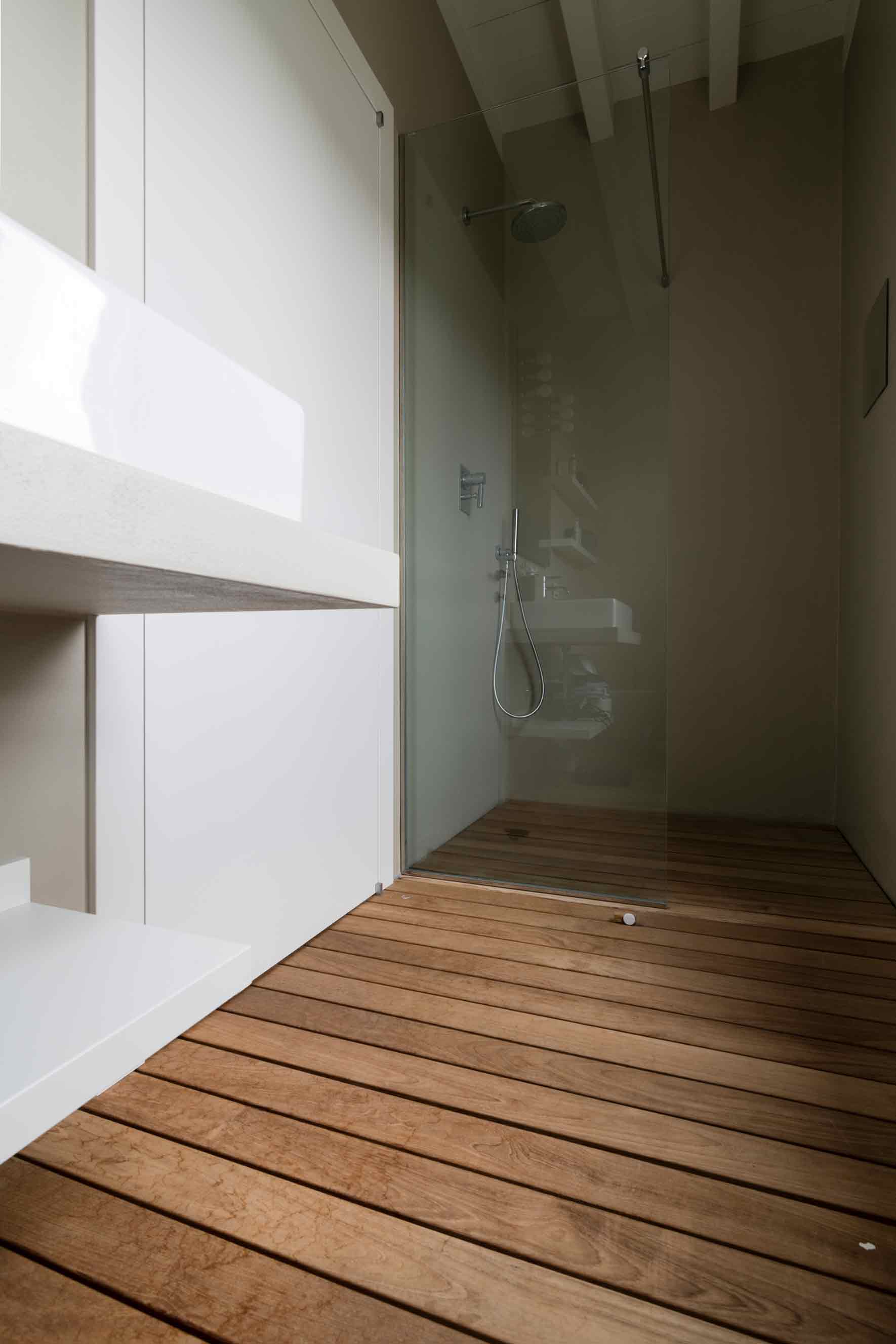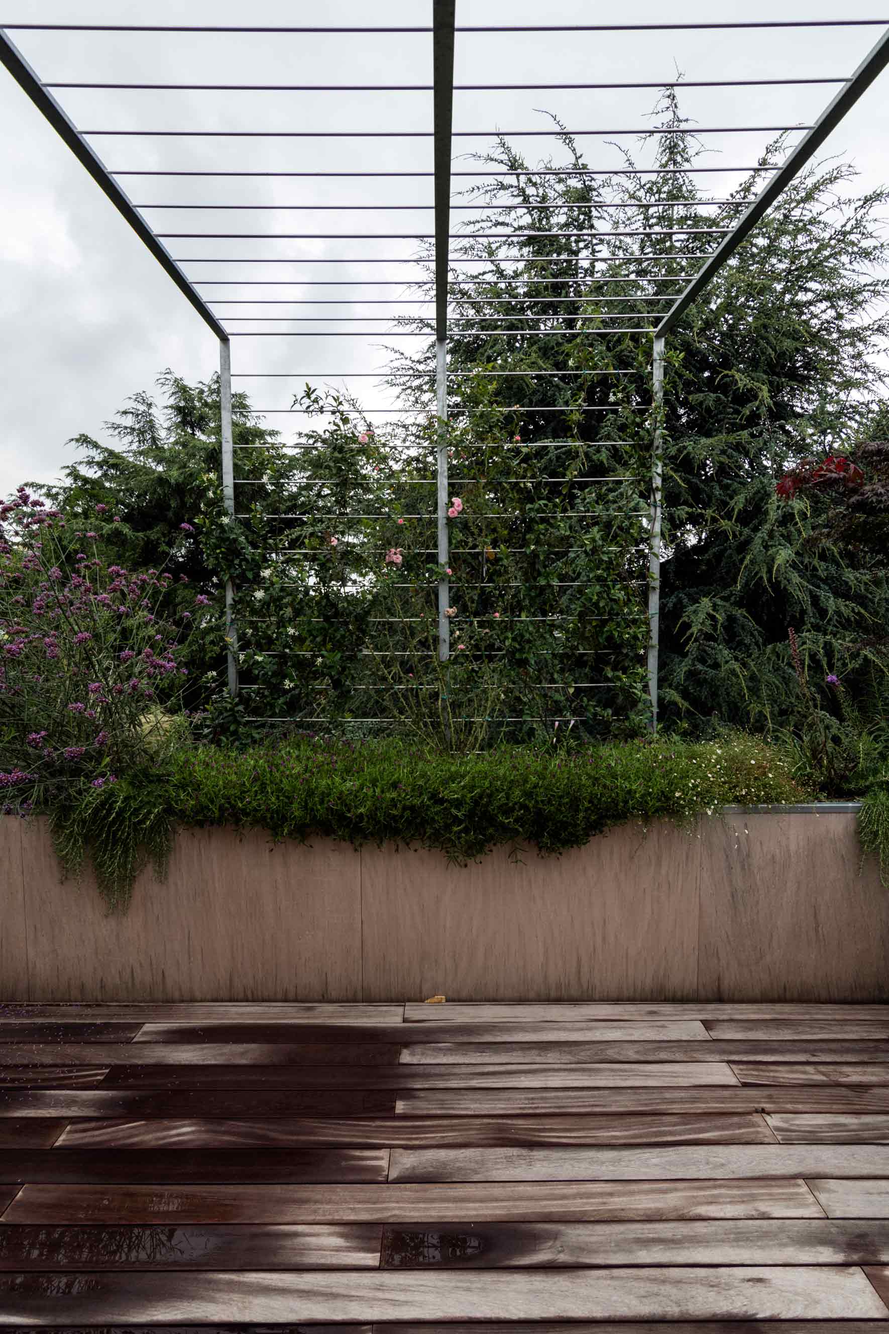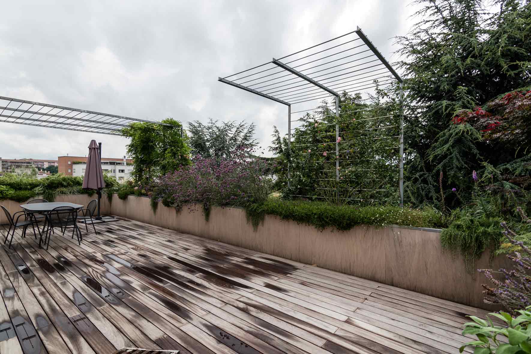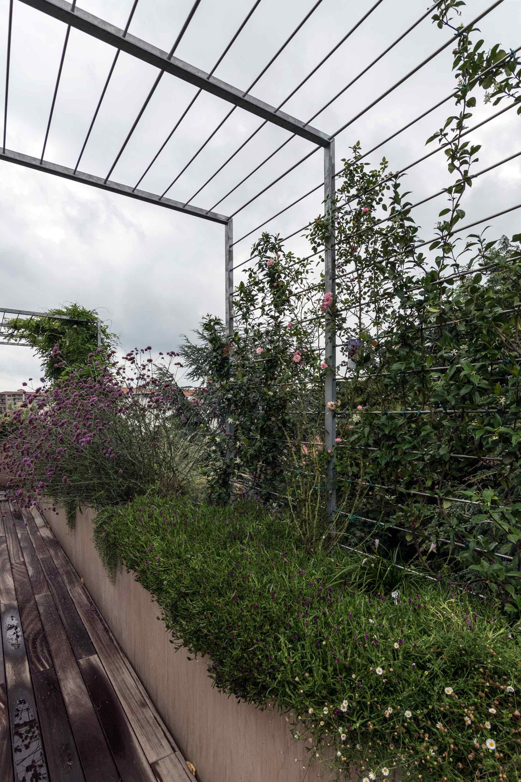 The new French window created a gap in continuity between the inside with an oak wood floor and the outside with an ipe wood floor. The new design of the terrace involved replacing the balustrade and the stone pillars with iron tanks covered with raw okoumé wood panels and two iron pergolas with climbing and carpeting plants with deciduous foliage to shield the newly made French windows from the sun. The tanks along the perimeter of the terrace were provided with aromatic plants, perennial herbaceous plants, shrubs and climbing plant.