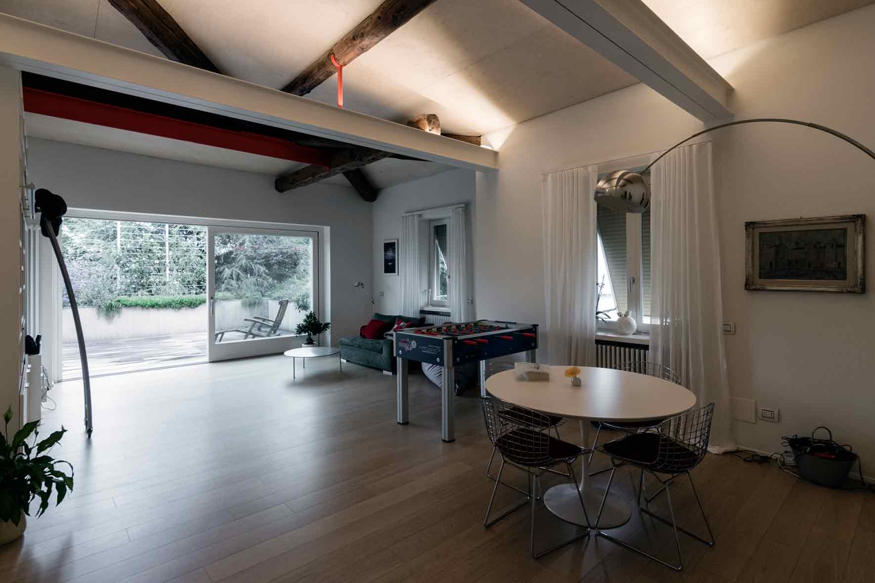 The project involved merging two apartments located on the second and last floor of a building in the centre of Bergamo and decorating the terrace with plants. By demolishing a partition wall and enlarging the existing French window, one single open-space apartment overlooking the terrace was created. To make the new living room airier, it was decided to demolish the non-structural false ceiling made of reinforced concreted, thus exposing the wooden structure of the roof, which was then insulated and covered with raw birch panels.