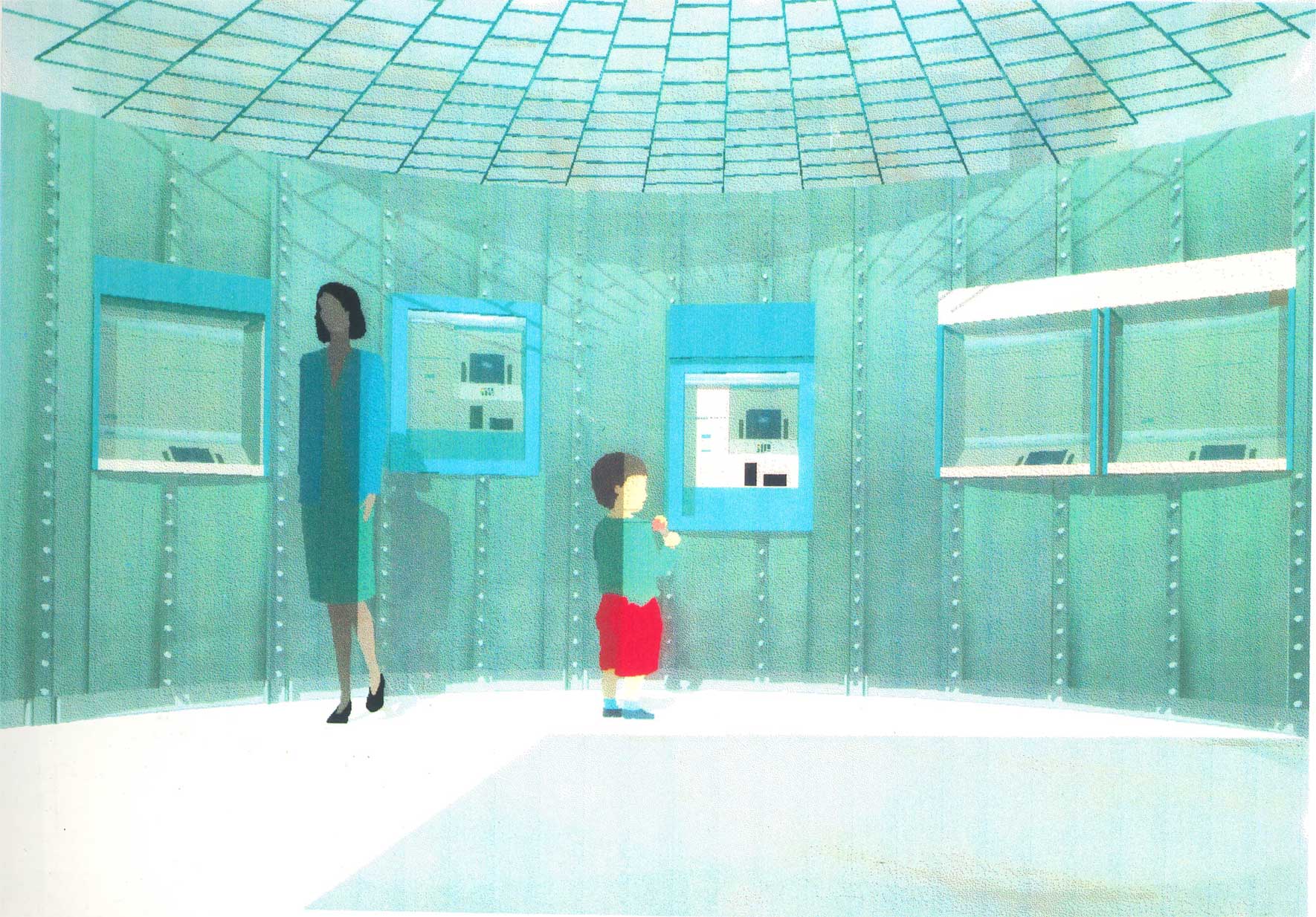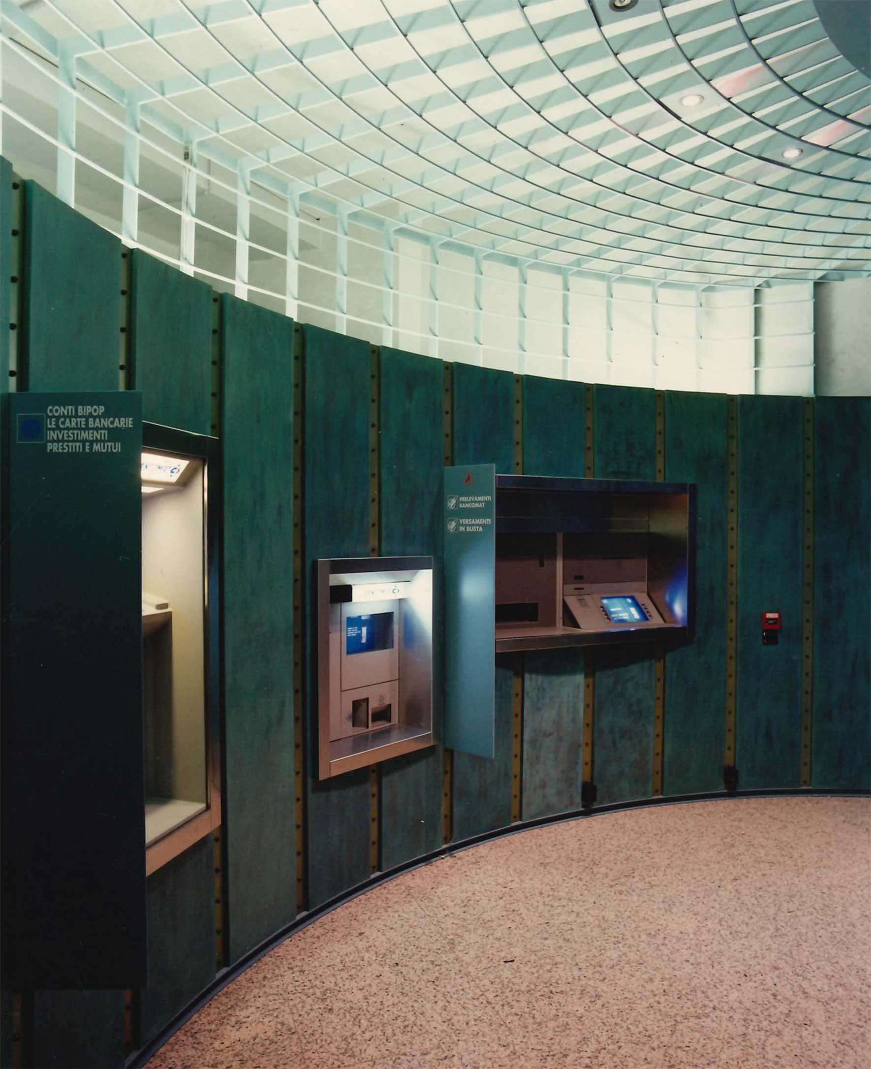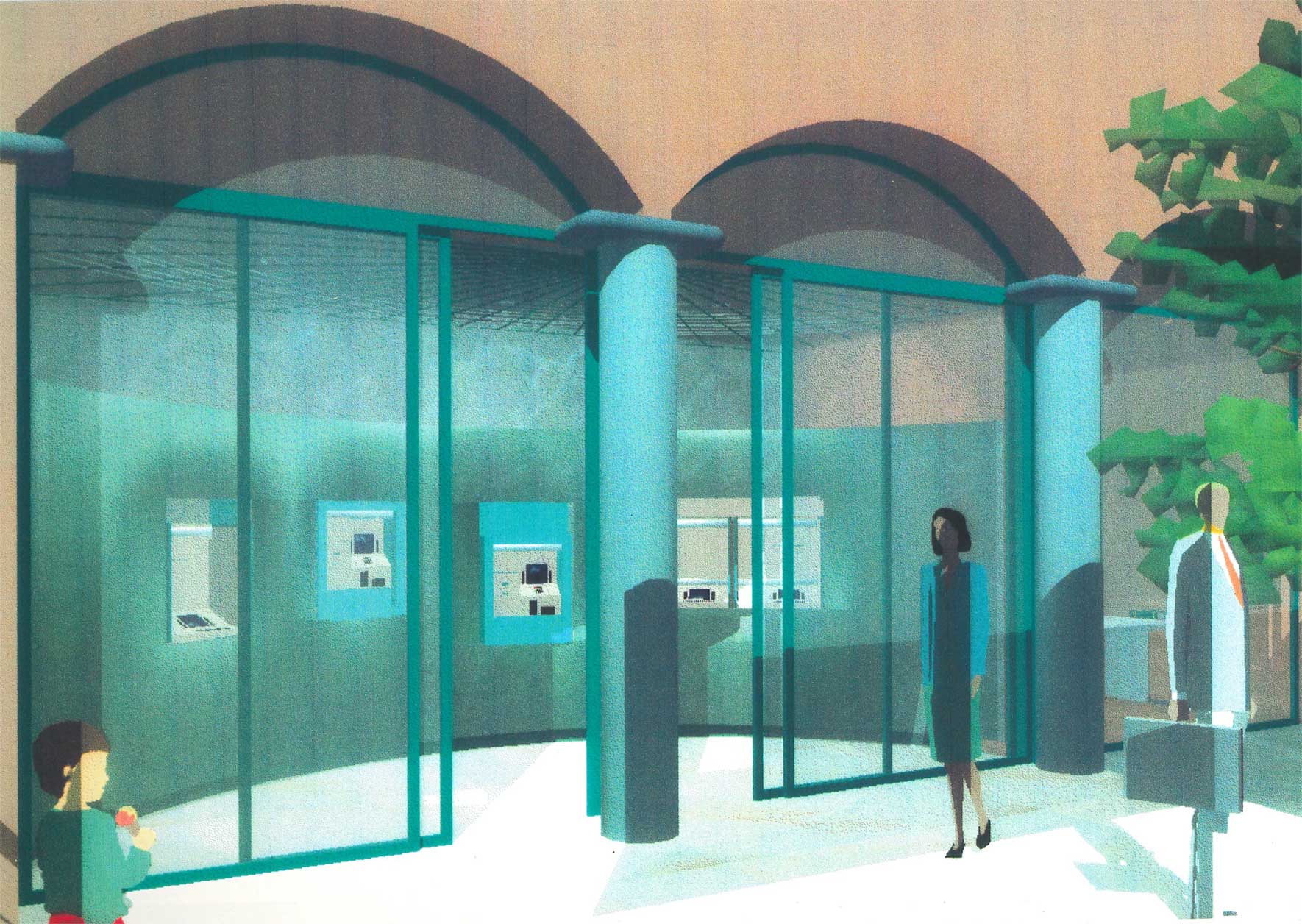Collaboration with Olivetti Engeneering in the advanced tertiary sector. These are the first banks with automatic teller machines designed using the first photorealistic images.