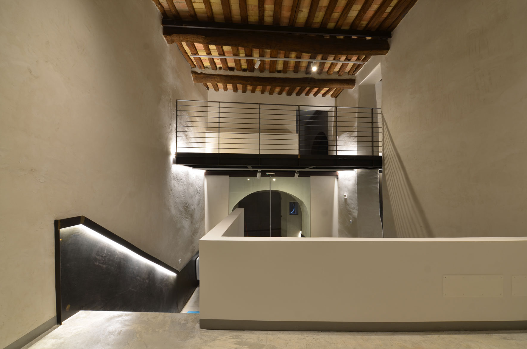 The building can be accessed from the street through an entrance hall that leads to the adjacent offices and the new staircase. It can also be accessed from the internal cloister, which in turn can be accessed from the staircase. The staircase leads to the administrative open-space offices on the upper floors and up to the floor intended for the conference room, the offices, the archives and the management room, from which a privileged view can be enjoyed ranging from the Fortress of Montalcino and the Church of Saint Augustine to the natural beauty of the surrounding countryside.