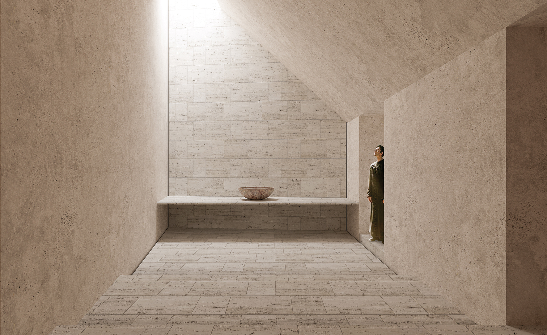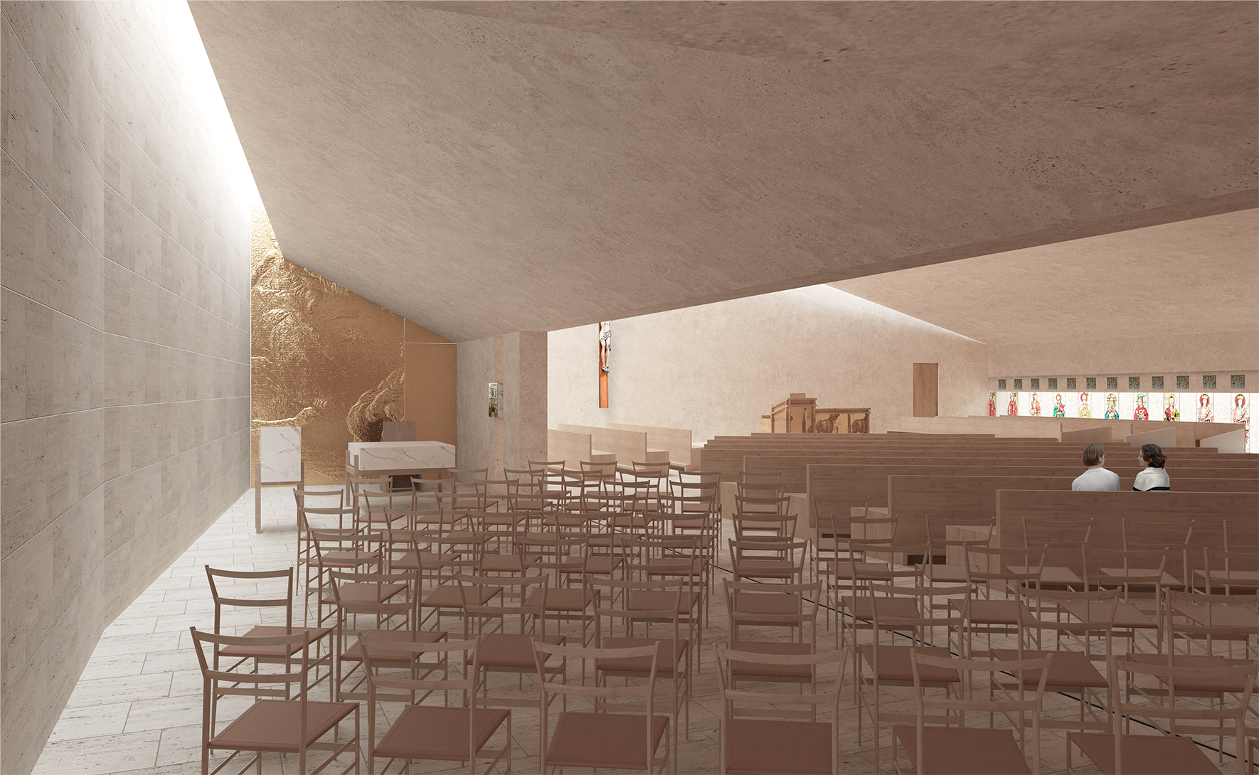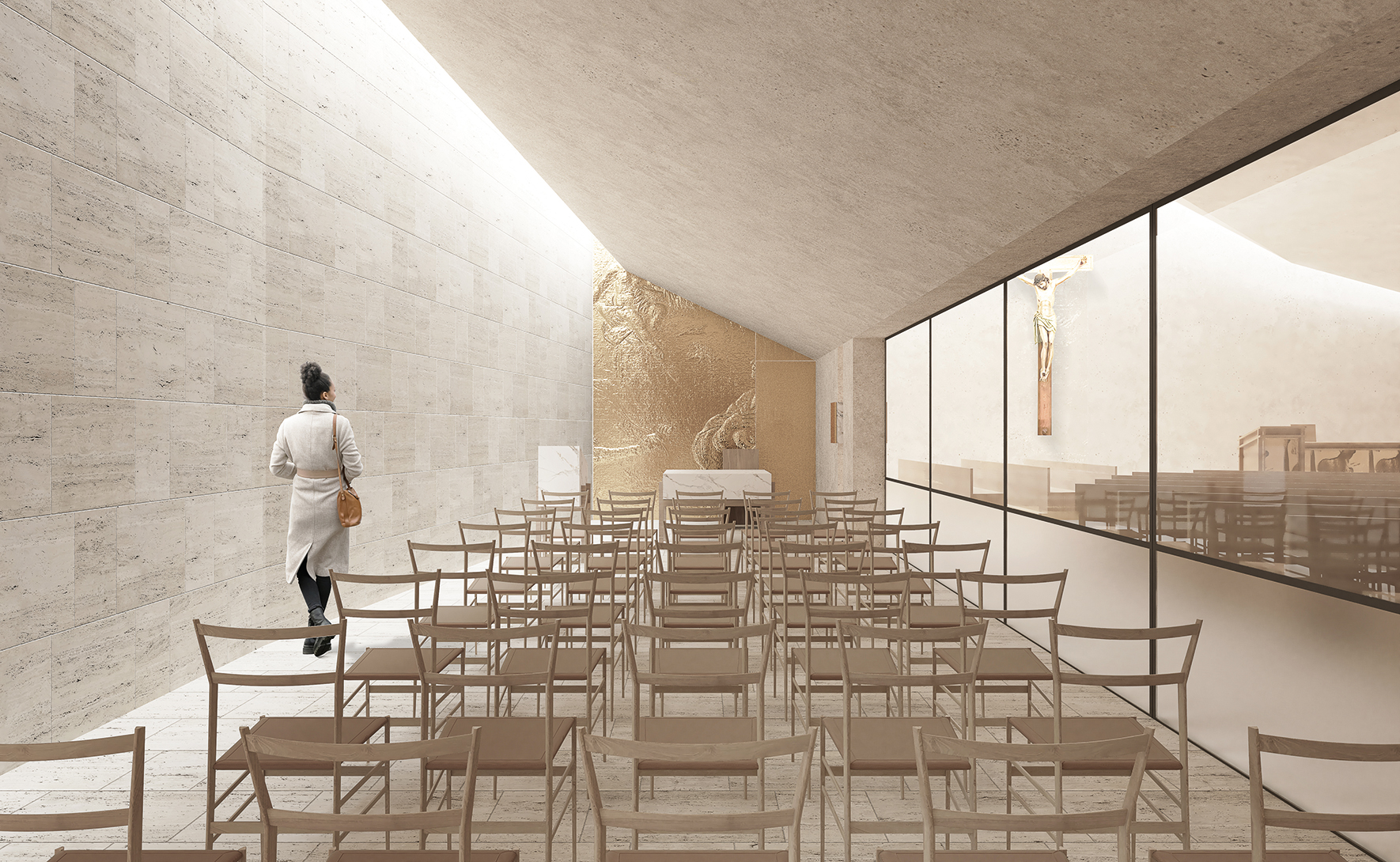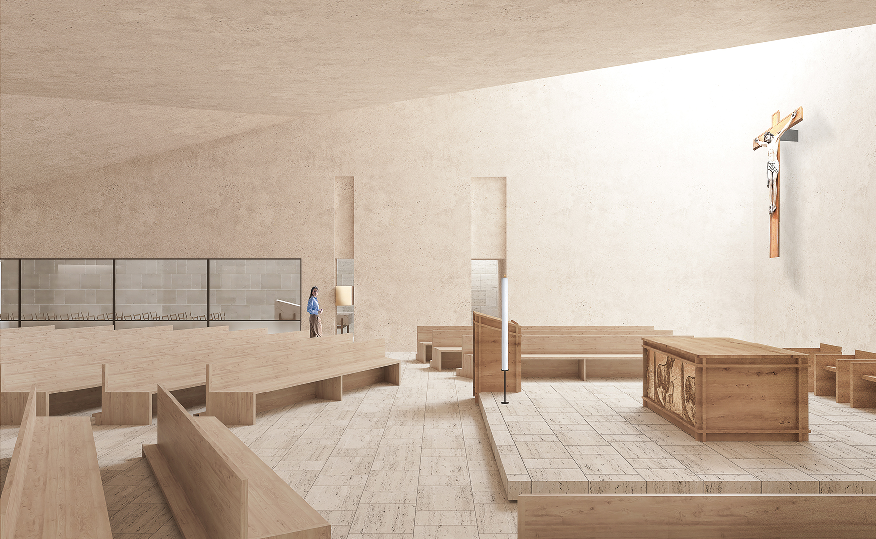 The design of the interior liturgical spaces, characterized by a simple aesthetic yet symbolically vibrant and spiritually evocative, centers around a vertical use of natural light that enhances its sacredness. This light orientation directs focus toward the liturgical focal points, creating an eschatological effect. Beams of zenithal light illuminate the altar, the weekday chapel, and the baptistery, rendering the walls almost immaterial and alluding to the parousia.