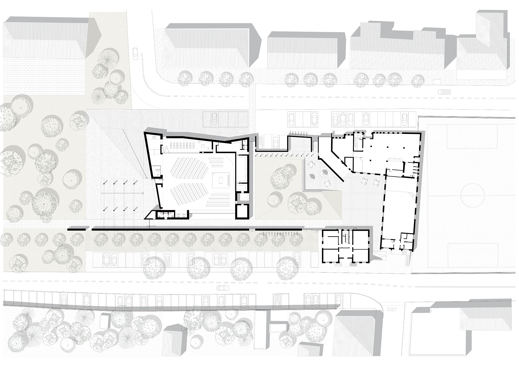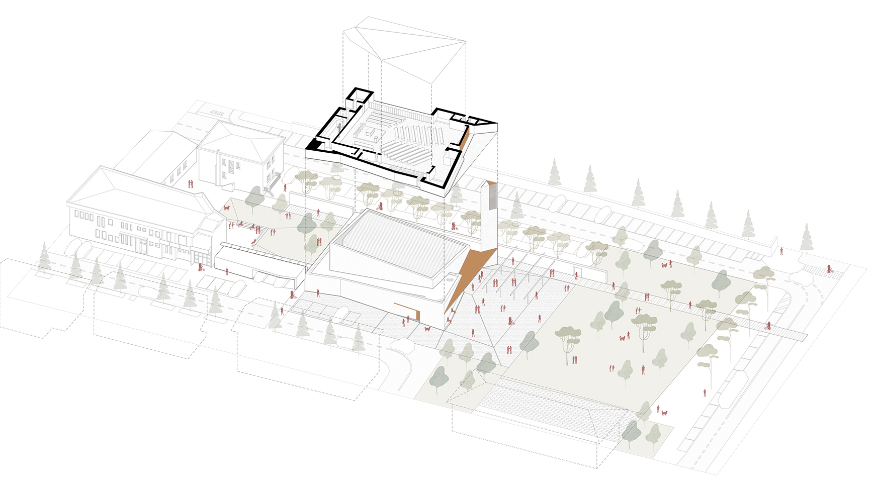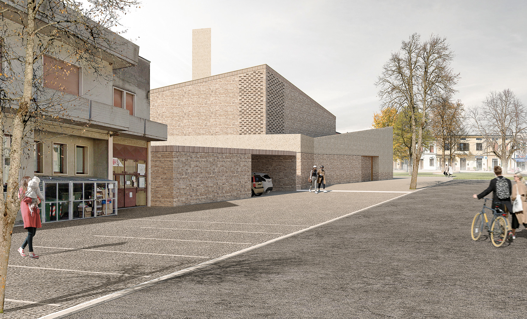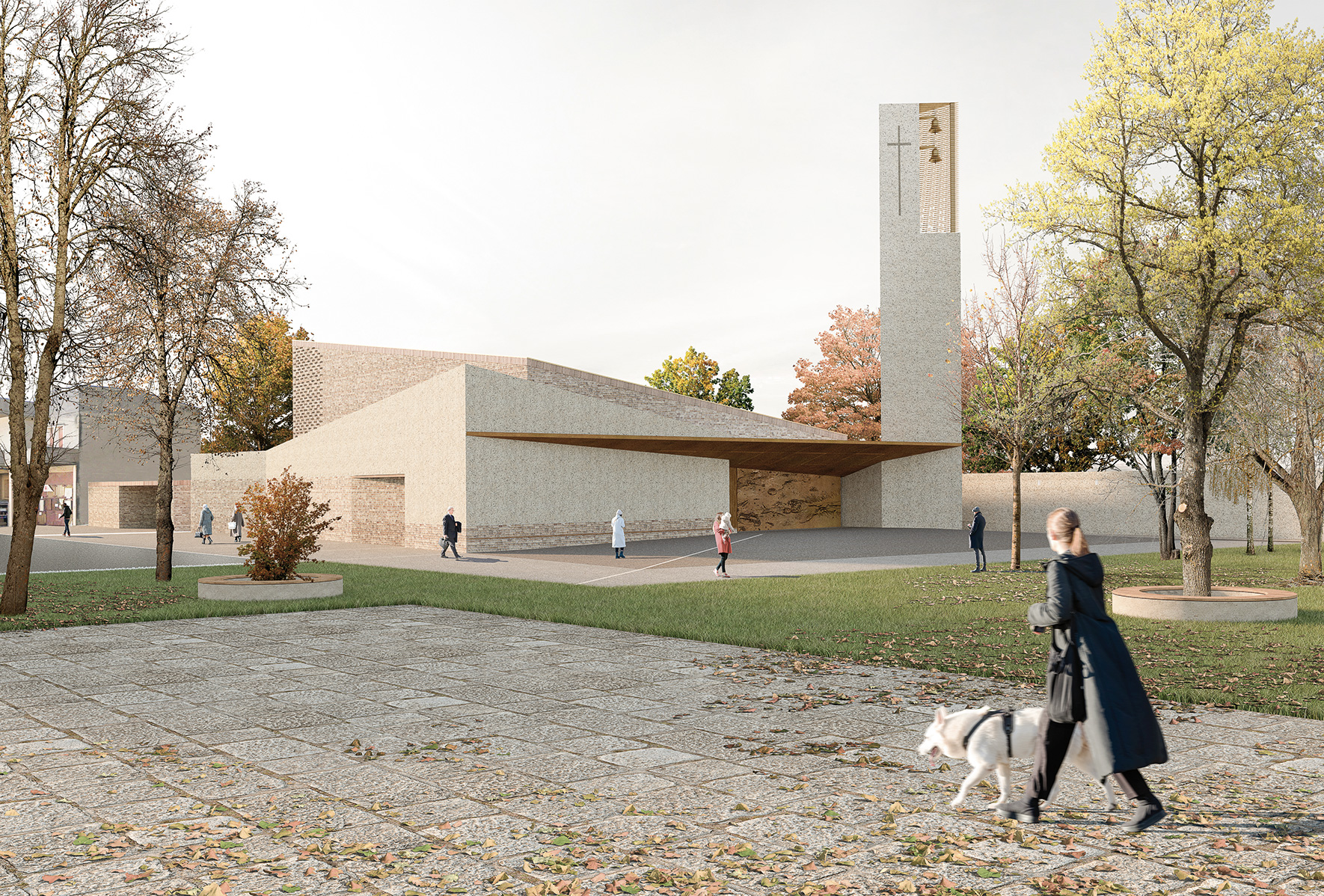 The project for the new parish church of Nogara aims to serve as an urban landmark, seamlessly integrating into the neighborhood’s fabric while opening up to the city. The new building retains the east-west orientation of the old church, positioning itself within a grid of open spaces and trees to promote urban well-being and foster new connections between the community and the environment.