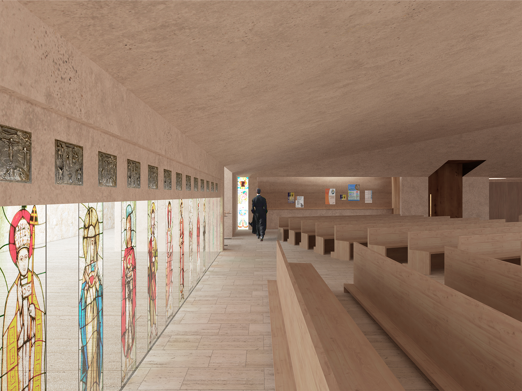 The Baptistery area is positioned separately, as in ancient churches, with the Penitentiary located nearby. Along one side of the nave, statues of the Sacred Heart and the Stations of the Cross are accompanied by a long stained-glass window depicting images of saints. The weekday chapel opens onto the nave, housing a two-sided tabernacle to accommodate different celebrations.
