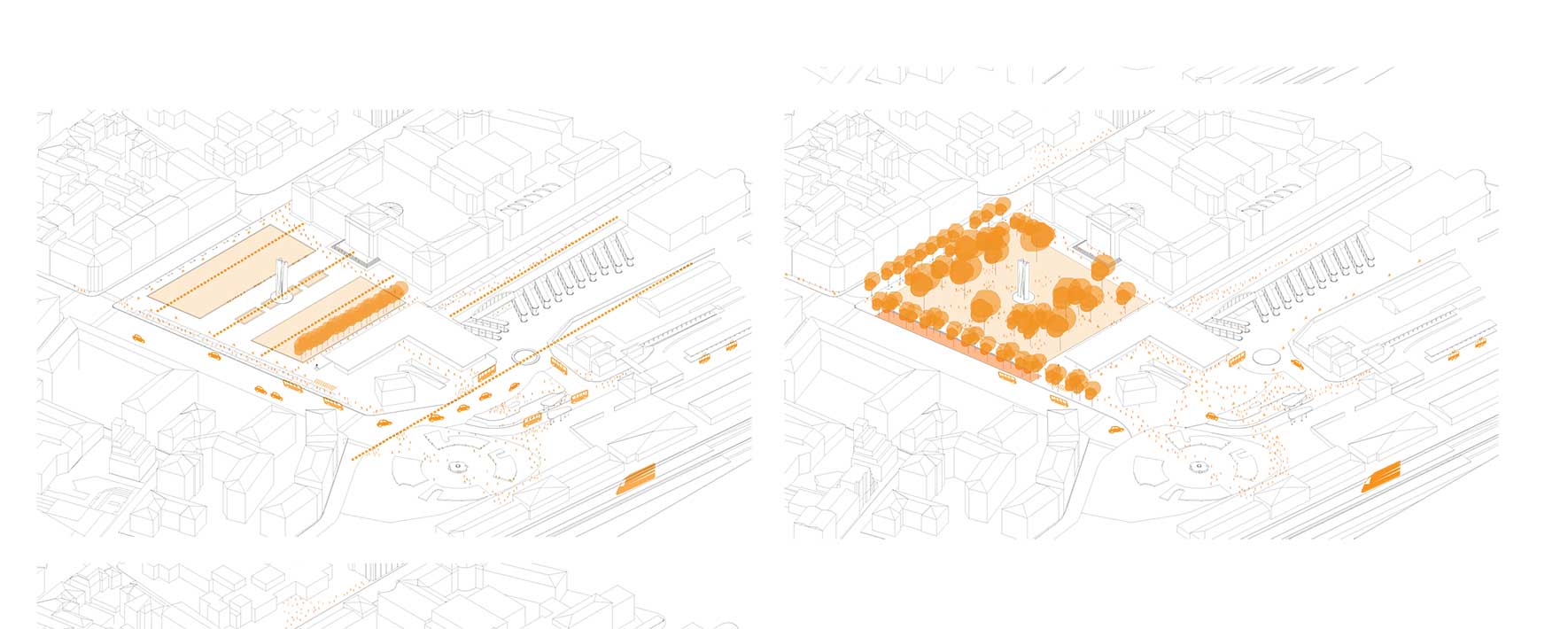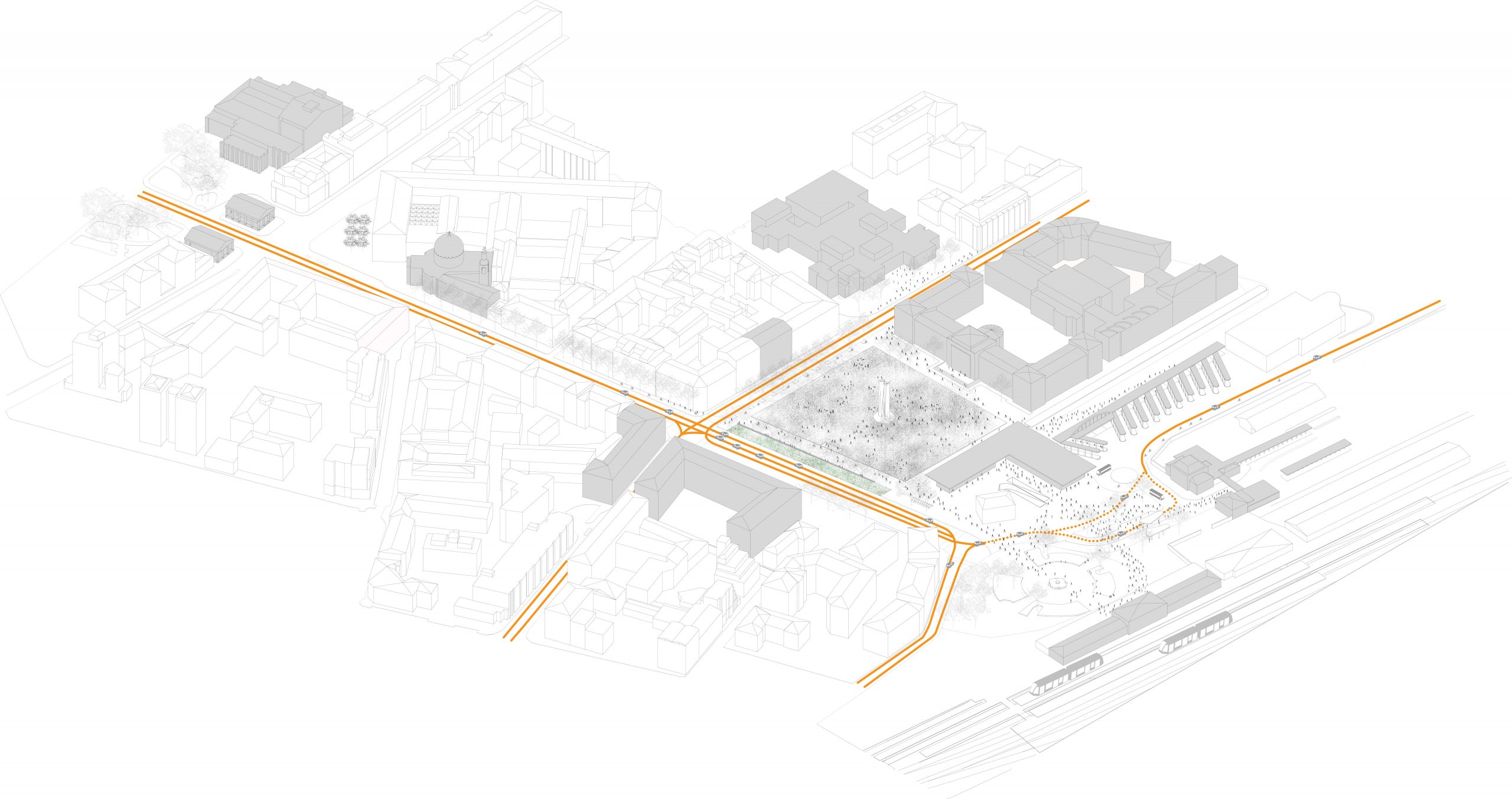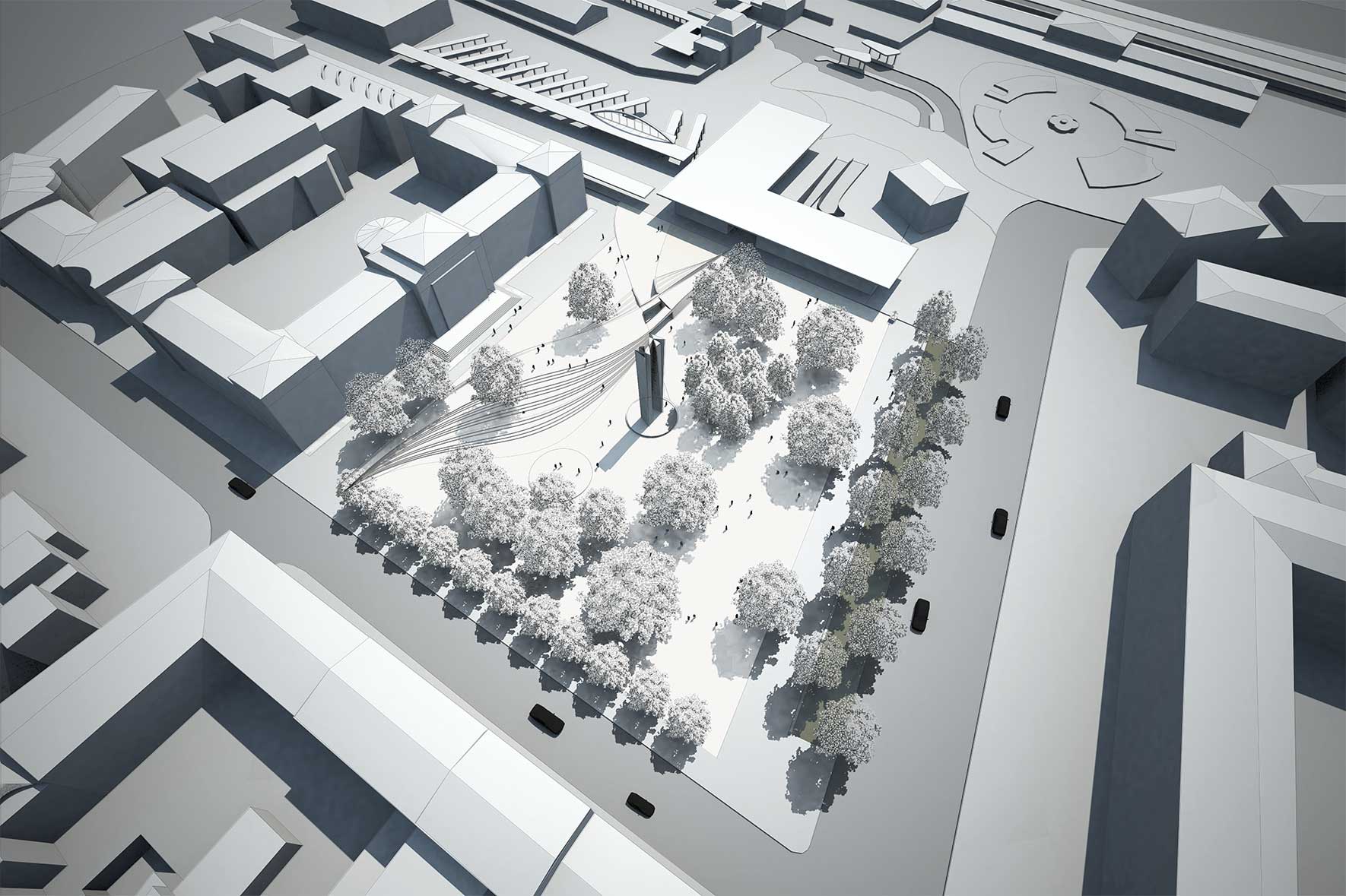 Everything, from the station exit to the city center, is designed with vehicular traffic in mind, effectively placing pedestrians in a subordinate position to vehicles. Our intention is to rethink the space as an urban square rather than a public garden. In built cities, it is no longer possible to evoke emotion with a public garden; the emotion in a free space comes from the surrounding urban landscape that interacts with it, and from the people who use it.