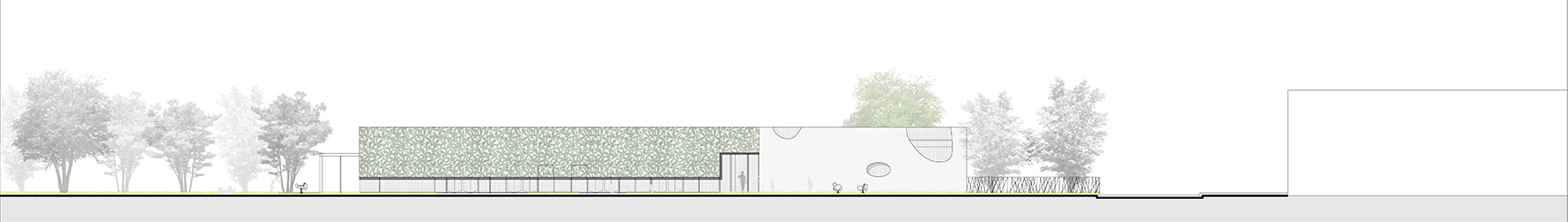 After we decided in favour of the compact and closed form, we wanted to dig a “soft” entrance element, like a “maternal womb” being the entrance to the mysterious spaceship. The generating line of this small entrance courtyard, which should obviously be curved and sinuous, would have consequently propagated its rhythm inside the school, thus conveying a feeling of warmth and welcome to the layout of the rooms.