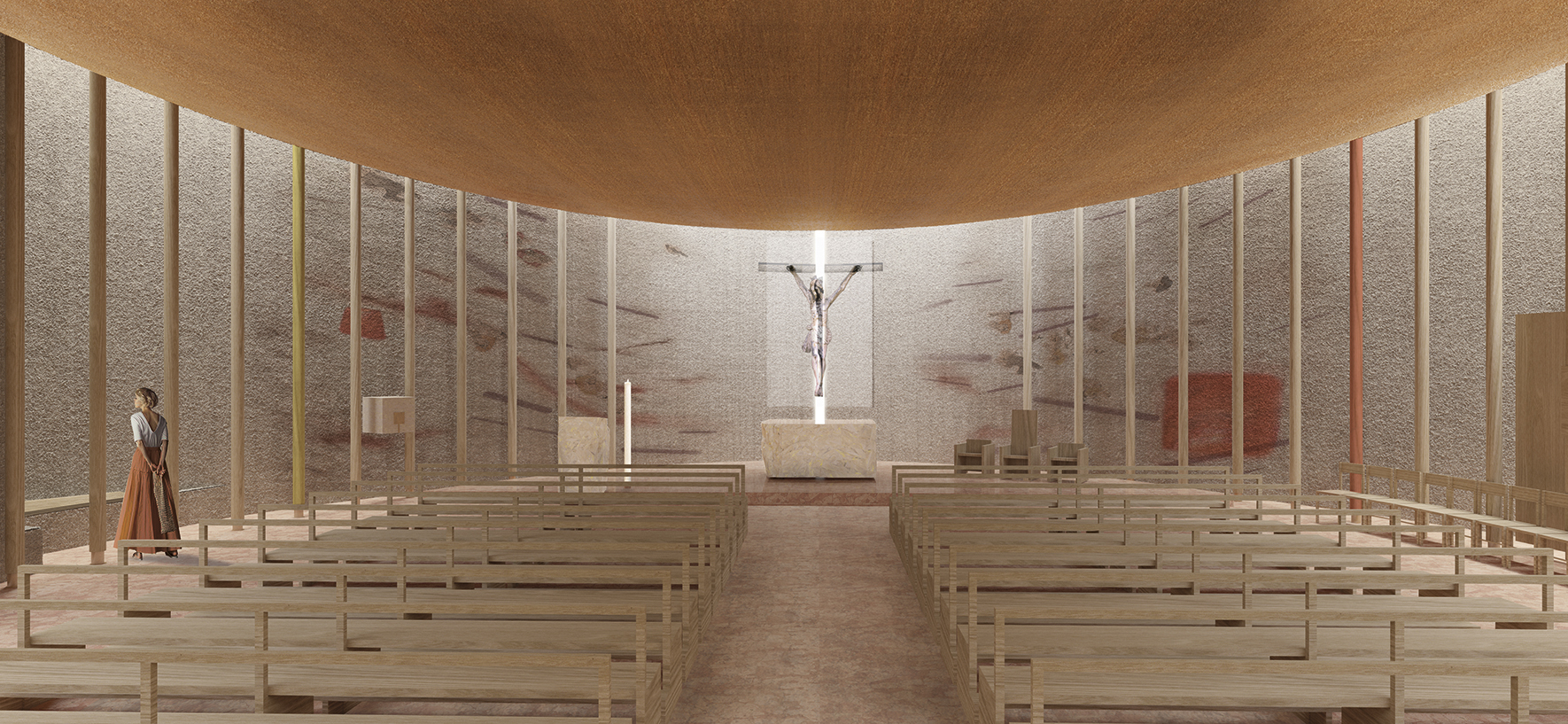 The new church, which turns away from the provincial road, serves as a central, unifying element capable of reconnecting and creating vast urban spaces immersed in greenery. Its soft, sinuous form leads us to seek and discover the entrance on the opposite side, emphasized by two beams of light.