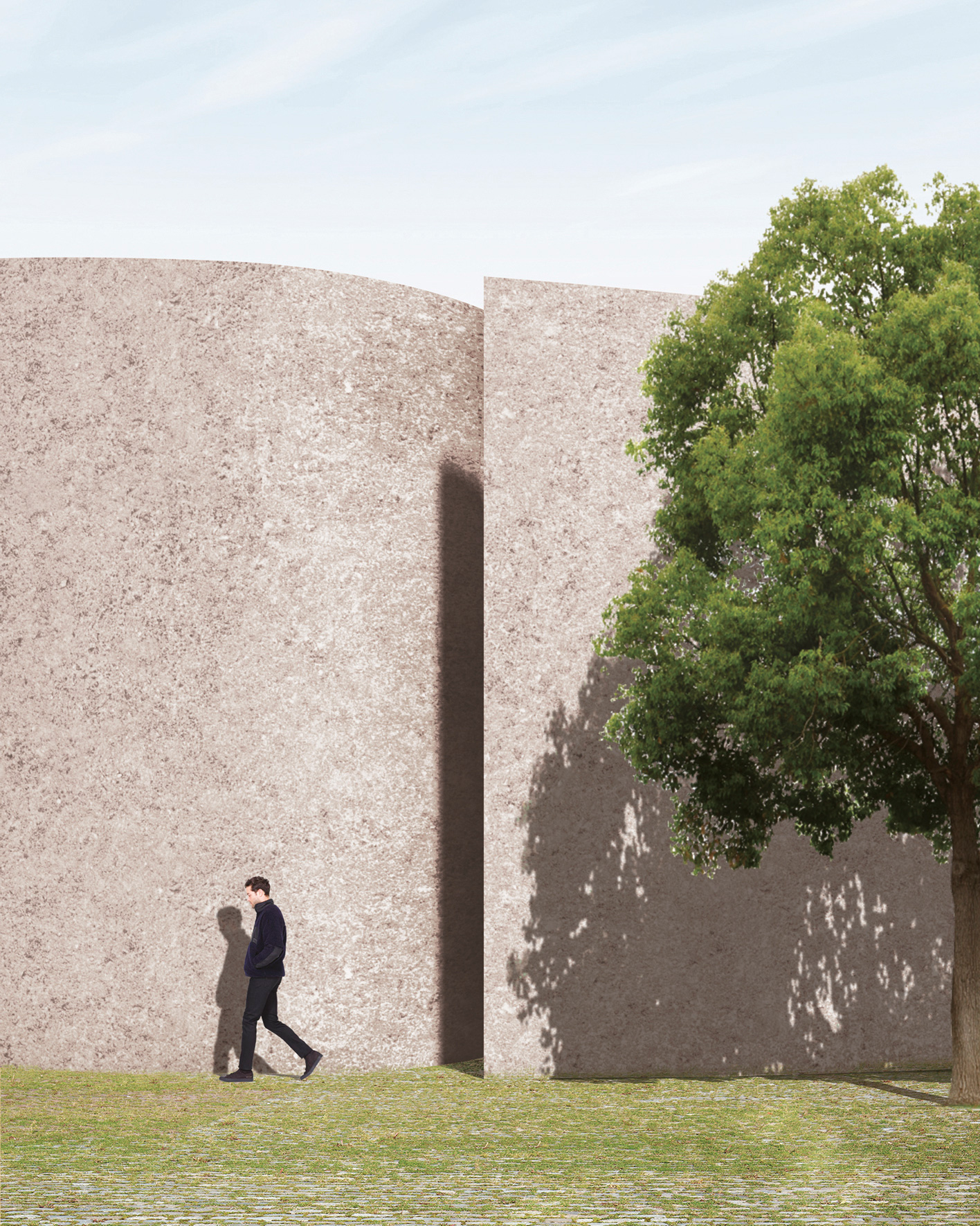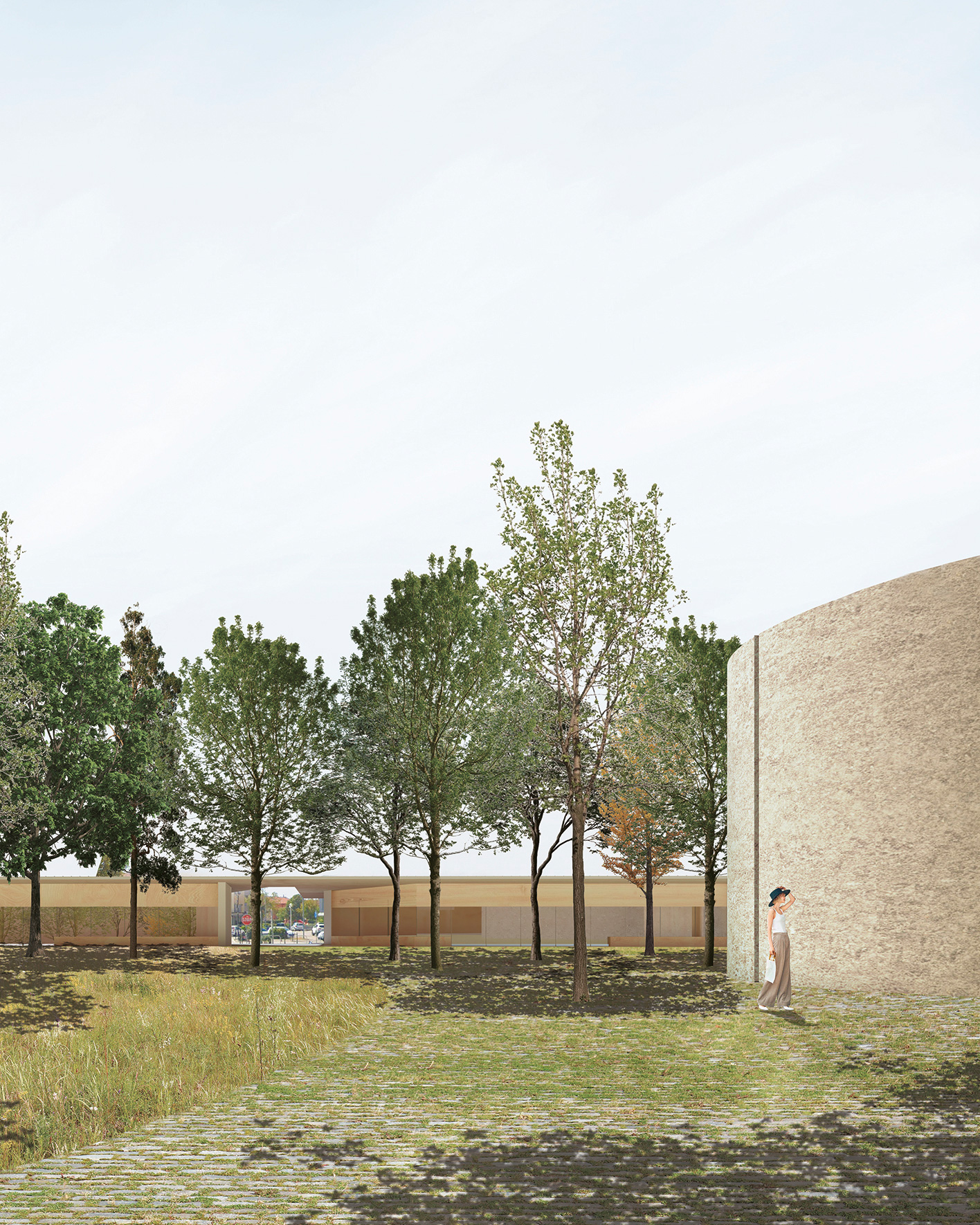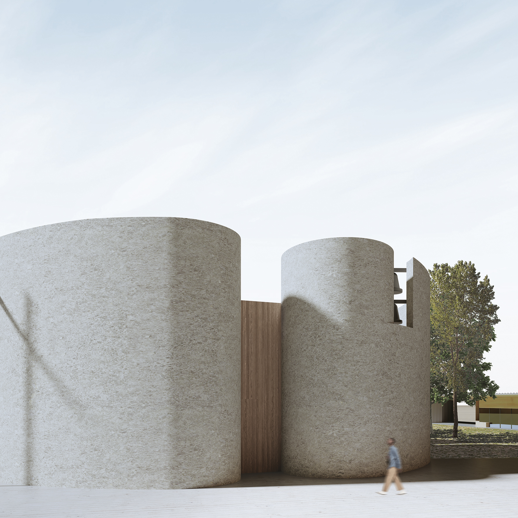 Its architecture, free from external references, is characterized by its rounded shape, absence of perimeter openings, and the strong contrast between perimeter membranes and roofing, imparting both solemnity and intimacy to it. The goal is to make it a solid urban landmark while also serving as a metaphysical abstraction amidst the complex territorial dynamics.