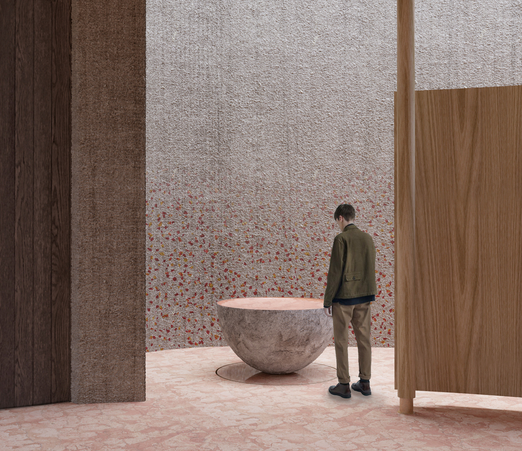 The chosen materials - raw concrete, natural elm wood, metal, and Rosso Verona Magnabosco marble - connect to the local identity, enhancing its memory and overall organic expressiveness positively.