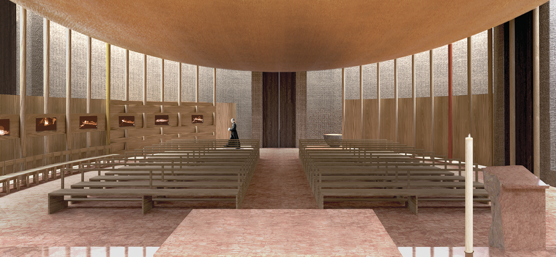 The large suspended arch inside, supported by slender pillars, gives the space a unique dimension and atmosphere. It defines the liturgical area from secondary functions, naturally enhancing the reading of sacred scriptures and the chants of the faithful.