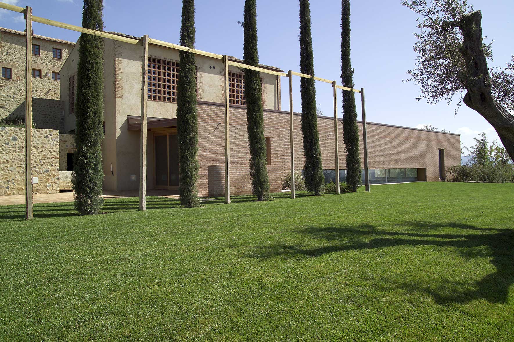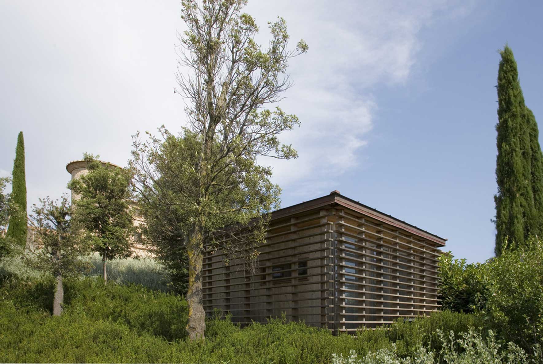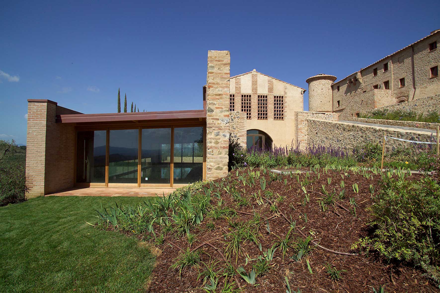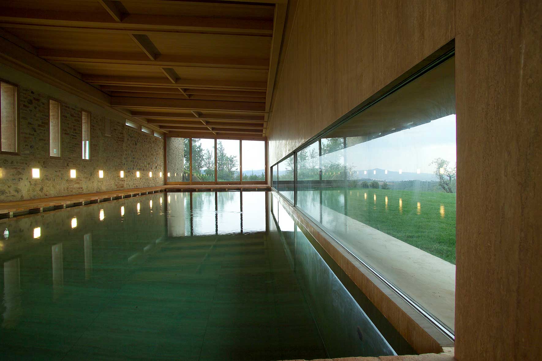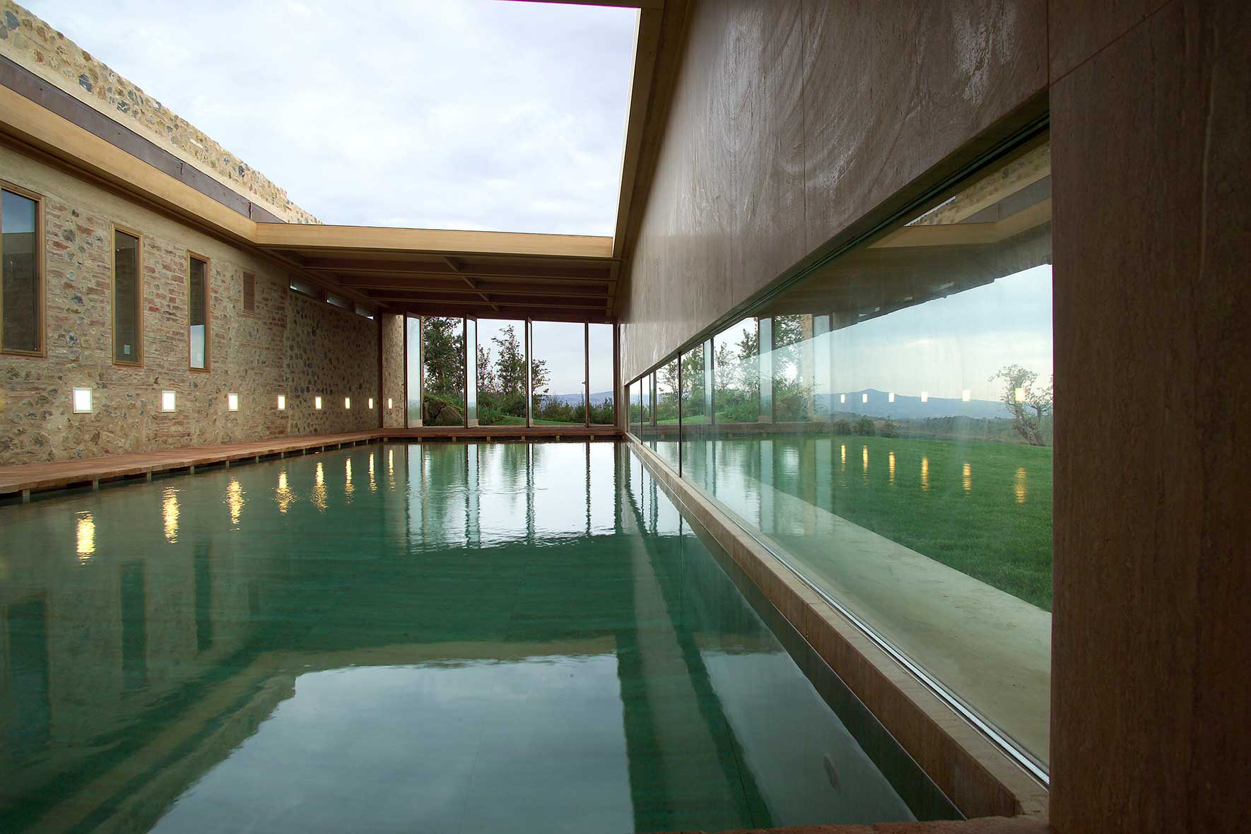 The swimming pool and the fitness area of the castle Colle Massari have been created by making some changes, including technological changes, to a recently added shelter for sheep.