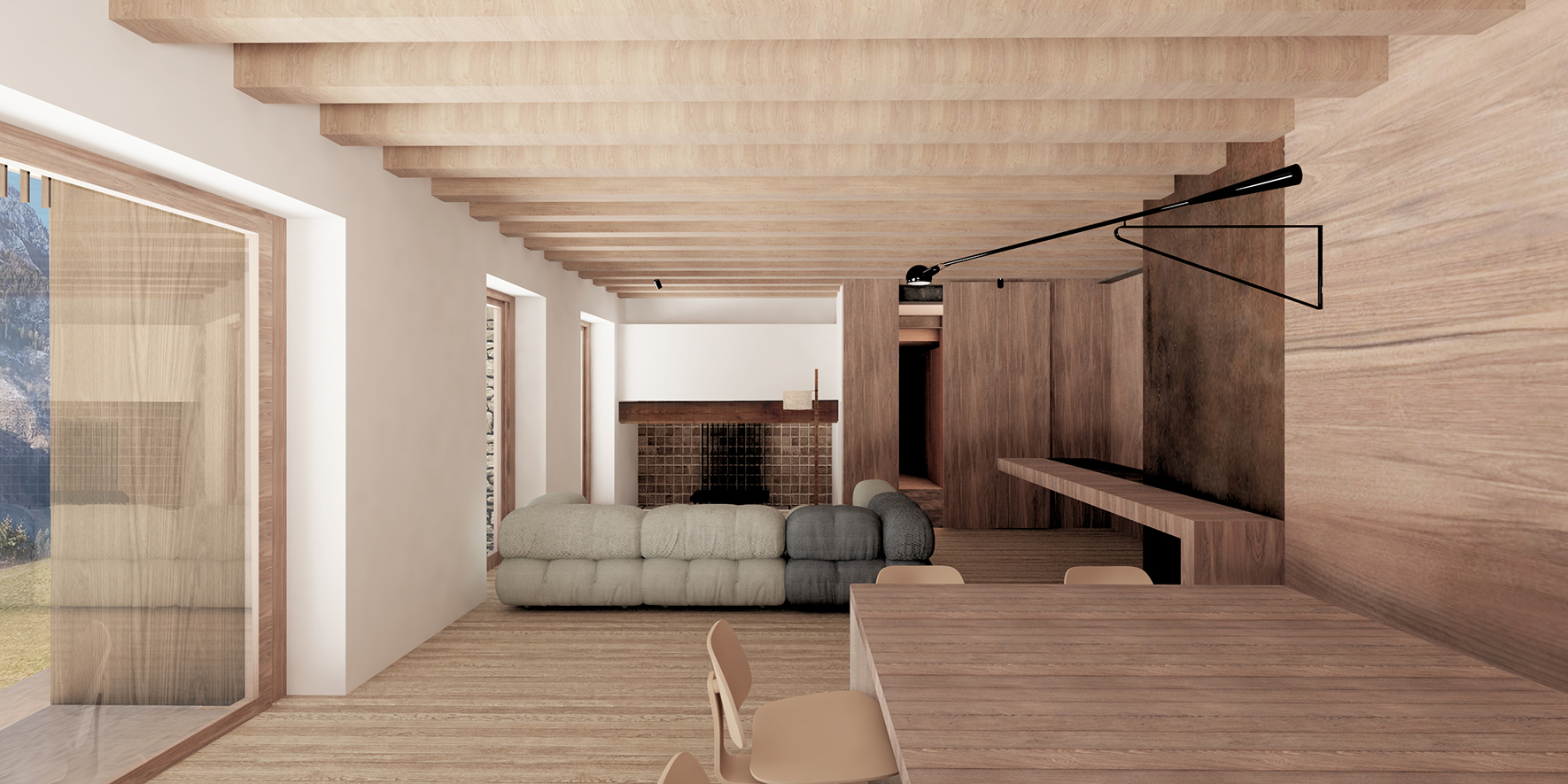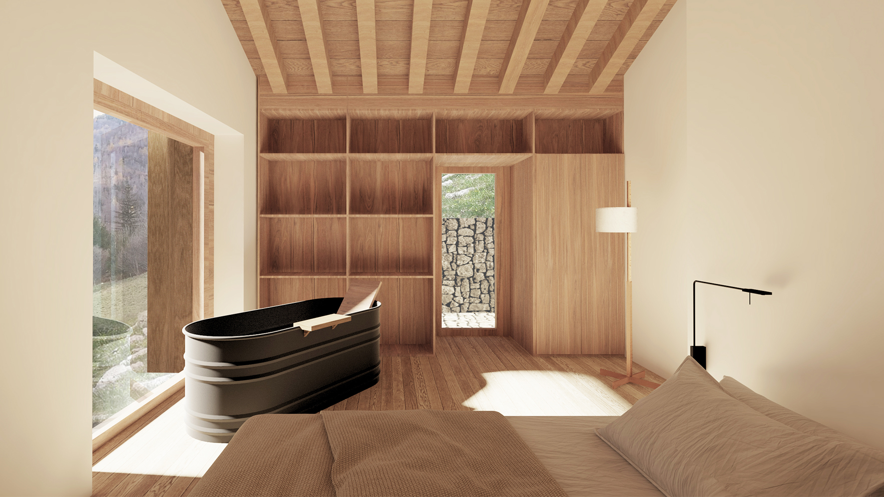 The design emphasizes sustainability and simplicity, prioritizing natural materials and a layout conceived for relaxation and contemplation. Every detail is thoughtfully crafted to strike a balance between domestic intimacy and immersion in the untouched beauty of the alpine environment.