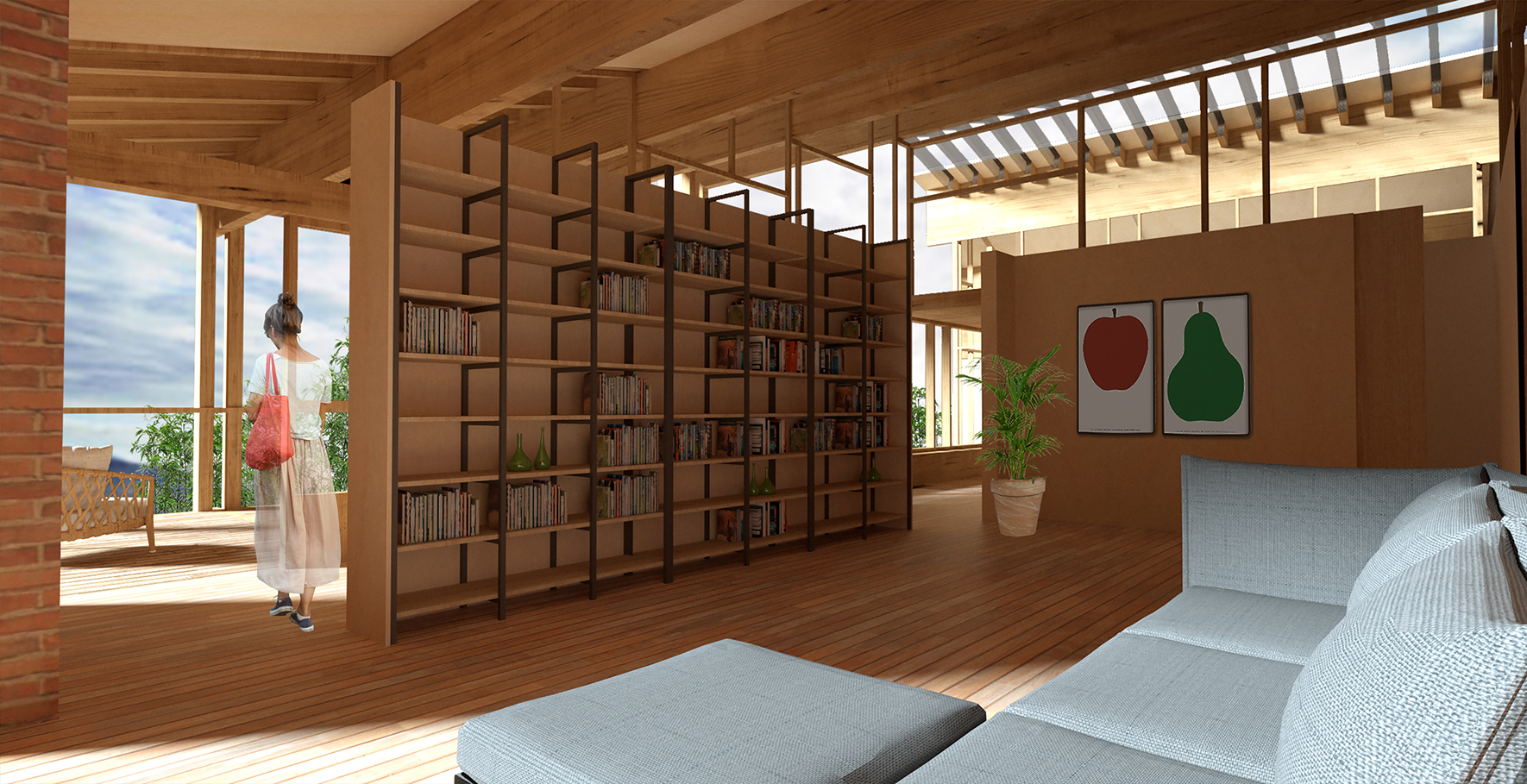 The building consists of two independent volumes connected by a central shared courtyard and a first-floor walkway. The southern building houses a large dining room with a communal kitchen on the ground floor, a relaxation area with a fireplace, and a bathroom. The three bedrooms with private bathrooms are on the first floor. In the northern volume, there is a bedroom with a bathroom and private lounge on the ground floor and a library on the upper floor.
