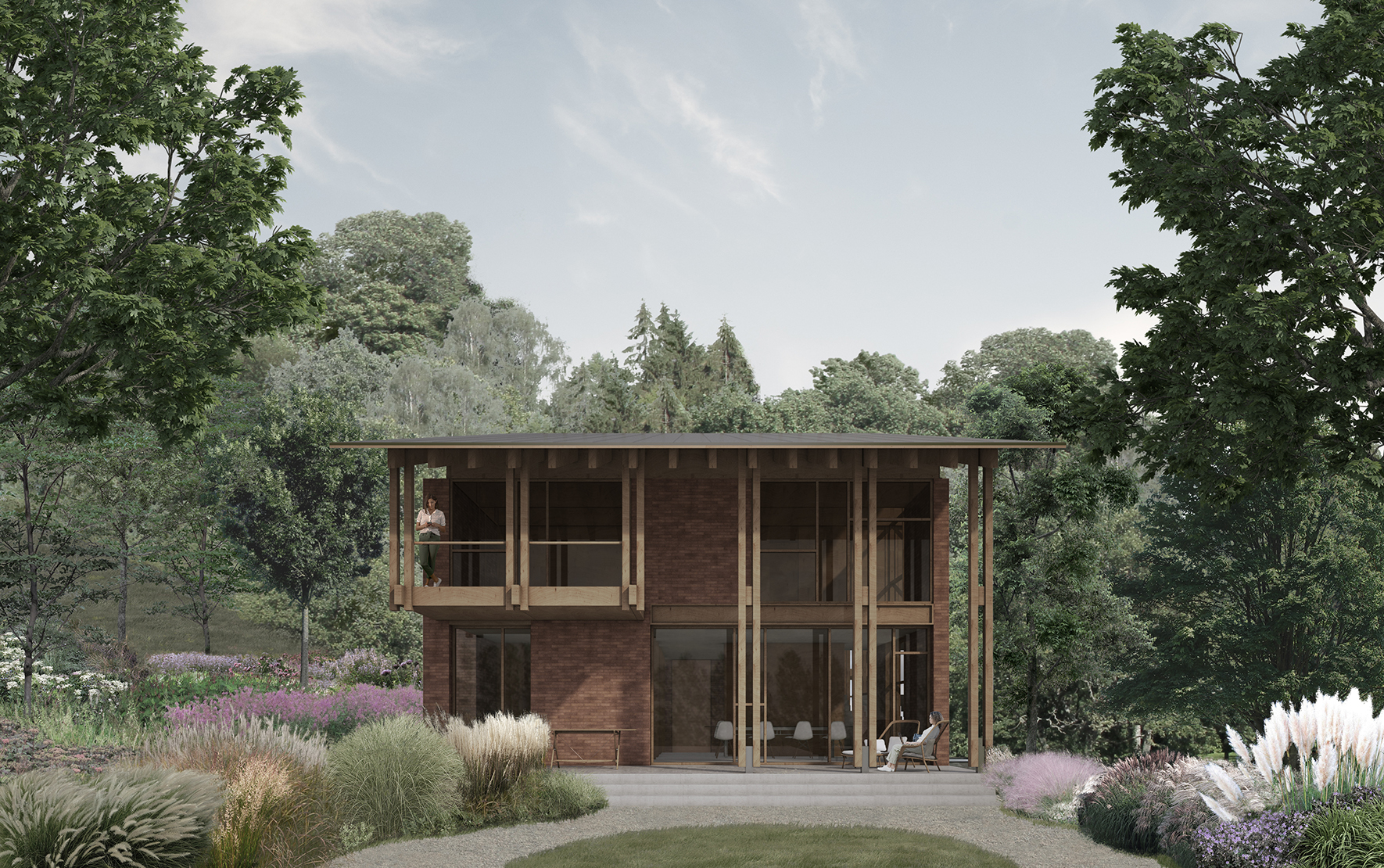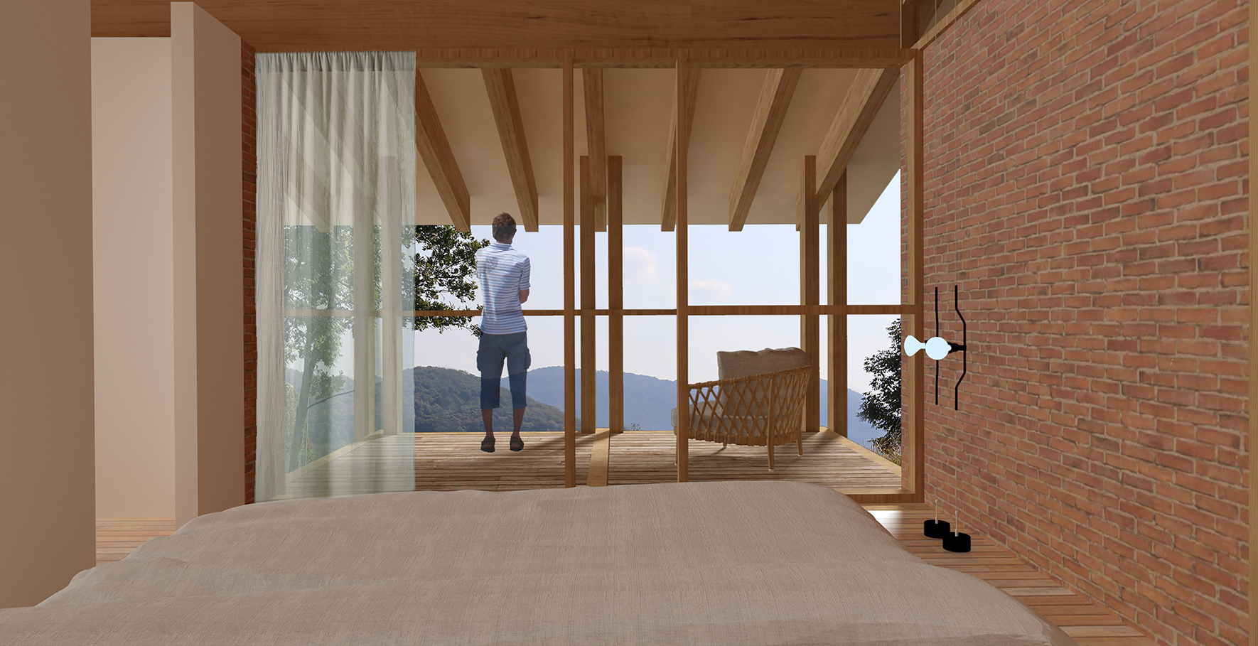 A building that seeks a unique connection with the surrounding nature while respecting the tall trees in the area, establishing a strong relationship with the foothill context. The contrast between the interior and exterior is made evident by the expansive glass panels, shielded only where necessary, and the slender paired wooden columns supporting the eaves, creating empty volumes of shade.