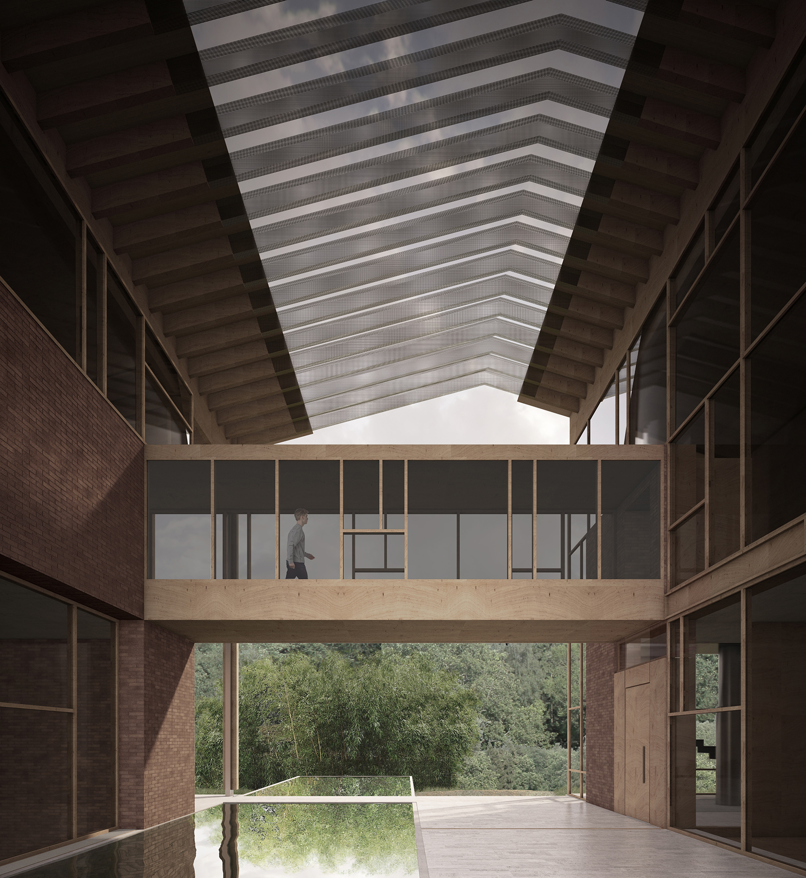 The load-bearing structure is entirely concealed within the two building bodies, leaving the roof's overhang exposed. The slender roofs of the two bodies converge above the central courtyard, bridged by false-trusses made of perforated sheet metal, serving as sunscreens while allowing ventilation in the courtyard, which is partly paved and partly left as green space.