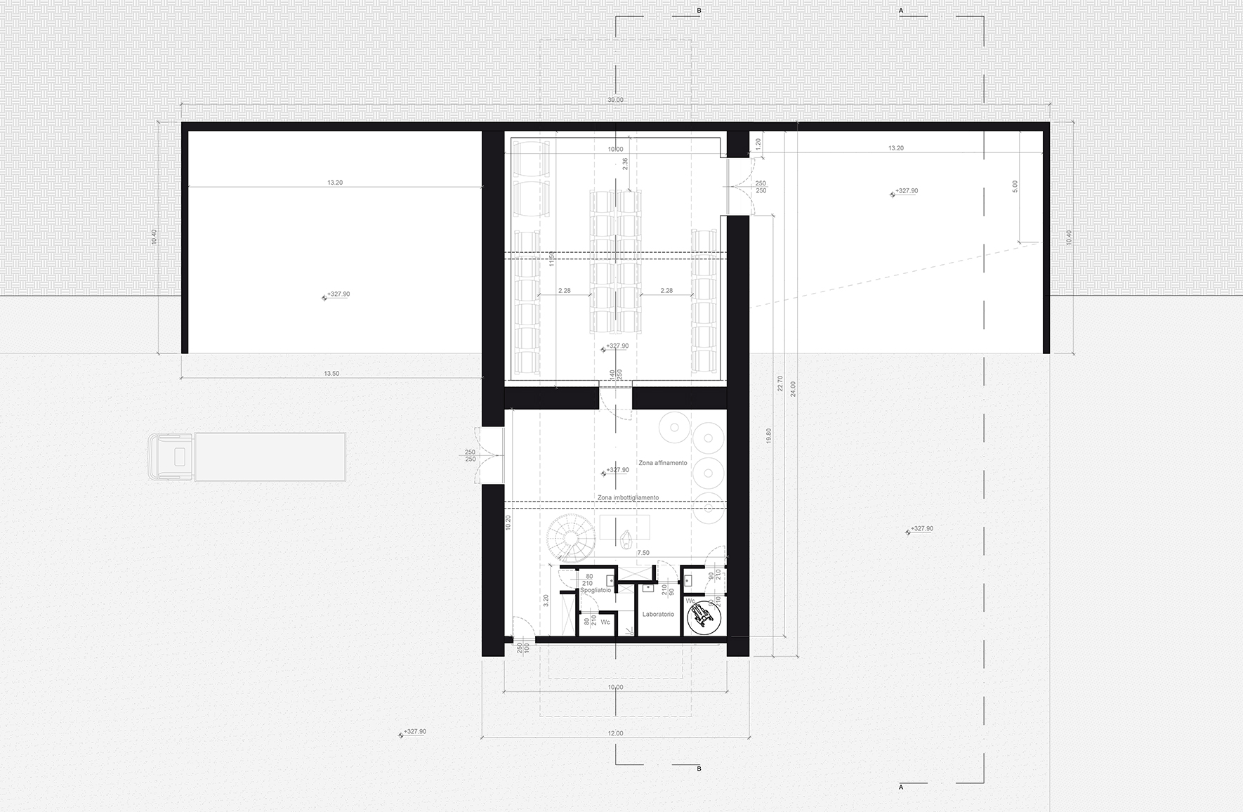 The building is embedded into the hillside, taking advantage of the site's natural elevation changes to optimize production processes: grape delivery occurs from above by gravity, while the lower levels house barrique aging rooms, naturally cooled thanks to the partially buried structure.