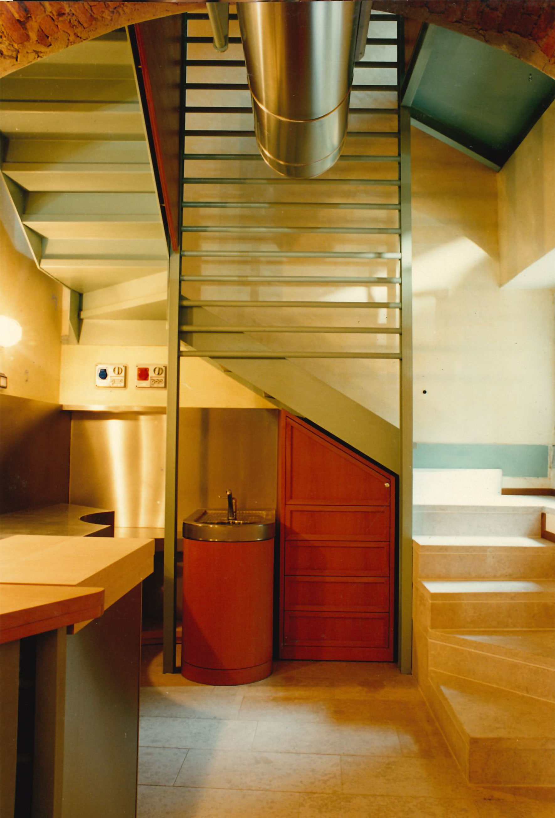 A delicatessen and grocer’s shop in the centre of Bergamo. I wanted to make its architectural forms and materials look like “edible” to the eye. No synthetic materials were used: wood in its natural state, crushed and waxed marble dust plaster, and worn and patinated Istrian stone. All the furniture, the installations and systems in full view, and the workbenches were custom-made.