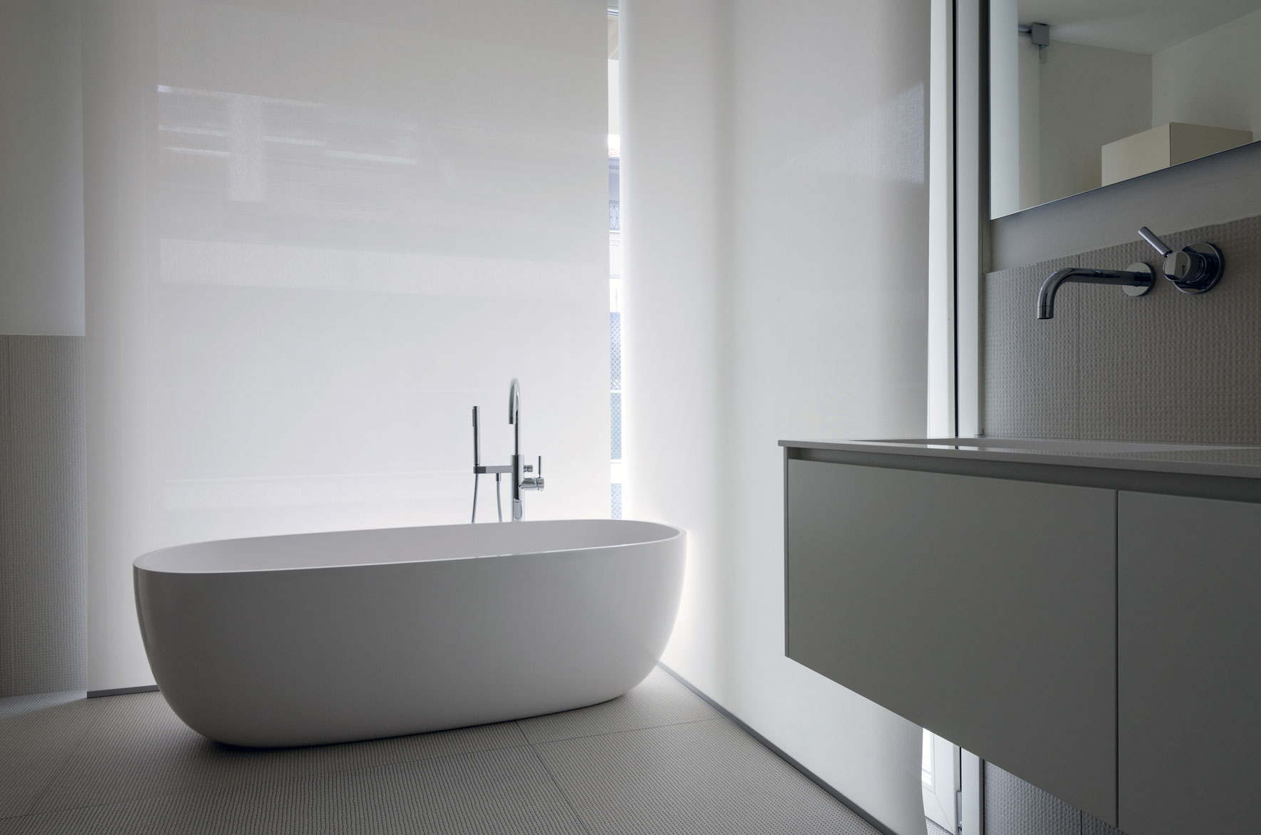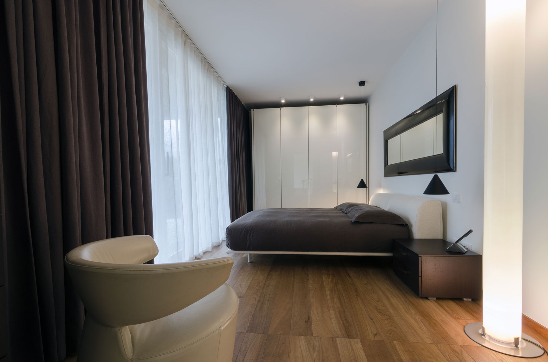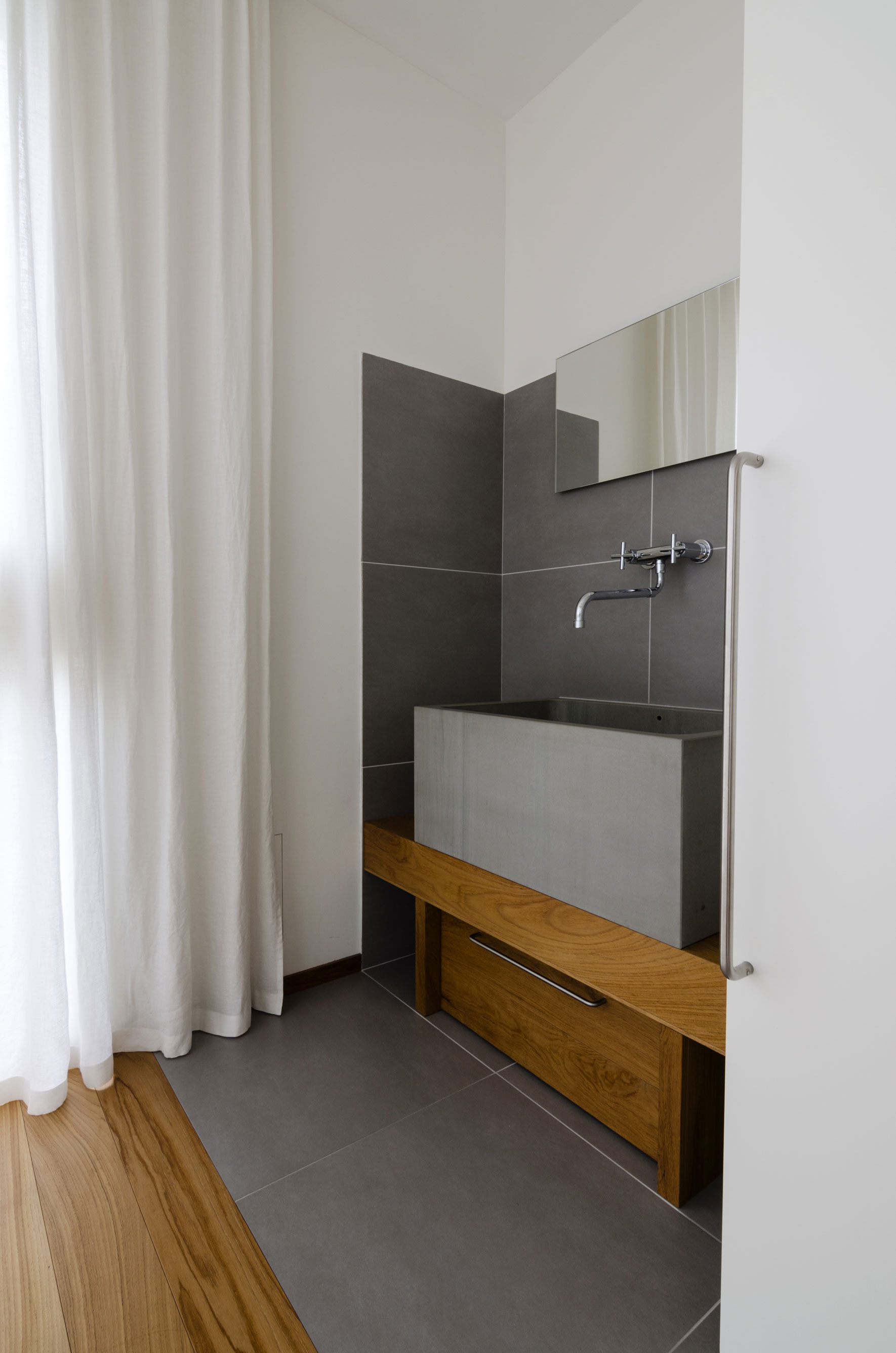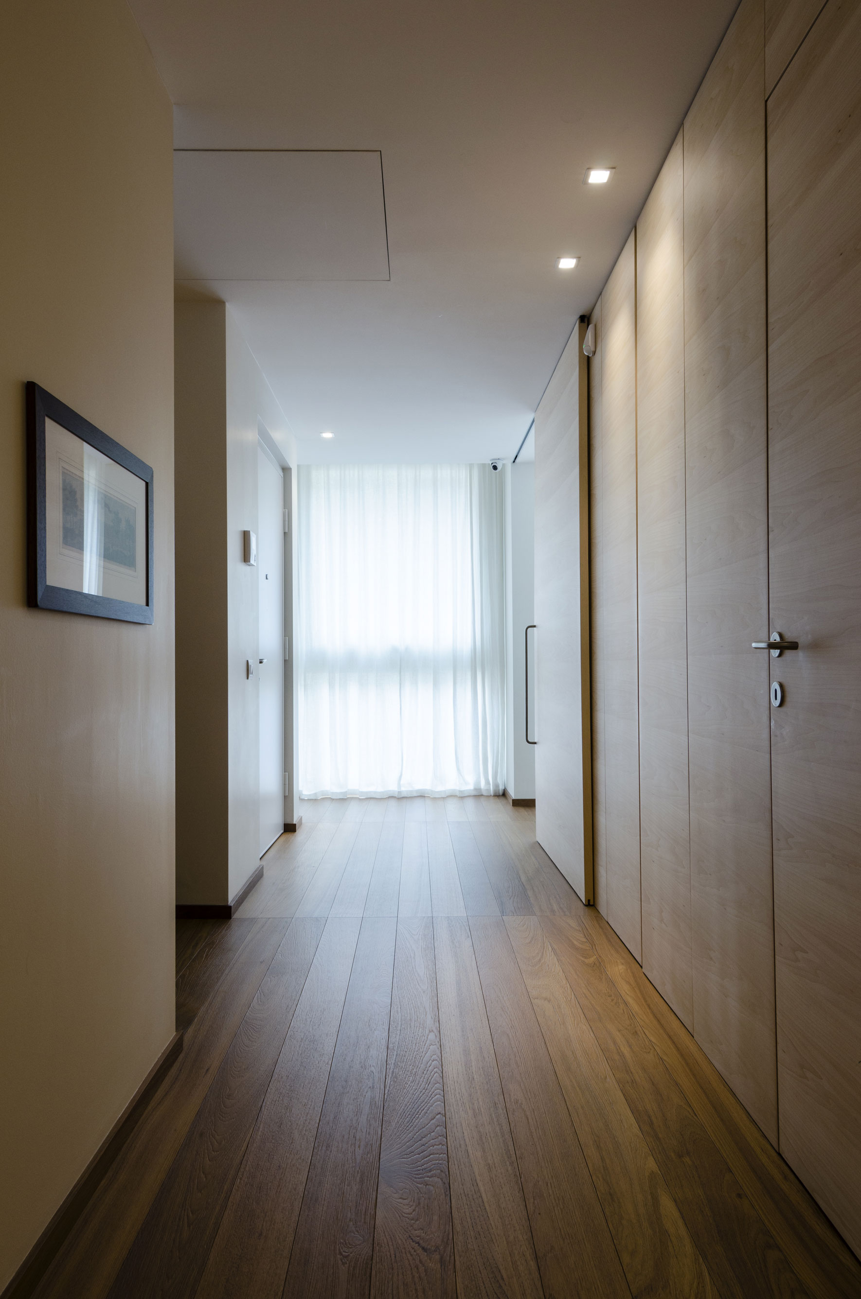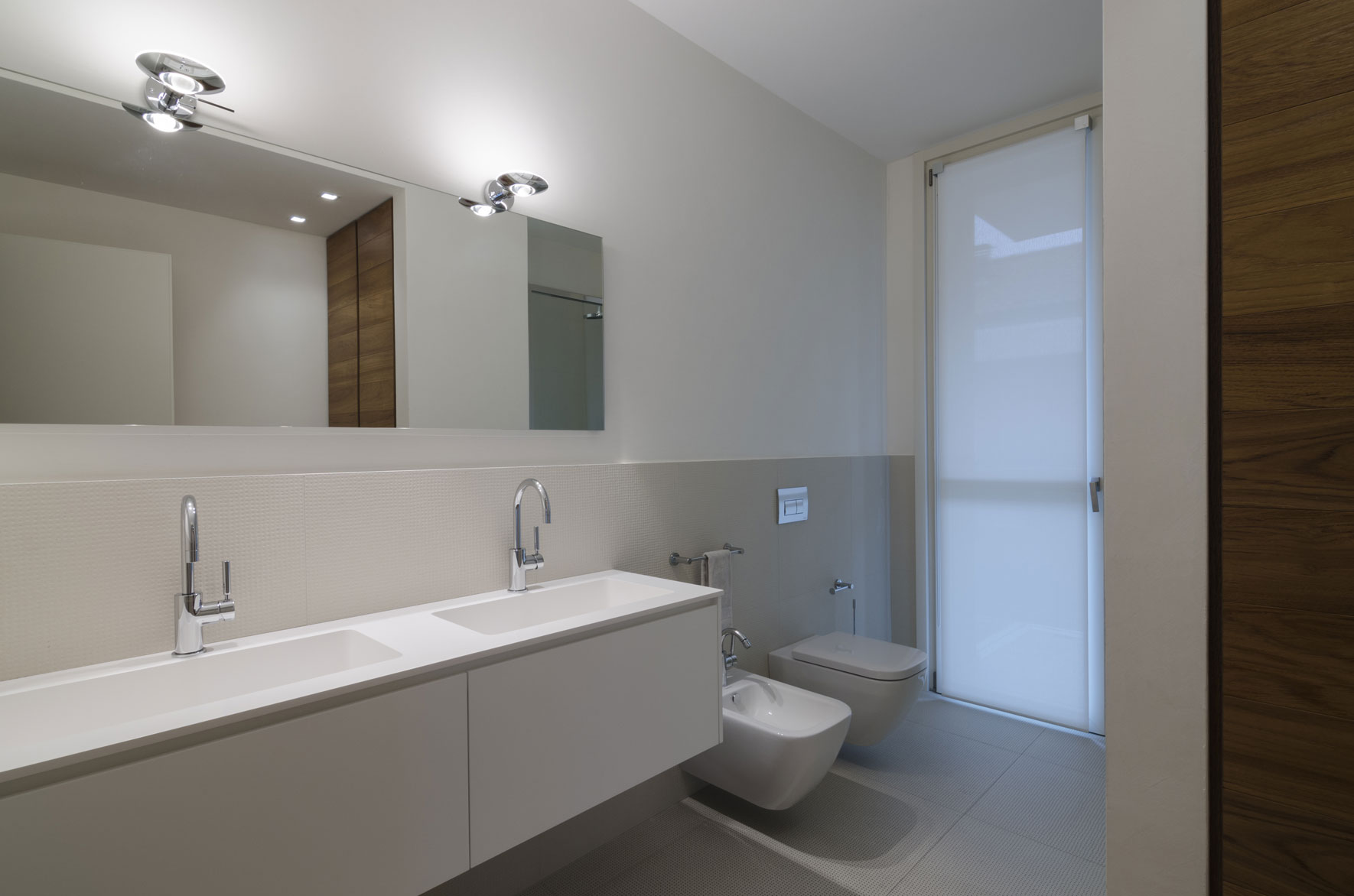 A two-storey apartment on the highest floor of a new building in one of the most prestigious streets of lower Bergamo overlooking the Upper City. The indoor solution involves dividing the apartment into shared and private spaces in close dialogue with the many outside facings. The custom-designed furnishings and the varied textures of the teak wood flooring create paths and the alternation of full and empty spaces. Large ceramics have been used only in the bathrooms.