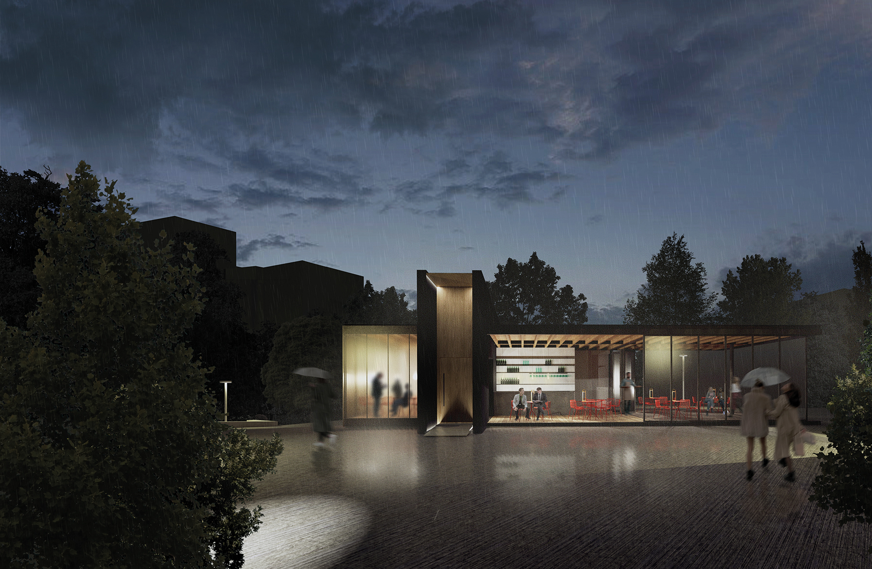 A new building dedicated to refreshments inside the main courtyard of the Gallery of Modern and Contemporary Art in Bergamo. A light building, just leaning against the ground, capable of connecting, and at the same time separating, the more urban part of the GAMeC courtyard with the more naturalistic part near the Roggia Nuova and towards the green area of the Suardi Park.