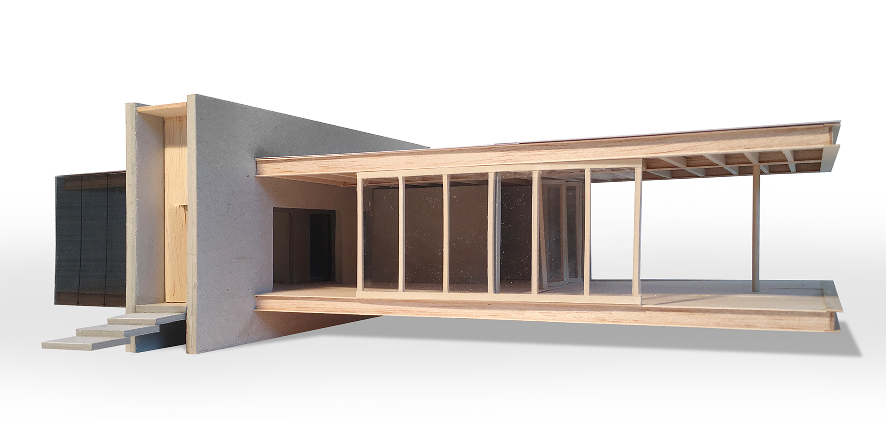 Two partitions that identify the access to the bar - coupled as a single pillar in exposed dark concrete colored in a dark gray-colored paste and texturized by a slight visible imprint left by the formwork covered in nylon sheet - are the only part rooted in ground and support the two dry-mounted wings that counterbalance each other by barely touching the ground.