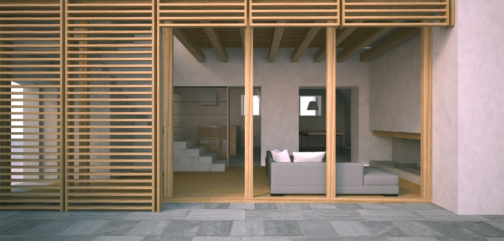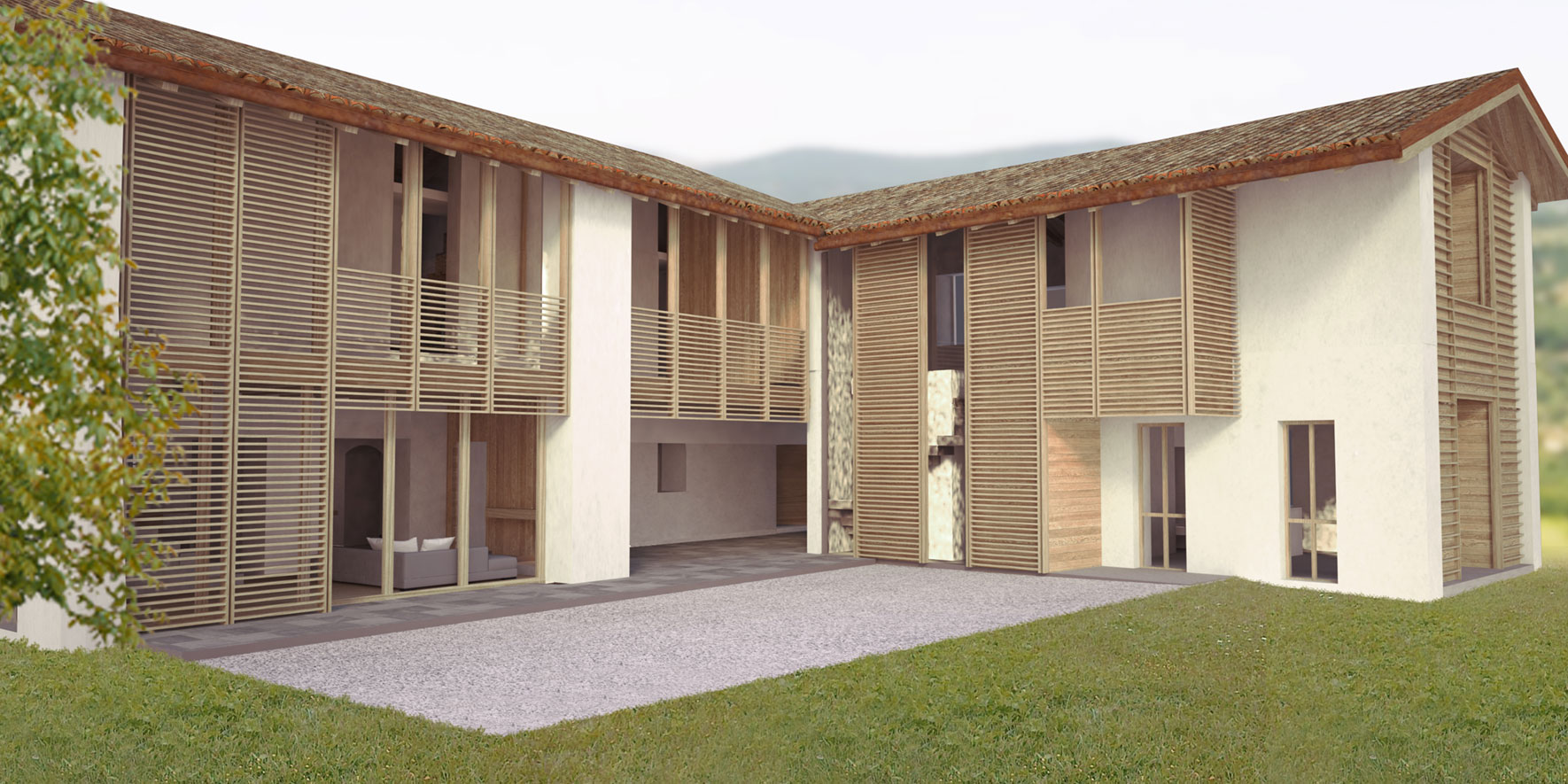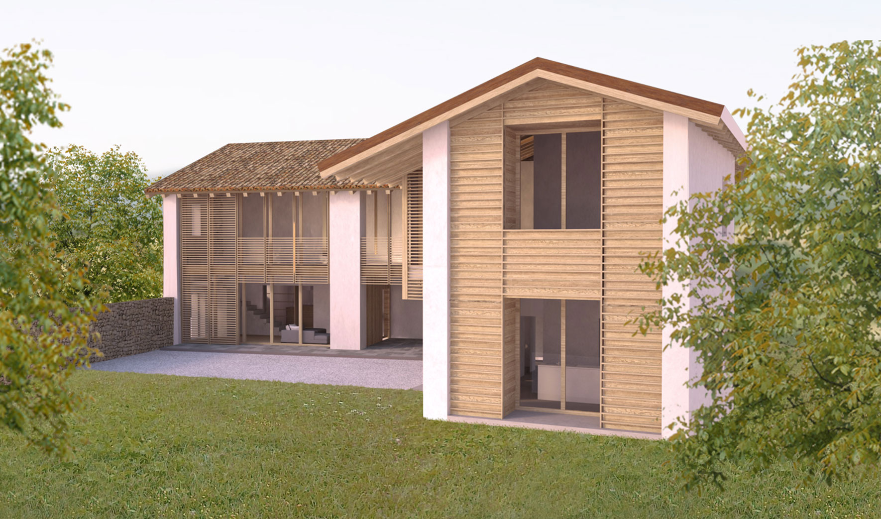 This renovation project is about a two-storey farmhouse for residential and agricultural use dating back to before 1808. The building, which is very simple and has poor finishes, is divided into two units on the ground floor that merge on the first floor and are connected by a loggia with a wooden floor. The aim of the project is to reuse the building for residential purposes, by adapting it to current needs and keeping the typological, distributive and constructive characteristics of the original building and to improve the overall quality while complying with the specific regulations that apply on the building and its context.