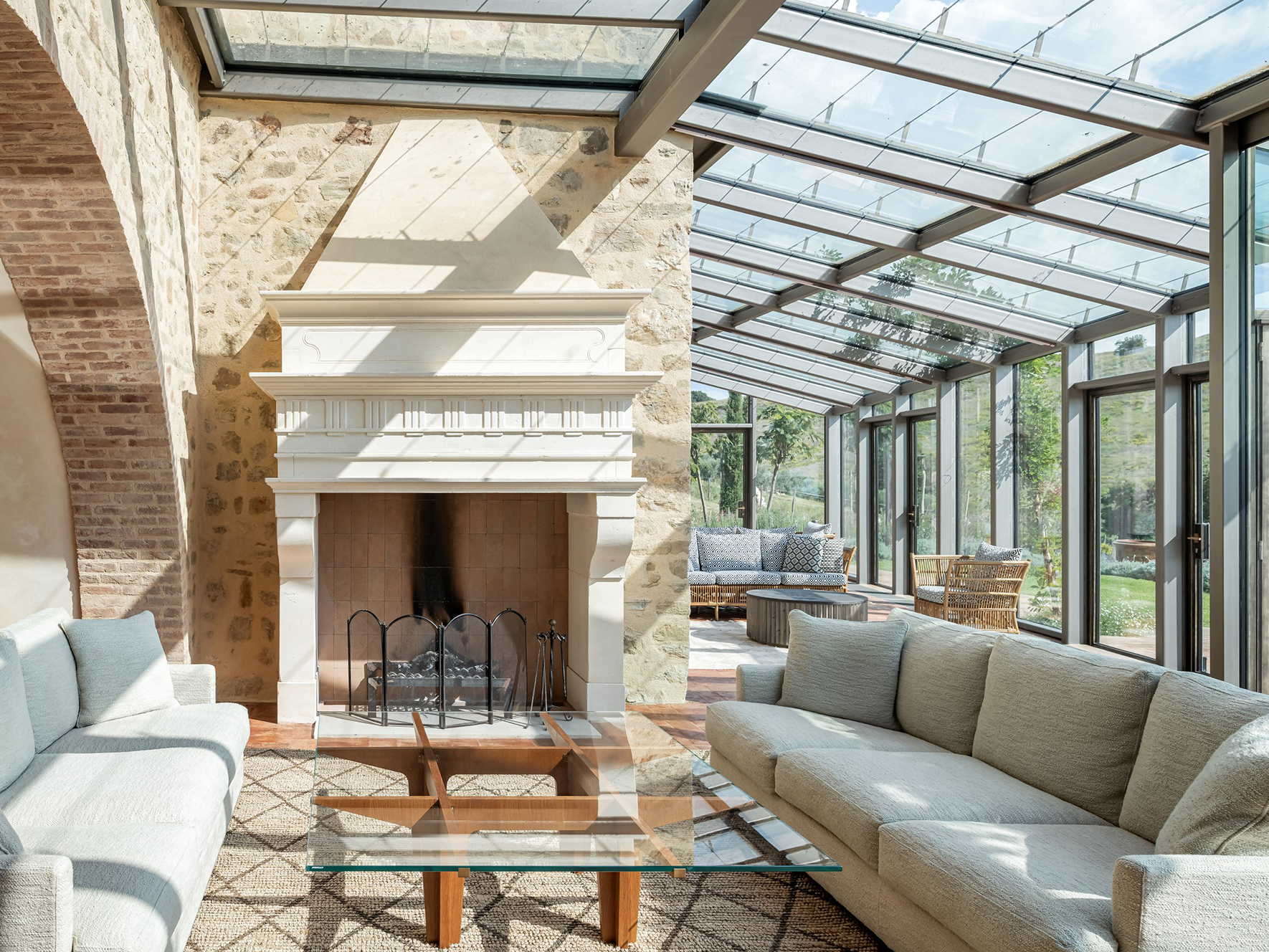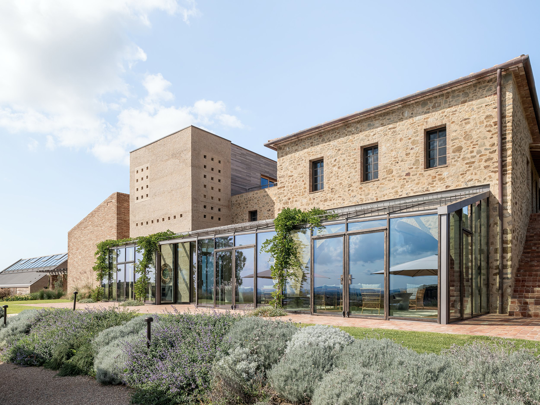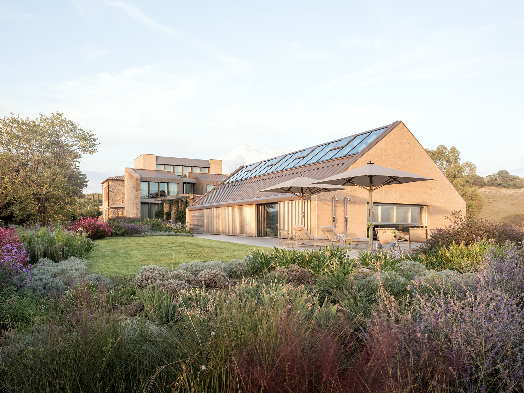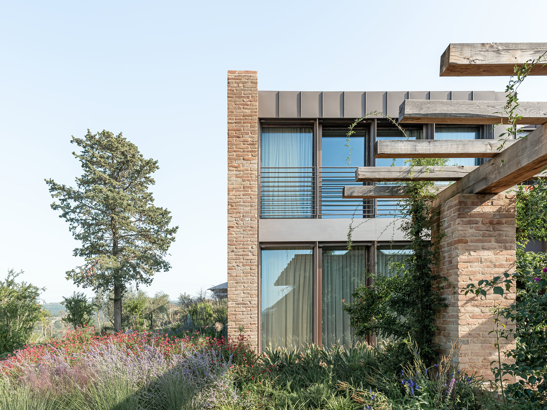 The new configuration shapes a discreet skyline of pitched roofs and terraces that converse with the horizon, while light—never showcased—sculpts surfaces designed to shift throughout the day and across the seasons. Three materials define the project’s essential grammar: local stone, reclaimed brick, and exposed concrete tinted in the mass. Together, they reinterpret the rural building tradition in a contemporary key without falling into imitation.