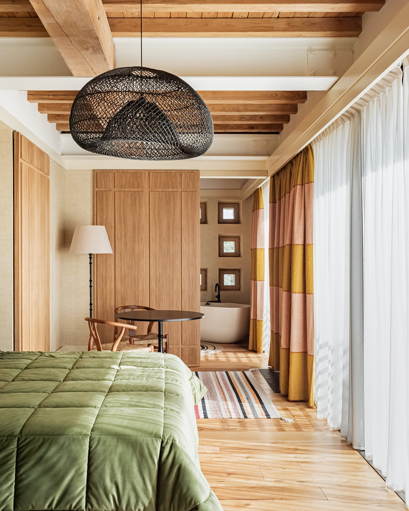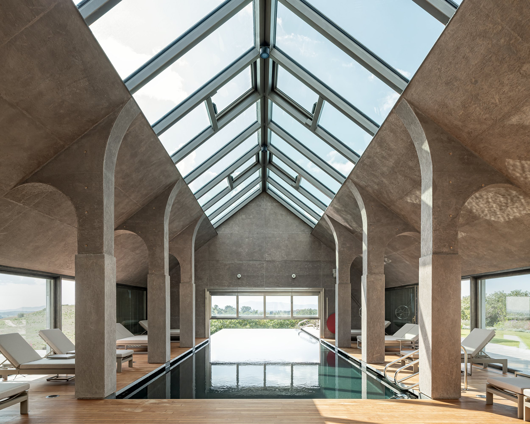 Calibrated openings, recessed frames, and filtered outdoor spaces create a continuous relationship between interior and exterior. A vegetated pergola positioned between the two main buildings becomes a threshold, a garden, and a place of pause. Even the indoor pool—inserted within the former stable and shaped by a double-curved concrete shell—works with zenithal light and natural ventilation to function passively.