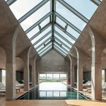 Calibrated openings, recessed frames, and filtered outdoor spaces create a continuous relationship between interior and exterior. A vegetated pergola positioned between the two main buildings becomes a threshold, a garden, and a place of pause. Even the indoor pool—inserted within the former stable and shaped by a double-curved concrete shell—works with zenithal light and natural ventilation to function passively.