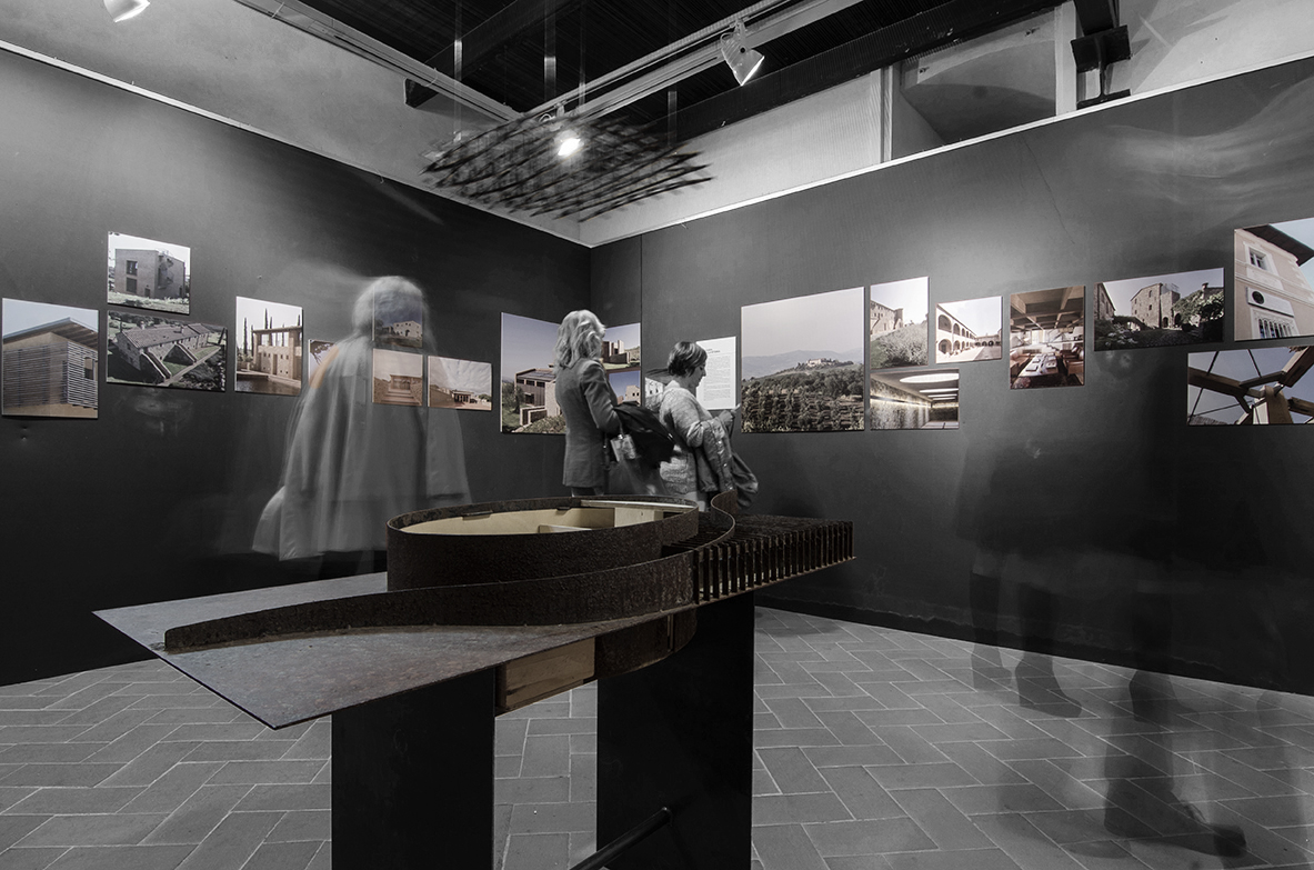 Many of the works exhibited (contained in the PRUSST - Urban Recovery and Sustainable Development Program on the Territory, drawn up in 1999 on behalf of the Municipality of Cinigiano and awarded by the Ministry of the Interior with funding from the European Community) highlight a system of collaboration between the public and private, where only the project, sustainable in all its aspects, urban, economic and environmental, is the guarantor of the interests of both figures, through strategic territorial marketing planning and a close relationship between infrastructure and transformation of the territory.
