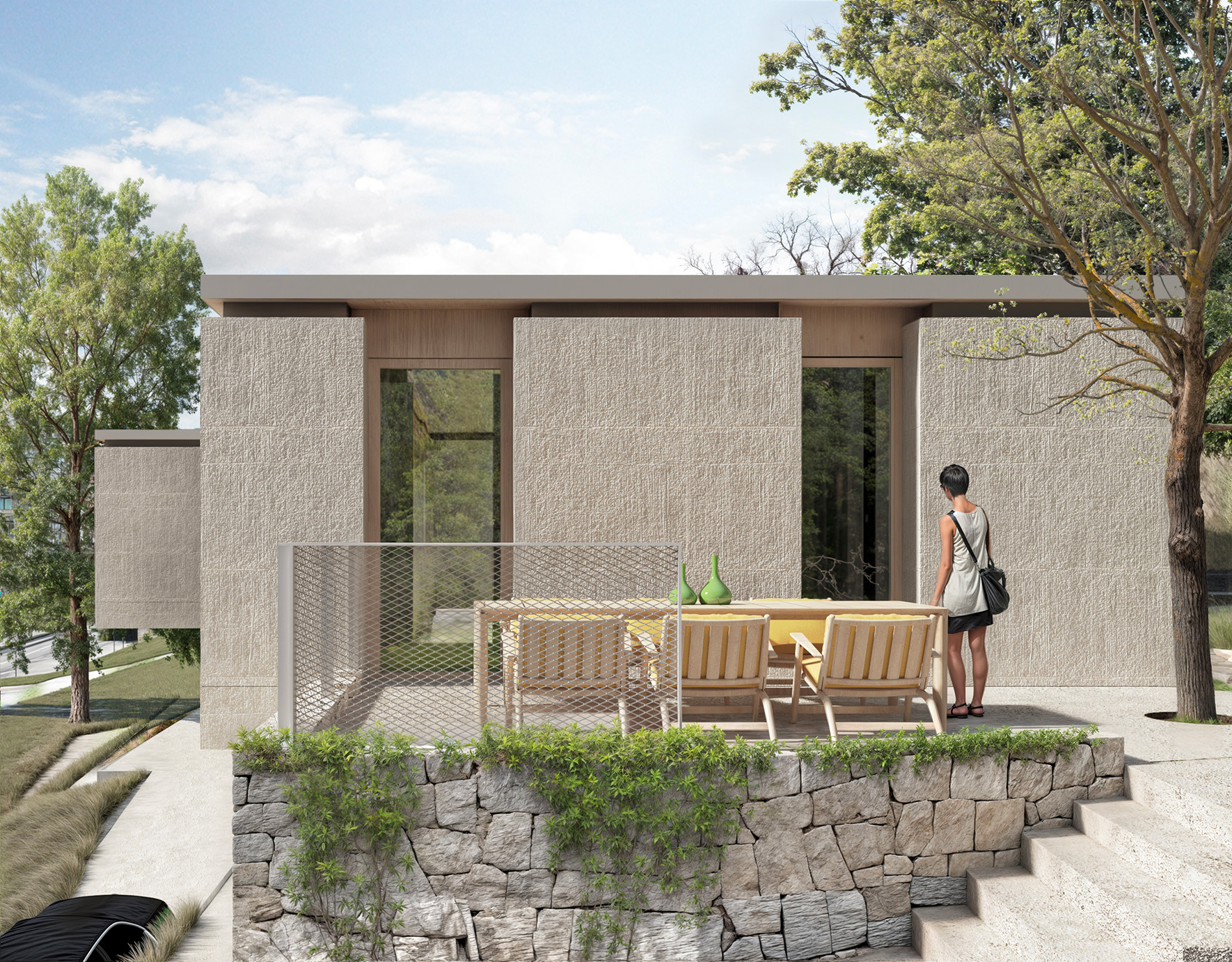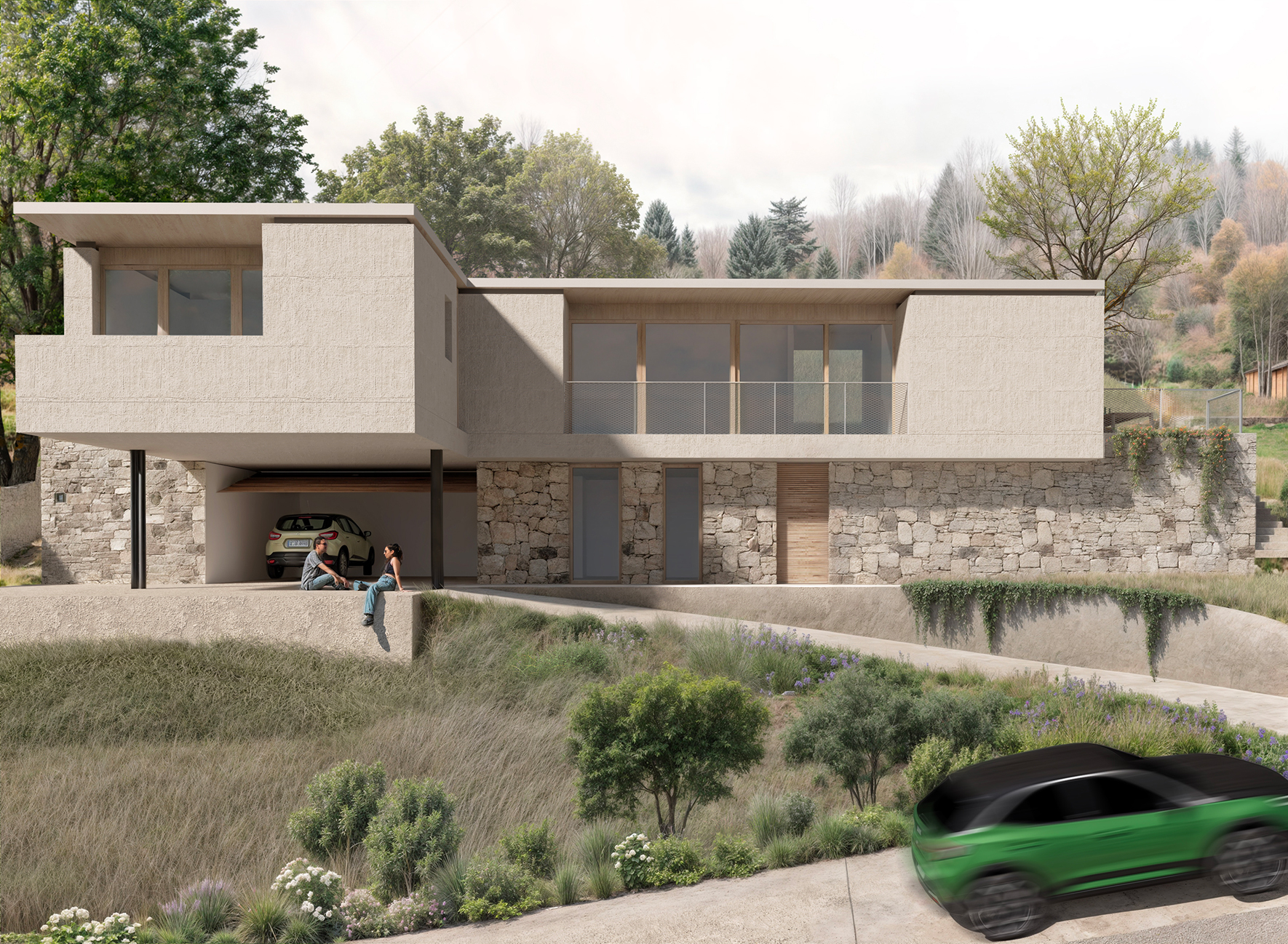 Guiding the design are the quiet presence of natural materials, environmental quality, and a vision of living that is intimate and unhurried, in constant connection with light, earth, and the passing of time. The stone and exposed concrete base anchors the building to the ground, while the elevated structure, made of wood and metal cladding, unfolds lightly and openly toward the exterior.