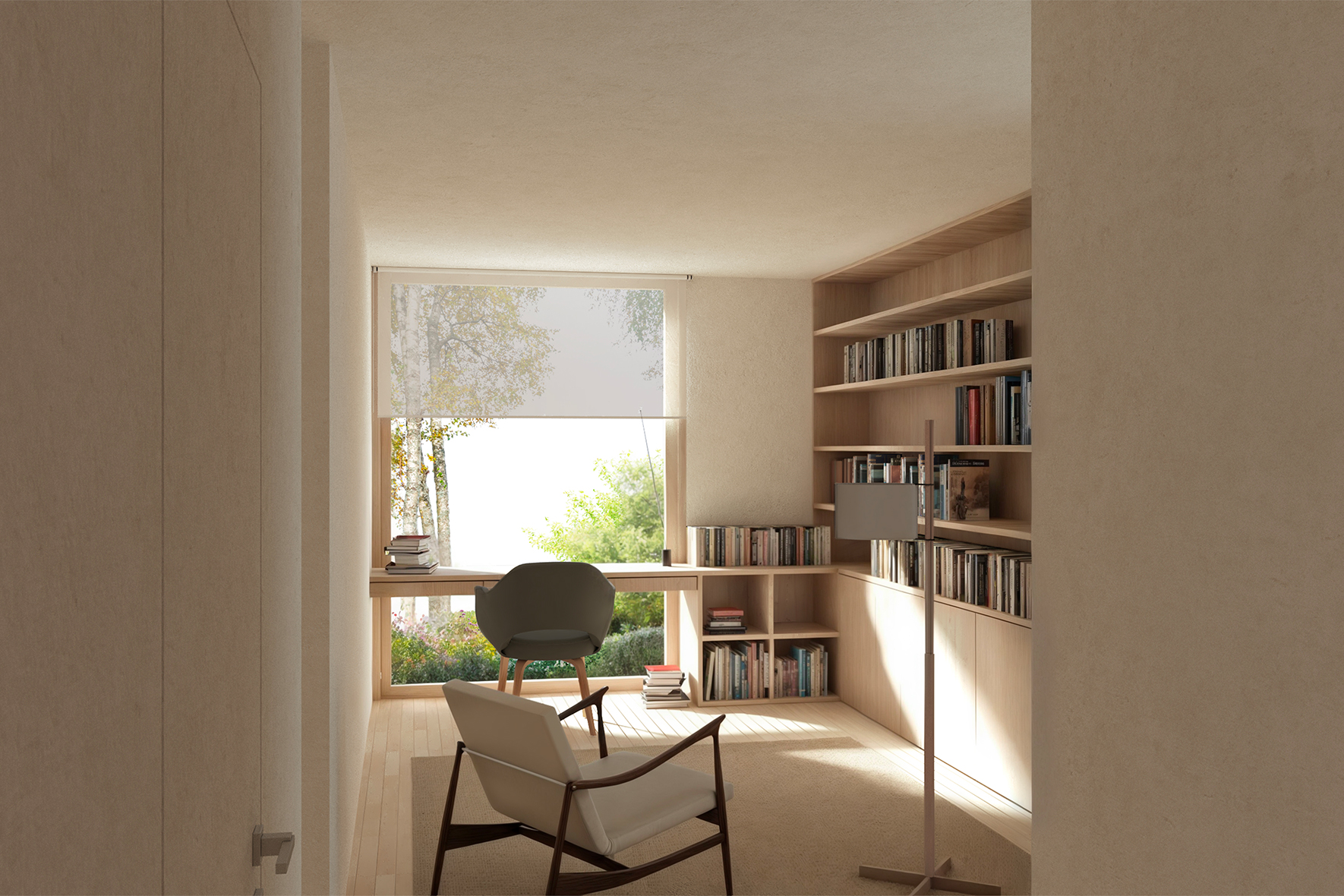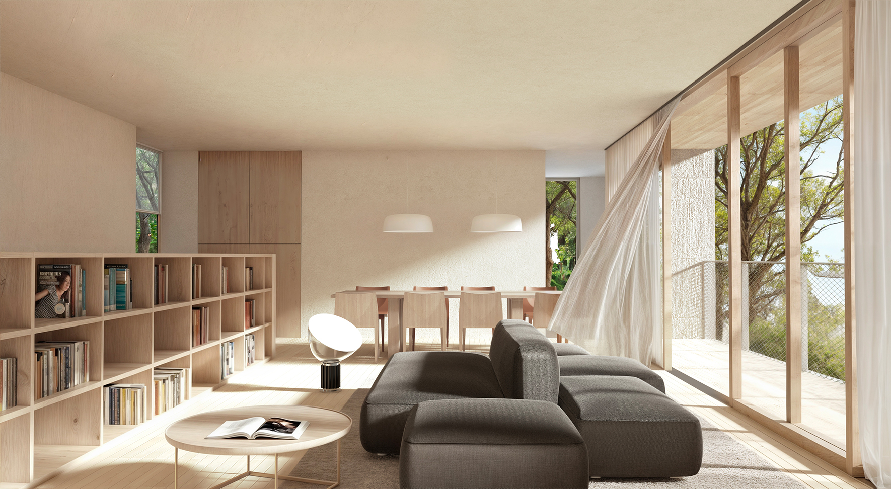 Large windows frame the surrounding greenery and allow natural light to become the true protagonist of the interior spaces, where pale materials, essential furnishings, and continuous surfaces dominate.