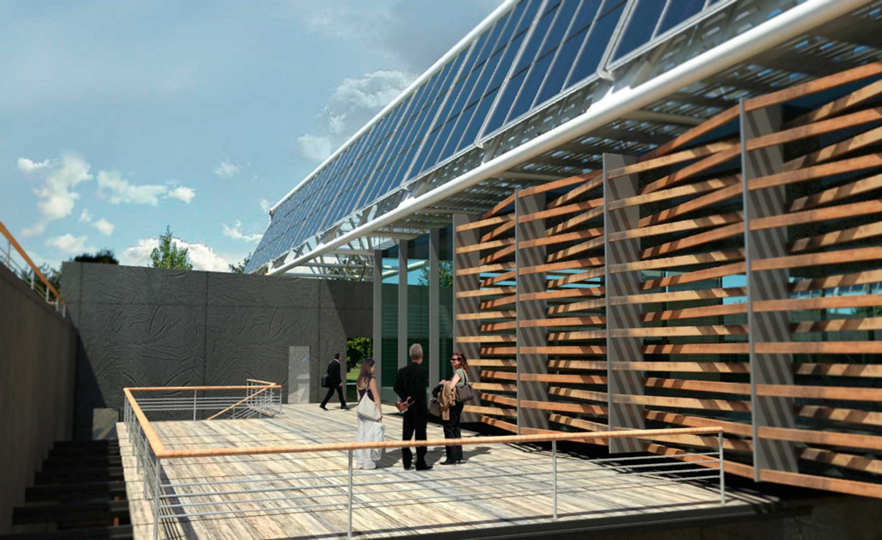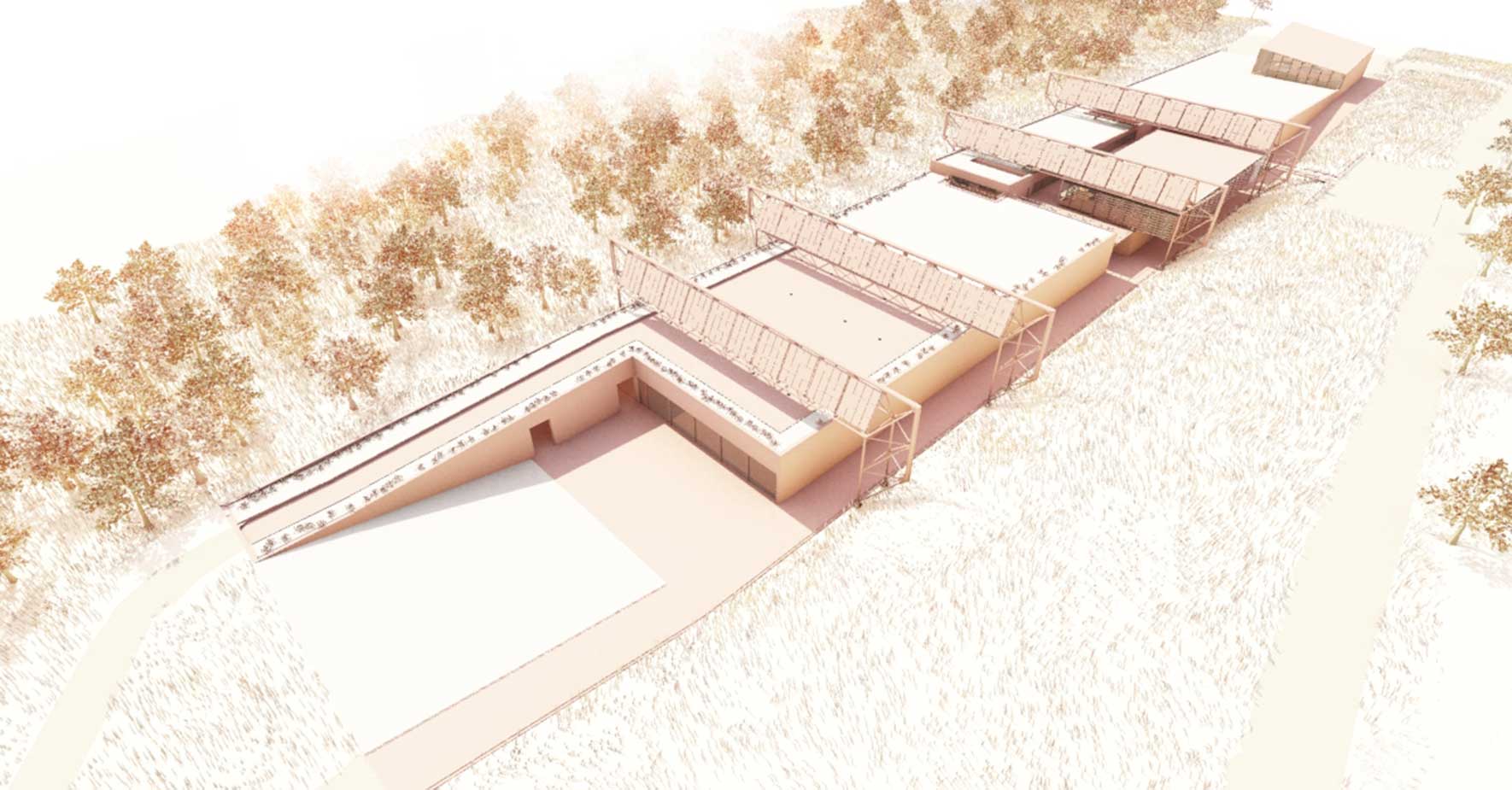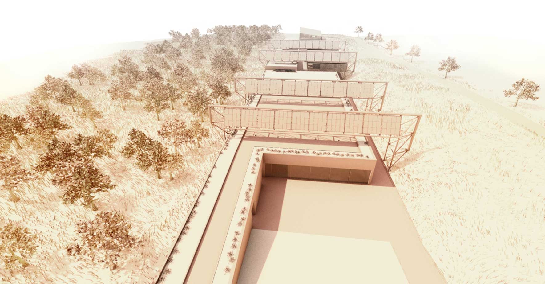 An ecological partition wall made up of an iron weave that generates energy and on which vines climb. Inside, nature is artificially shaped to make place for the large “factory”, while outside everything remains as it is now, only inside does the architecture sculpt the natural shape of the ground.