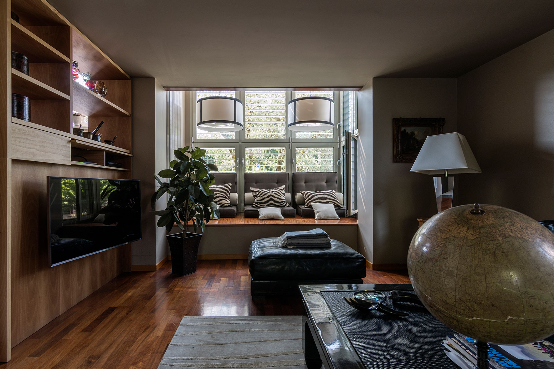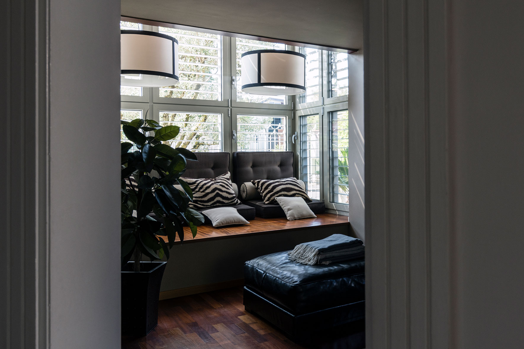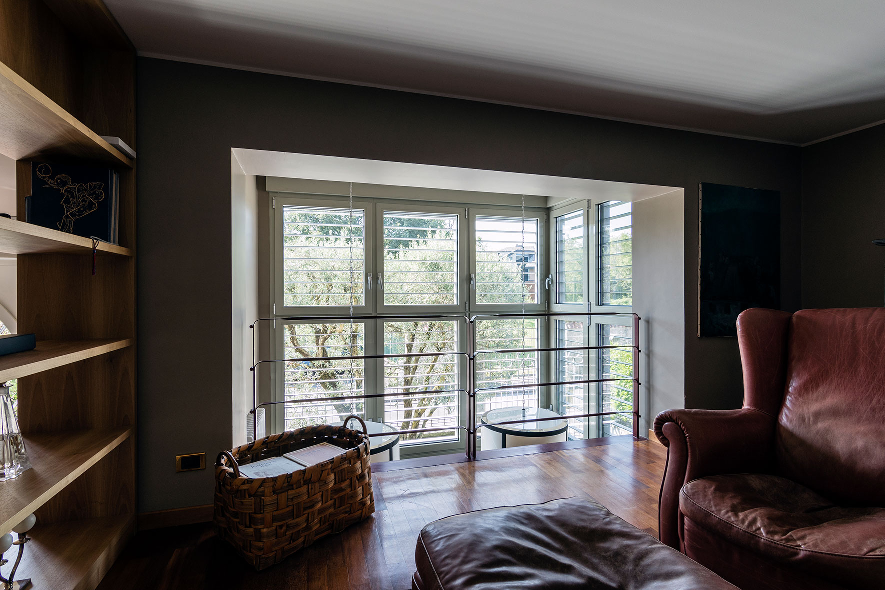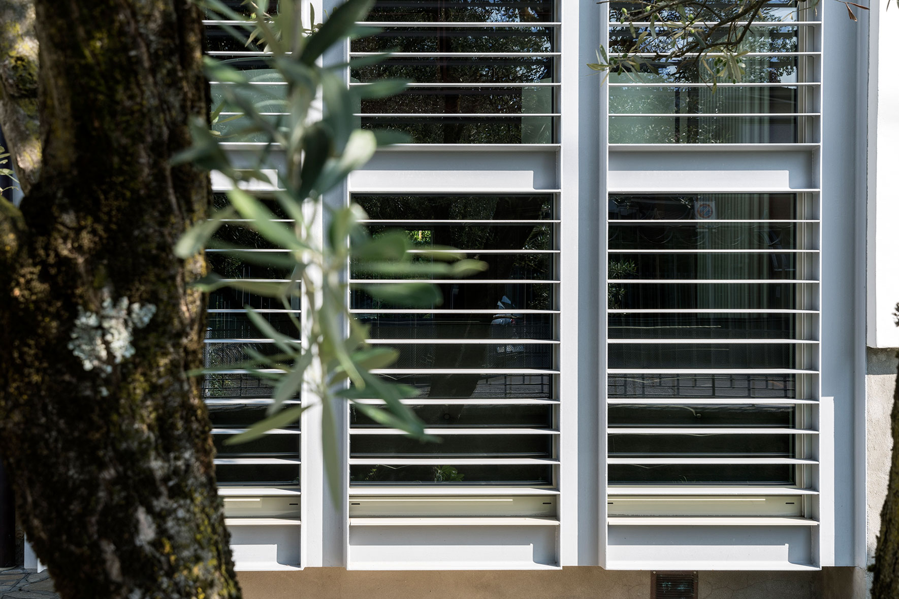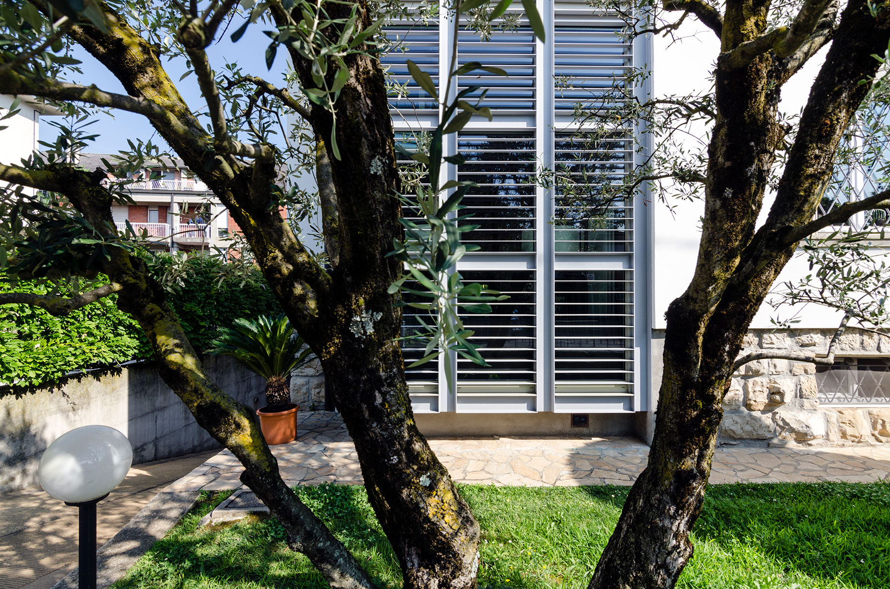 Il bow-window permette inoltre di migliorare sensibilmente la fruibilità del soggiorno che si arricchisce di un giardino d'inverno. I brise soleil hanno la funzione di schermare la facciata a sud dei raggi solari e di proteggere dalle intrusioni.