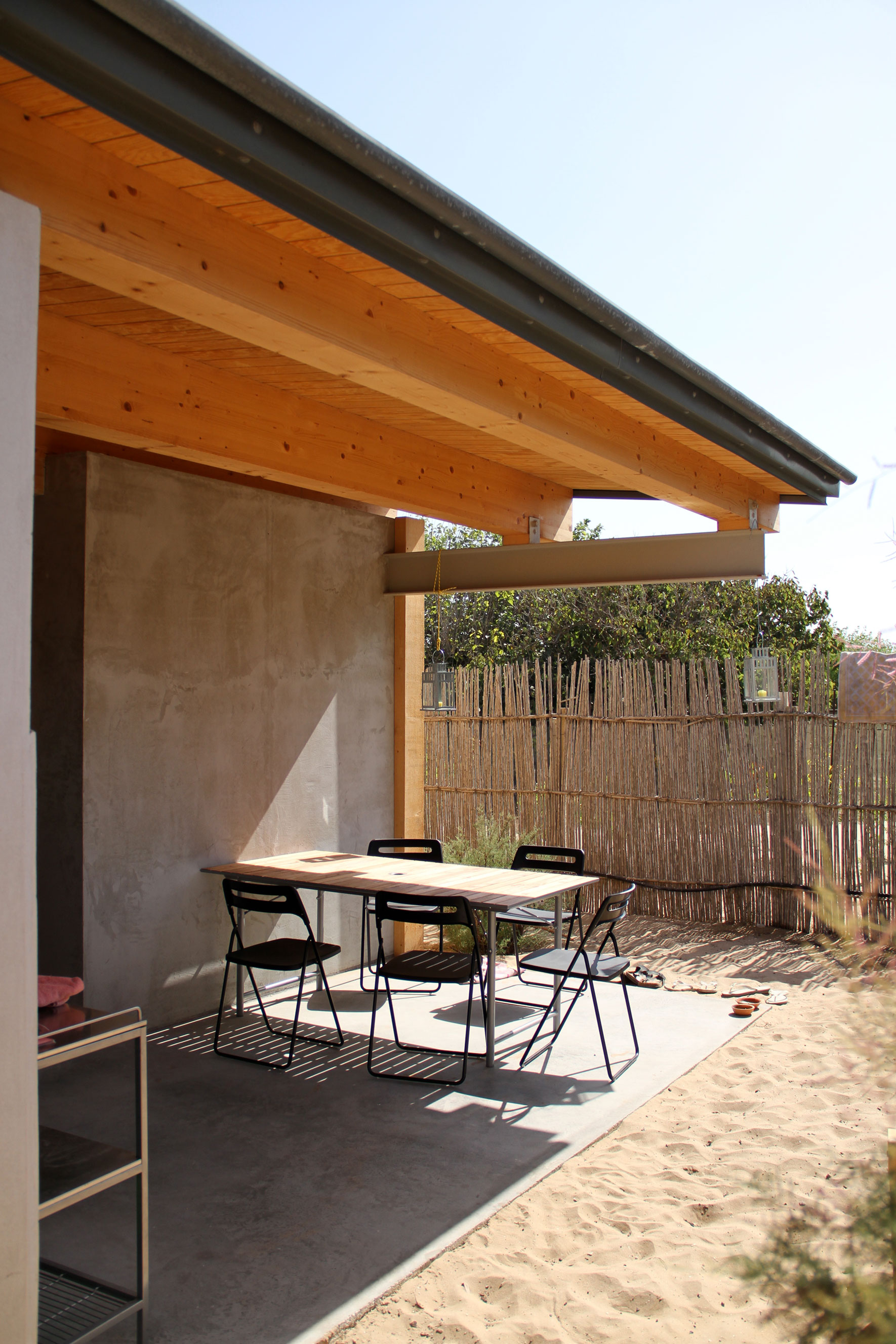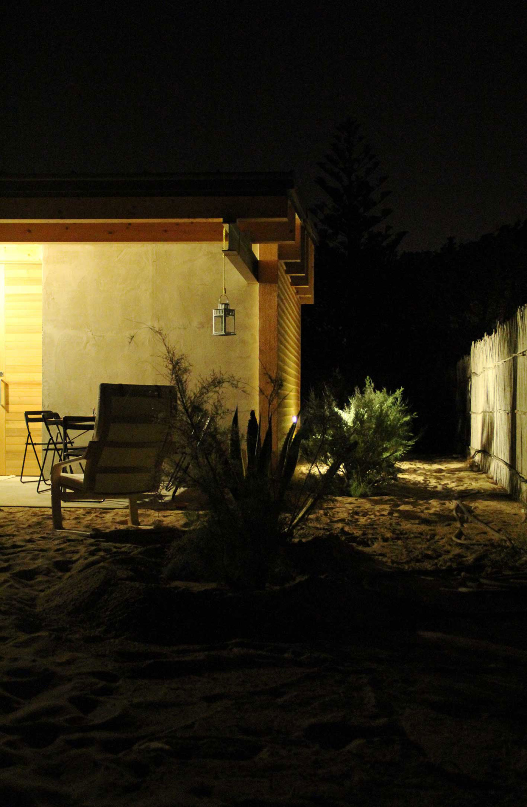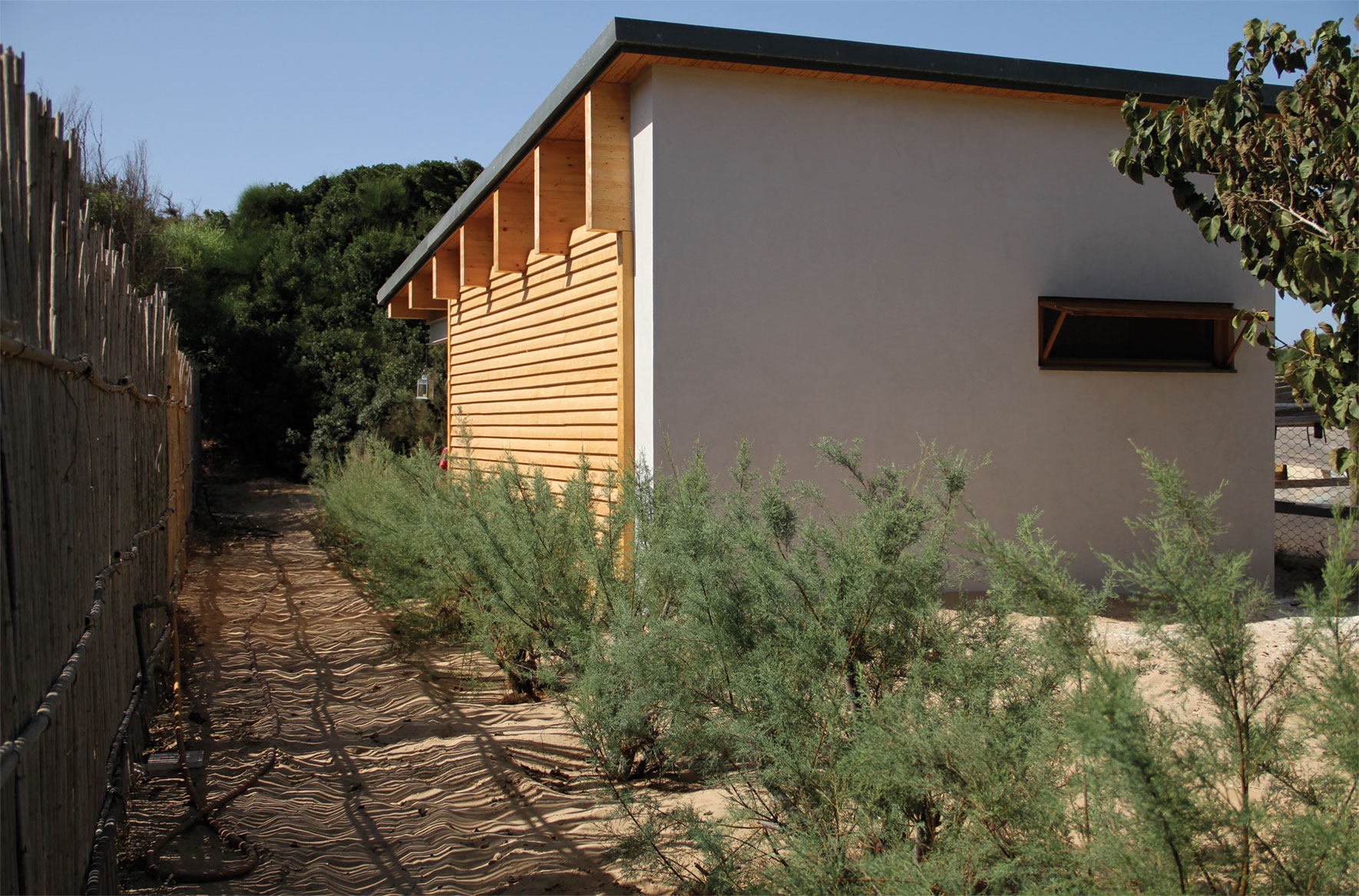 Una capanna per sentire il rumore del mare al di là della duna di sabbia e lentisco. Nei dintorni architetture spontanee di tufo, latta e plastica. Una sola finestra a nord contro un gelso per garantire il giro d’aria col portico contro la duna tra le tamerici. Venticinque metri quadrati che guardano solo verso il cielo, che si relazionano solo con la sabbia e il mare. Un rifugio dal sole, dal caldo, dal vento.
