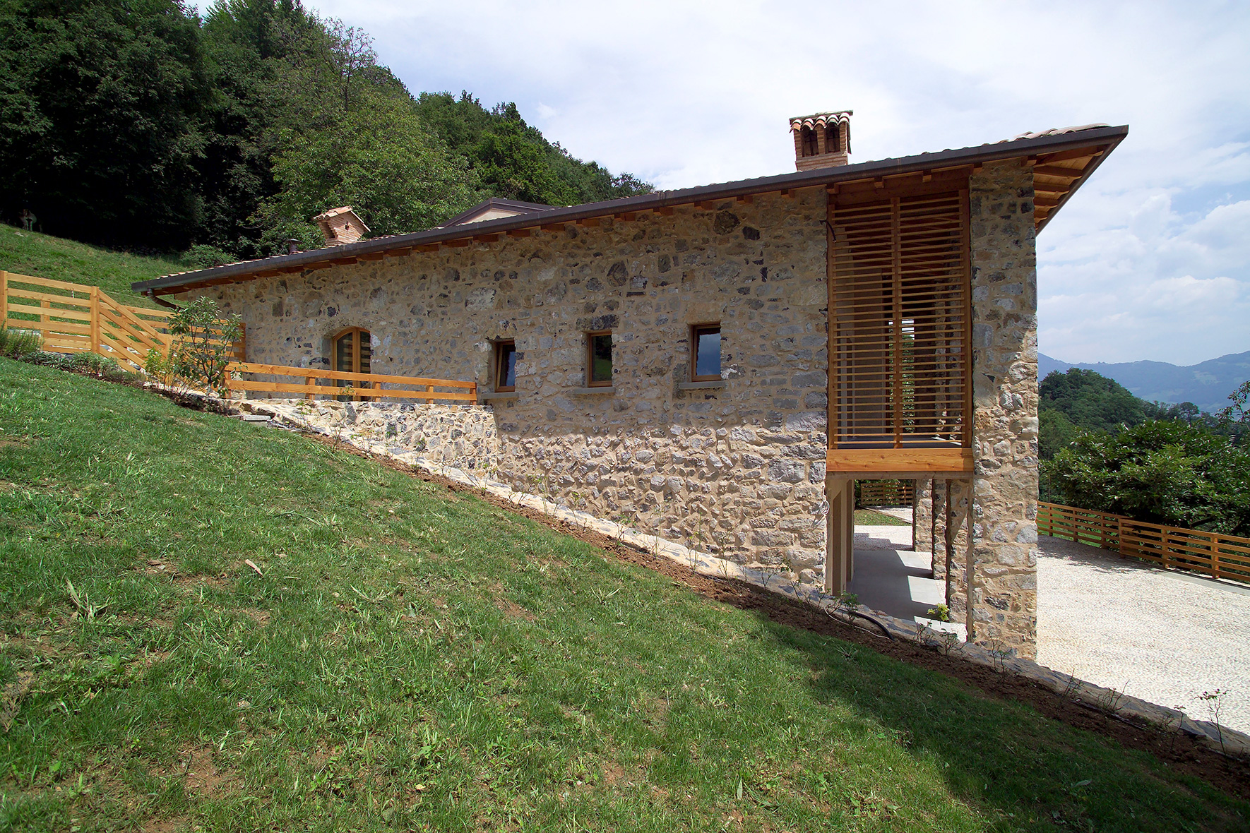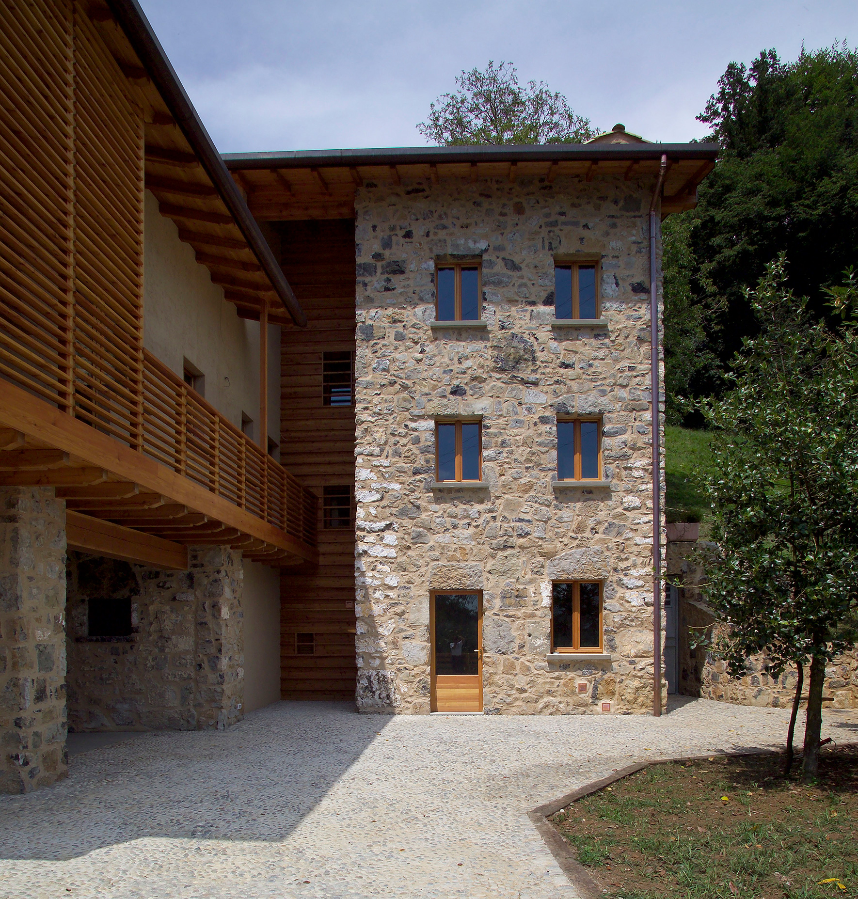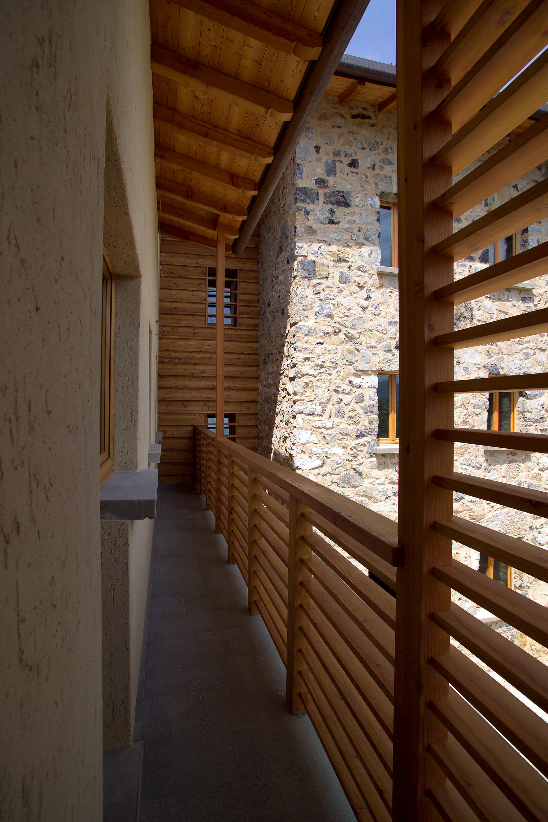 I due corpi di fabbrica vengono distanziati da una parete in legno, mentre il loggiato viene schermato dal grigliato in larice, che lo chiude parzialmente. La scelta di utilizzare elementi naturali per lasciar loro il tempo di maturare, modificarsi e adattarsi al luogo, si riscontra anche nell'uso di intonaci e rasature in calce che muteranno colore nel tempo.