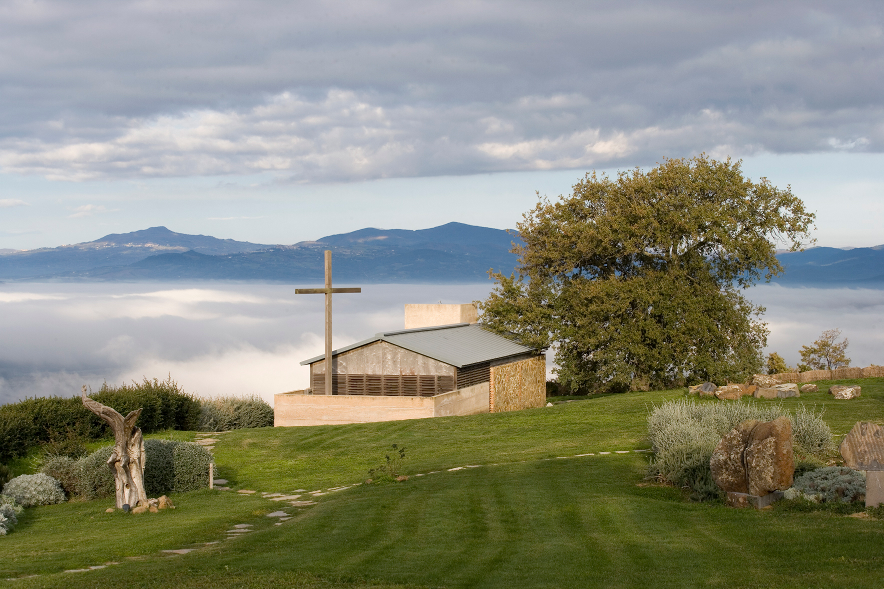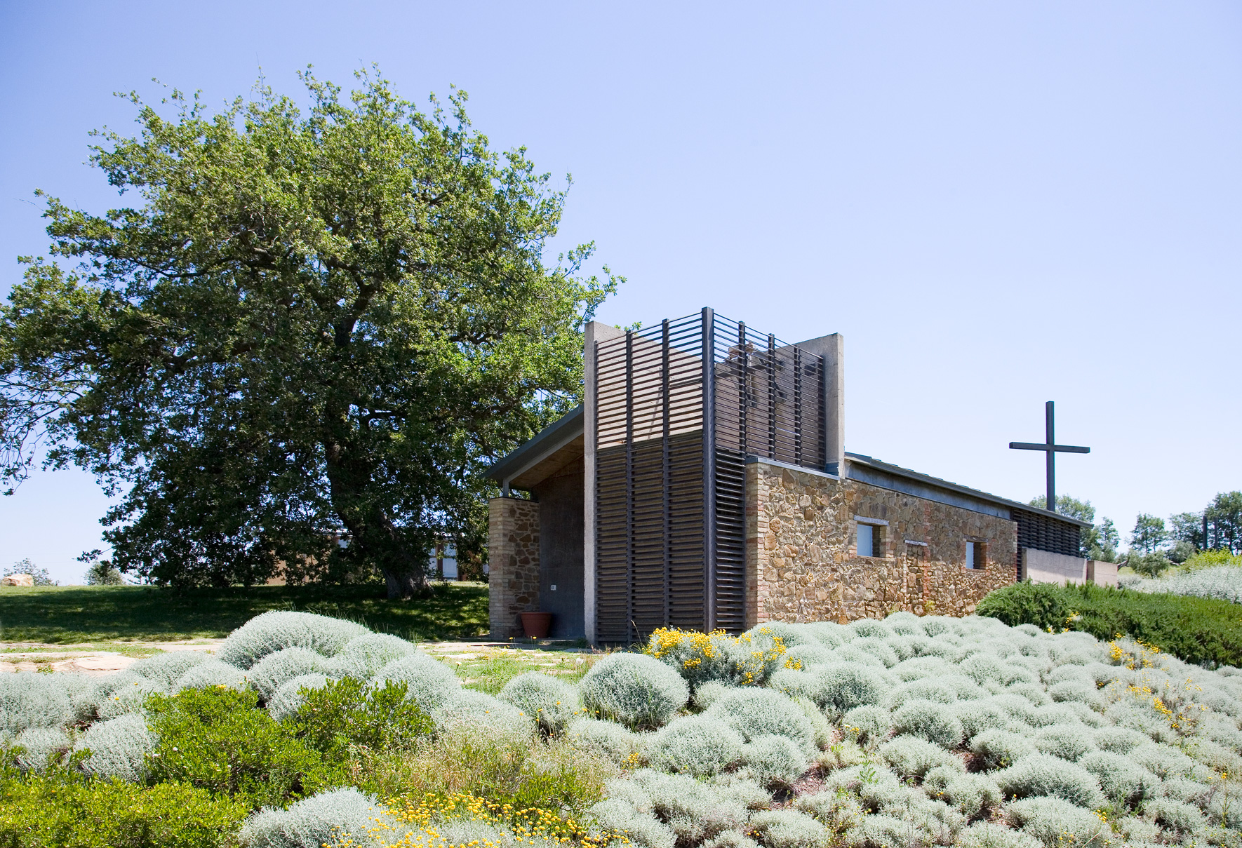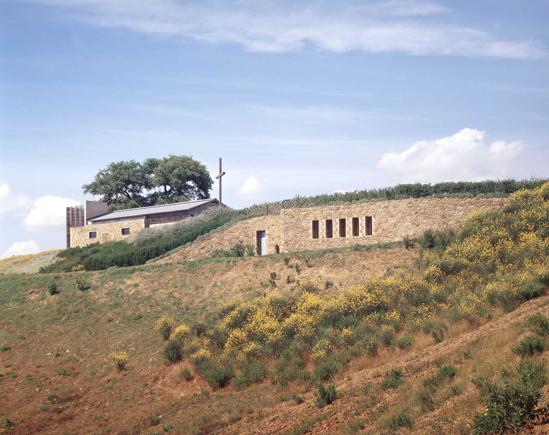 Una grande quercia, a fianco dell’ovile, individua il punto di maggiore concentrazione energetica; un orizzonte unico, dall’Argentario e l’Uccellina alla Val d’Orcia e al Monte Amiata. La religiosità in quel luogo era già altissima. L’equilibrio straordinario del sito non andava modificato; le aggiunte dovevano essere silenziose ma vive, perchè il luogo potesse rinnovare la propria energia".