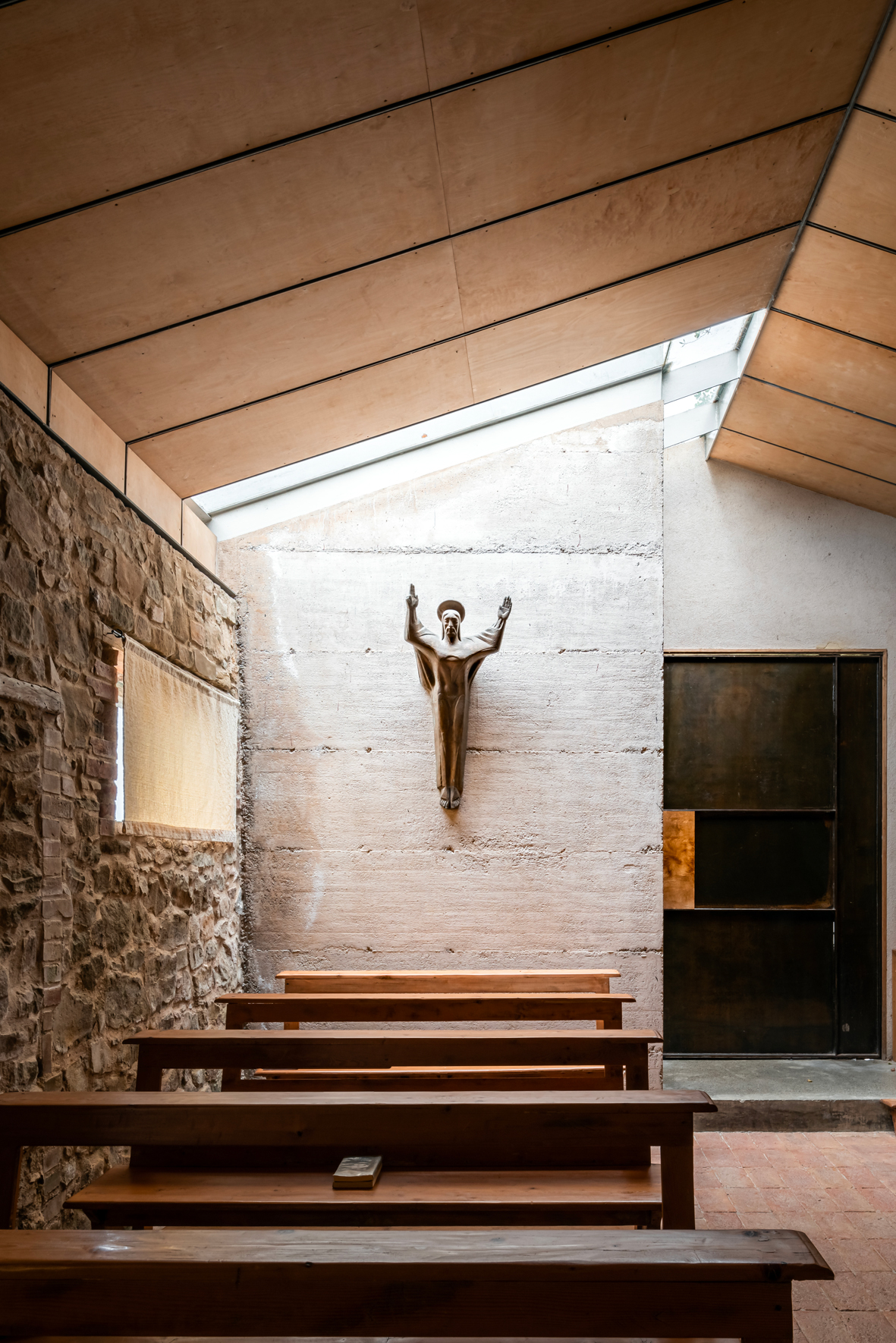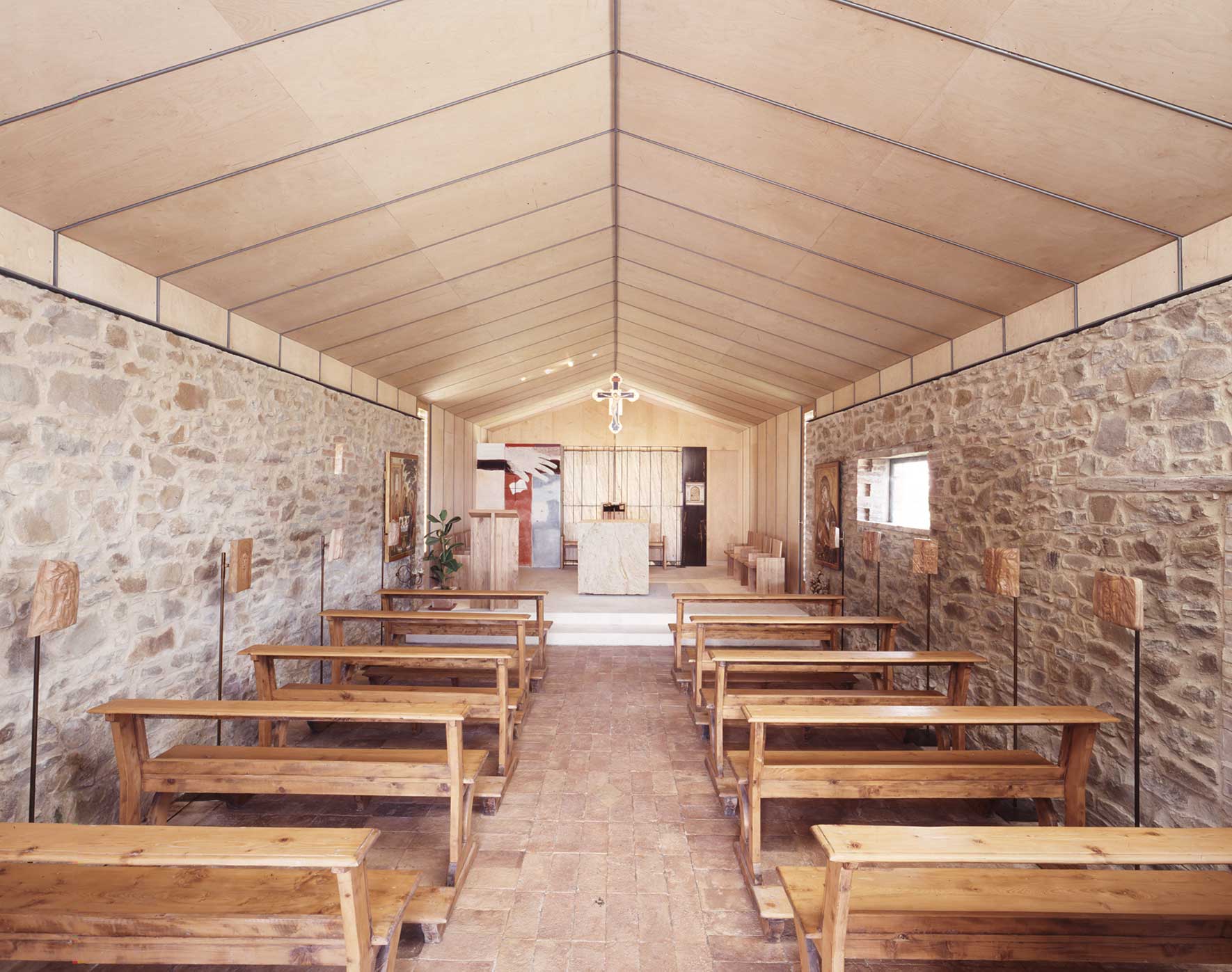 Il progetto ha previsto il mantenimento del corpo di fabbrica più antico e la demolizione delle superfetazioni, dichiarando in modo esplicito le aggiunte architettoniche necessarie alla nuova funzione. L’ampliamento, quasi fosse generato da una piccola esplosione trattenuta dai due vecchi muri, ha sollevato verso l’alto di quaranta centimetri il tetto in legno generando il presbiterio e l’abside della nuova piccola chiesa, ricuciti alle preesistenti murature da un infisso verticale. I materiali sono il legno, la pietra, gli intonaci dei colori delle terre locali.