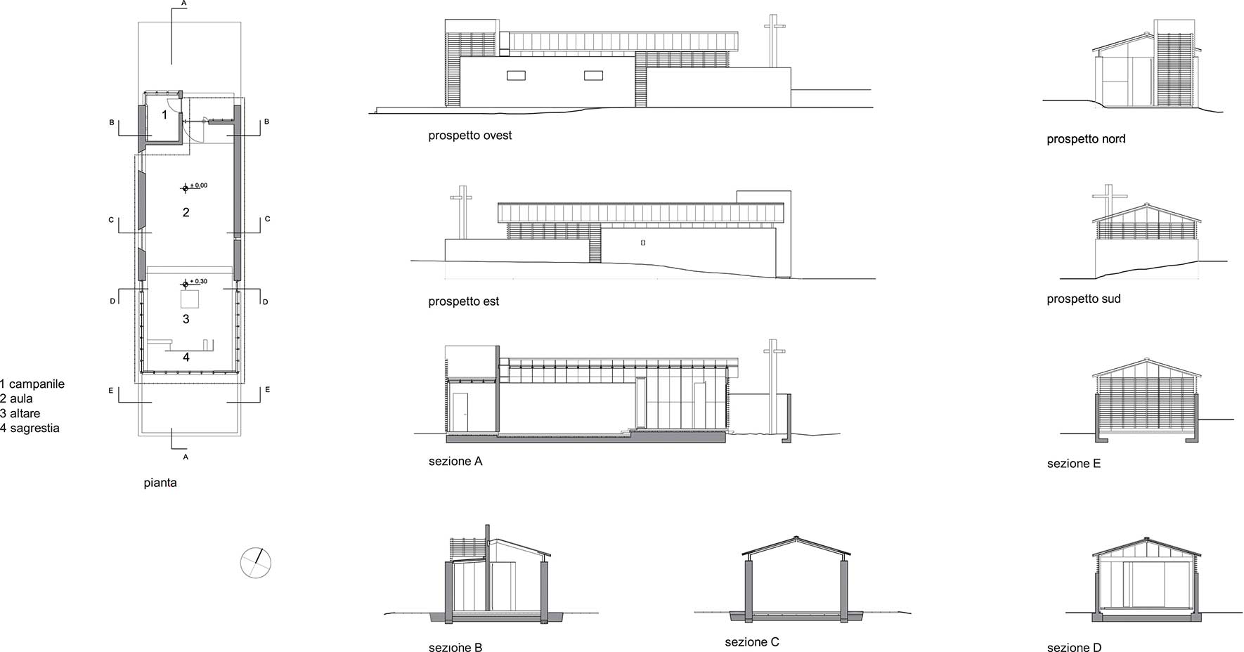 Materiali tradizionali e spazi semplici per esprimere una modernità al servizio di un cerimoniale antico e di uno stile di vita rispettosi del luogo e delle sue valenze sacre, storiche e naturali. I nuovi tamponamenti sono in legno chiaro come la croce, posta in un piccolo giardino seminato solo a prato, accessibile dall’interno della chiesa e protetto da un basso recinto realizzato con impasto di cemento e terra del luogo. Il campanile è costituito da una leggera torre di lamelle di legno grezzo rivolta verso il vento dominante.