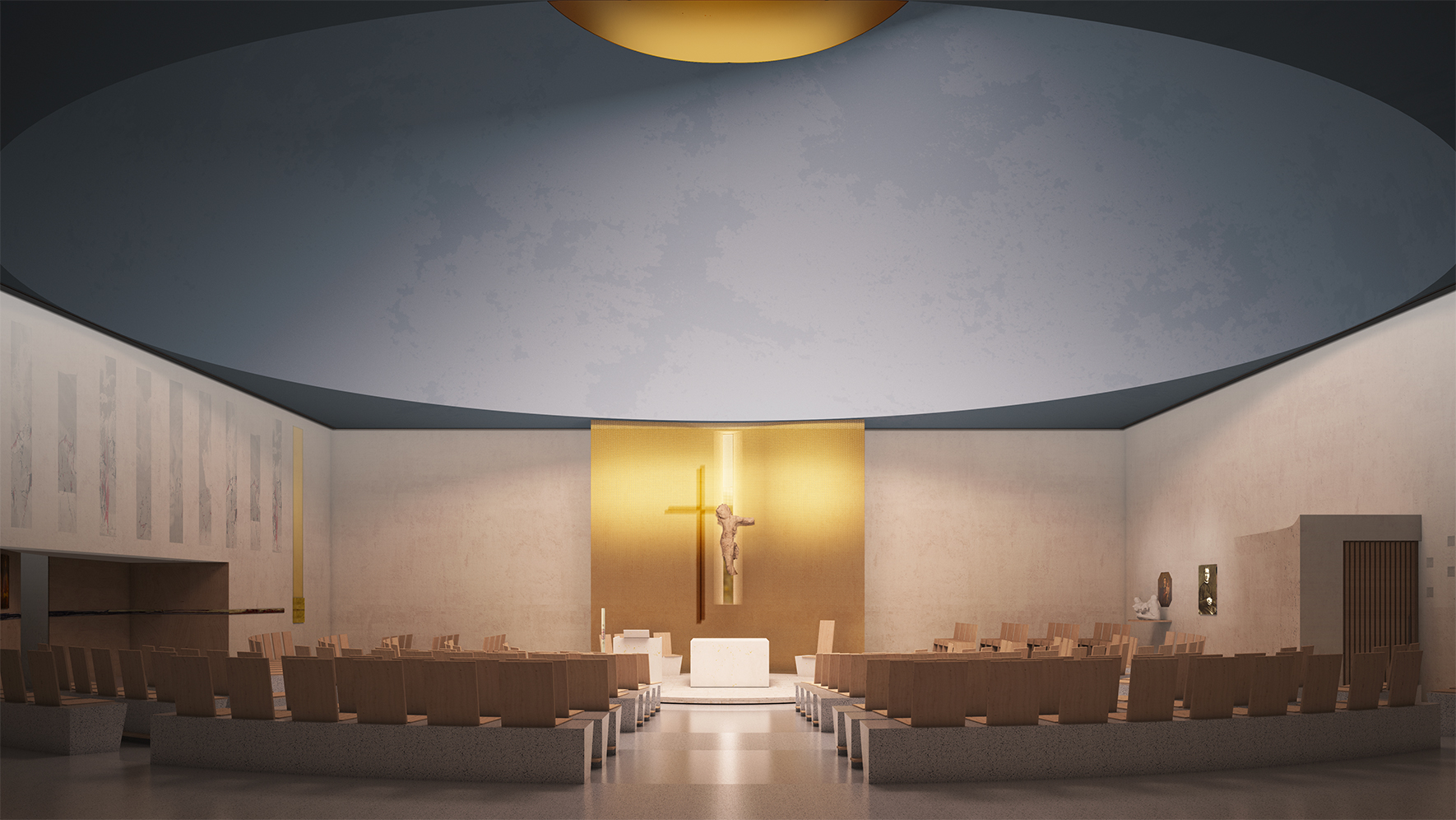 L’aula liturgica come una corte interna, un luogo collettivo illuminato e guardato dall’alto da un occhio vigile e solare all'interno della quale i fedeli si siedono in circolo attorno al celebrante che è tra loro, sollevato in alto solo dalla luce.