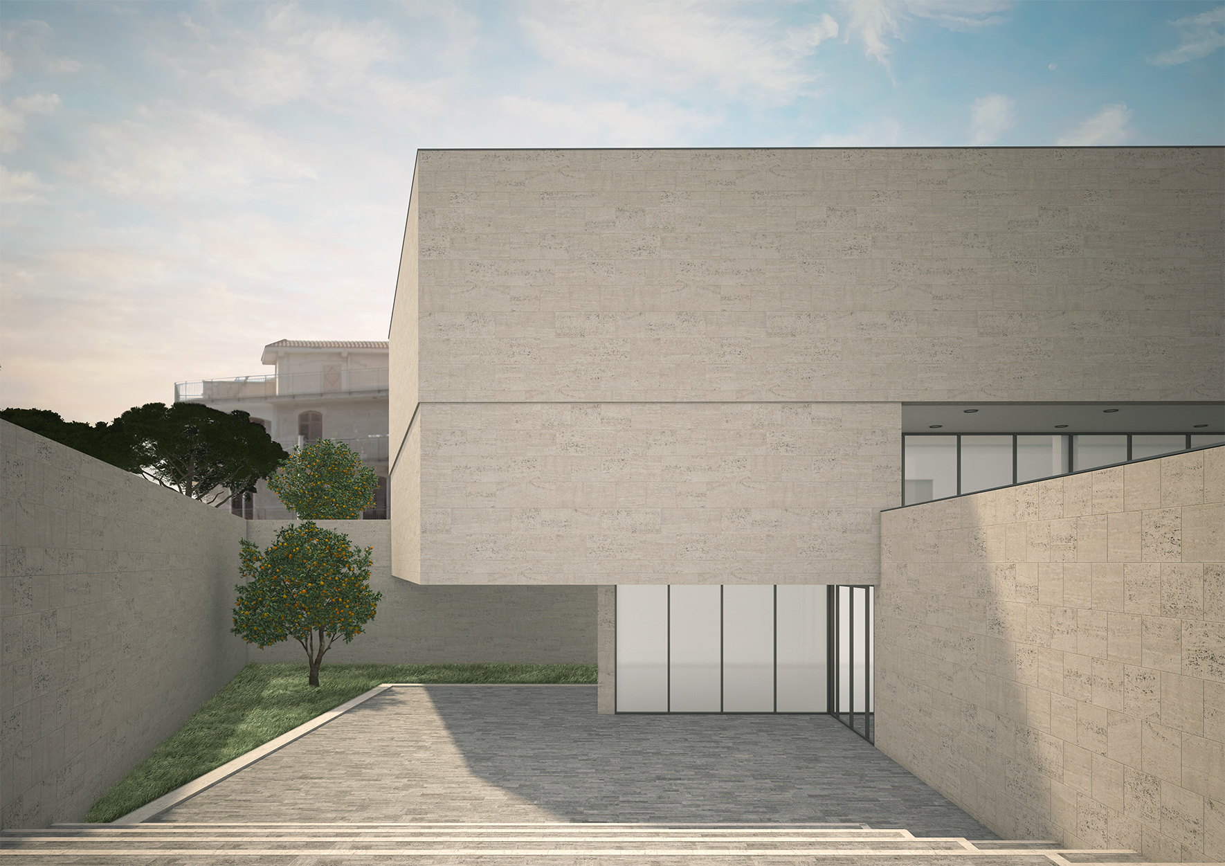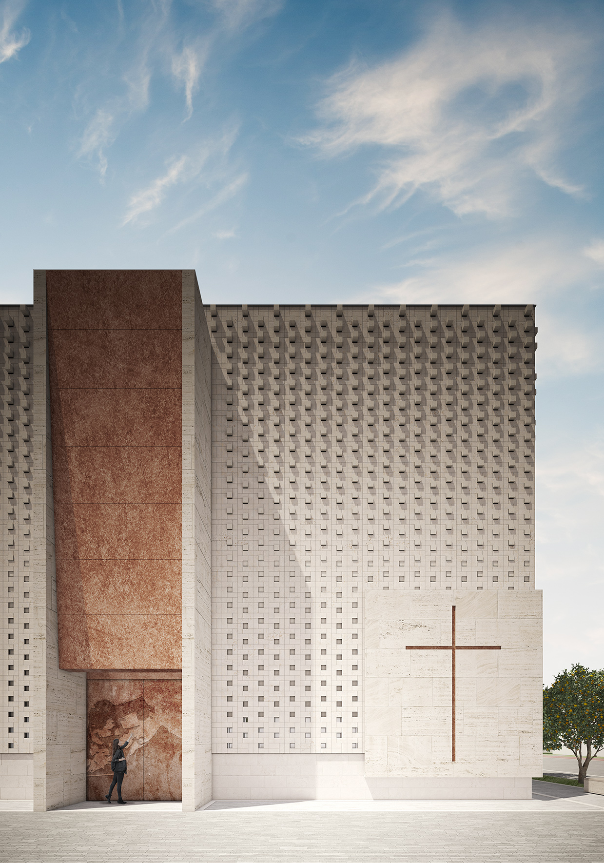 Il paramento esterno della chiesa è in pietra di Comiso. Il suo basamento massivo e compatto, leggermente rientrato, realizzato a grandi blocchi, si riduce, si frantuma e si buca salendo verso la luce come se fosse lei a consumarlo, a masticarne le membrature anche in modo irregolare, anzi saranno le parti più esposte alla luce a corrodersi prima lasciandola penetrare all’interno.