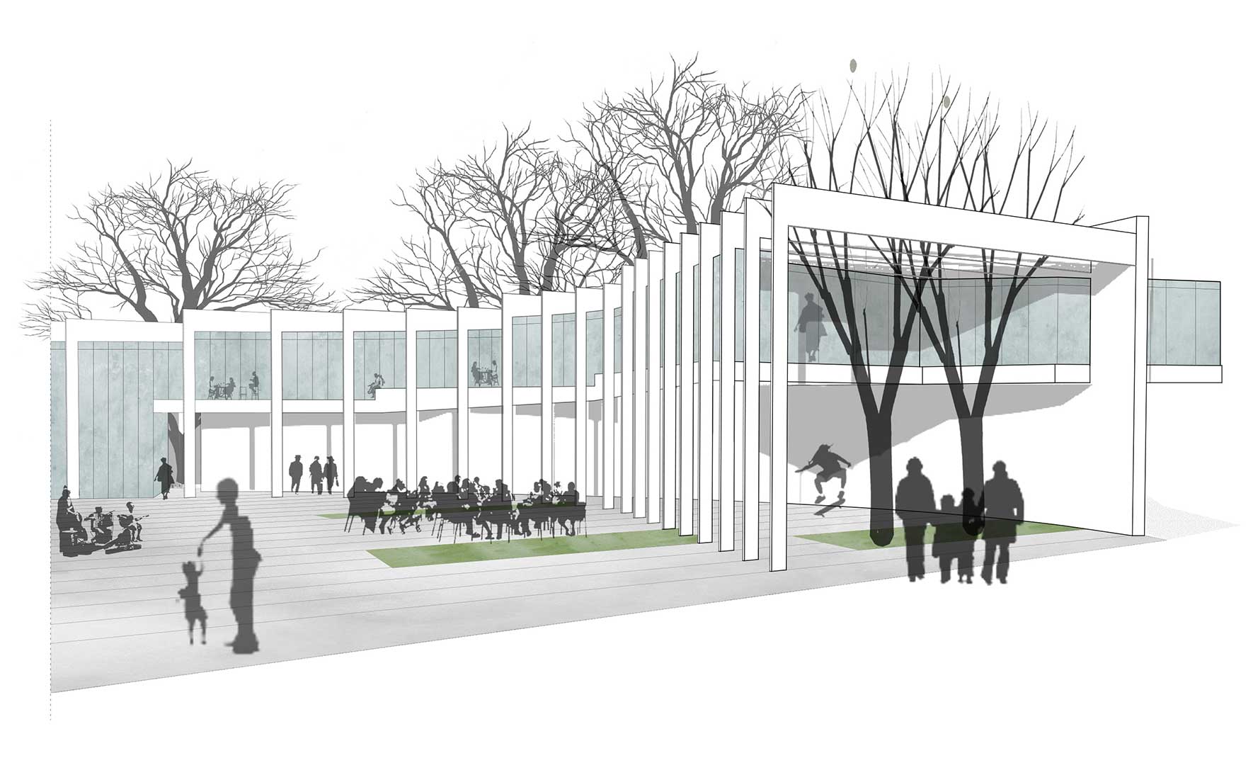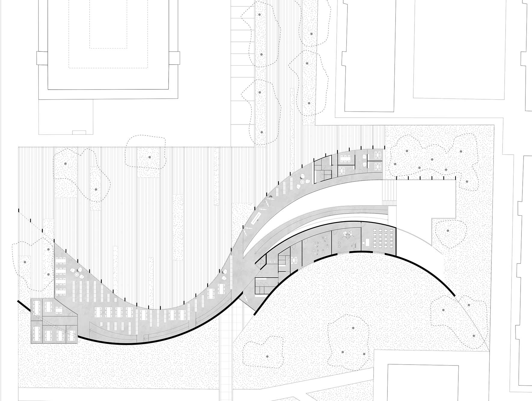 Il nuovo impianto si inserisce nella rigida maglia ortogonale delle strade e dei caseggiati e, come un’elica, crea quei vuoti e quei pieni in grado di dinamizzare lo spazio pubblico assegnandone destinazioni d’uso riconoscibili, ma affatto statiche. L’edificio assume così il ruolo di nodo strategico e di cerniera tra il parco, il quartiere e la nuova piazza fungendo da tessuto connettivo relazionandoli tra loro in una unica realtà urbana.