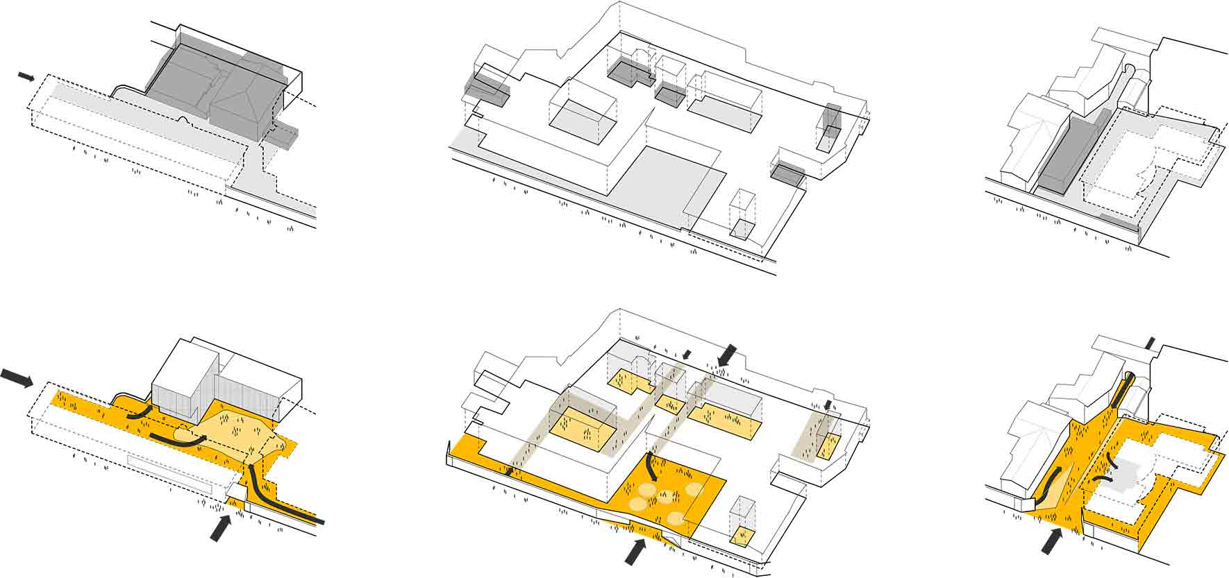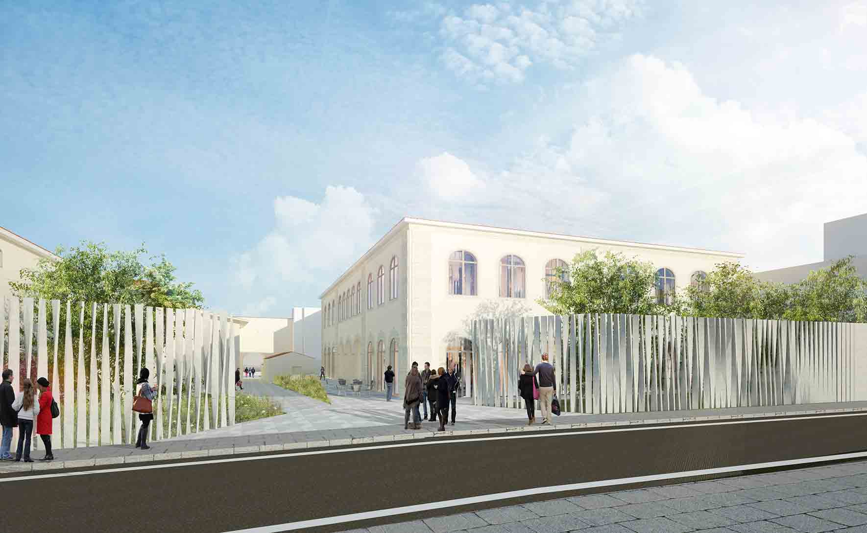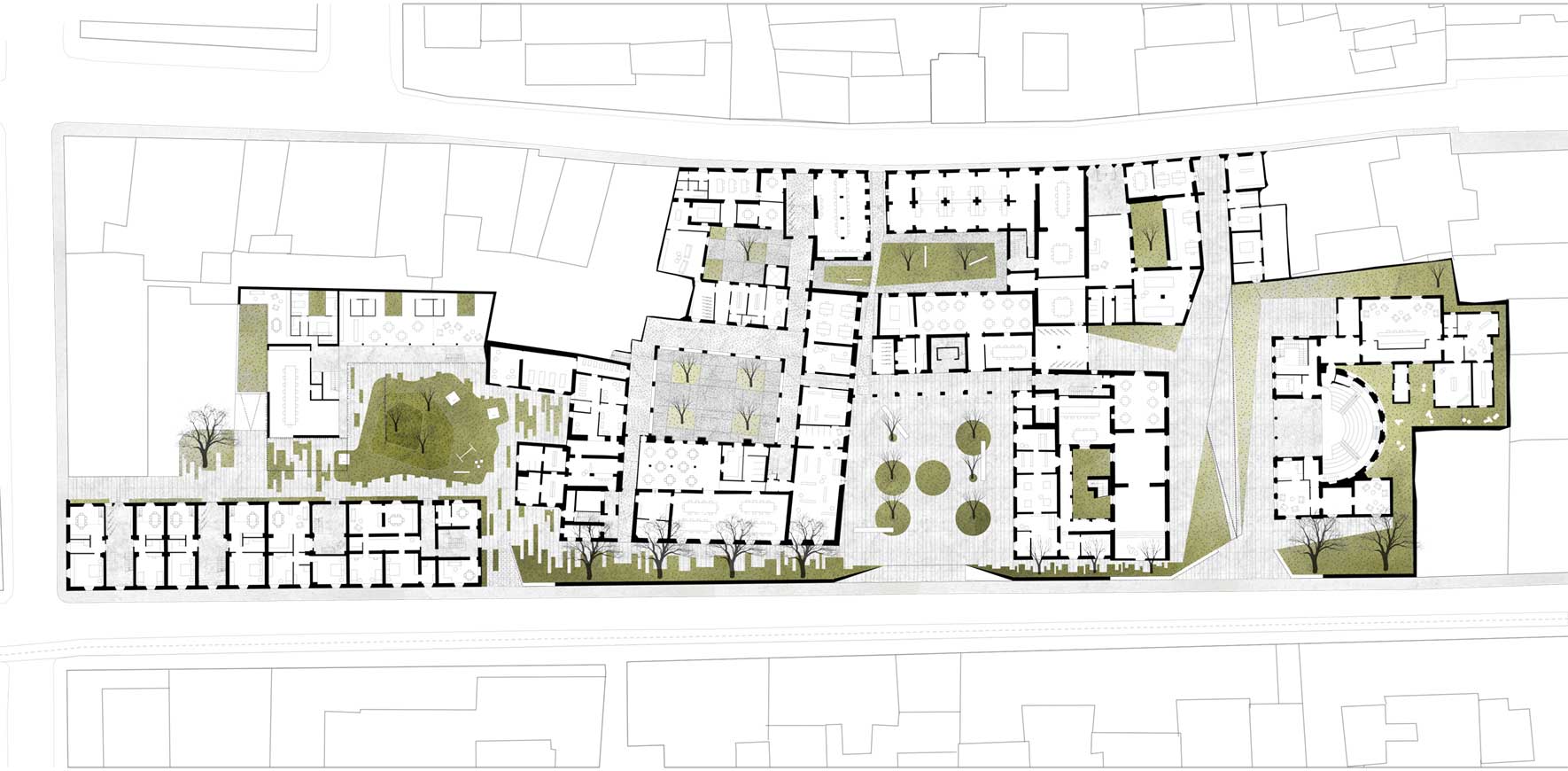 Il progetto è concepito come un unico tessuto connettivo costituito da un sistema di piazze-giardino, edifici residenziali, ricettivi e culturali. Le tre aree riconsiderano le divisioni catastali del lotto di progetto separando rispettivamente il teatro, i due monasteri e la parte residenziale.