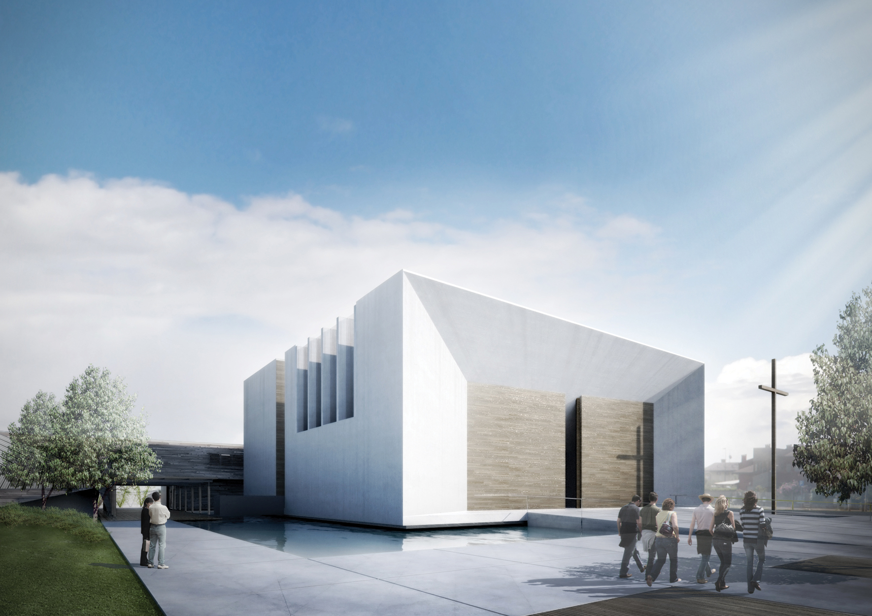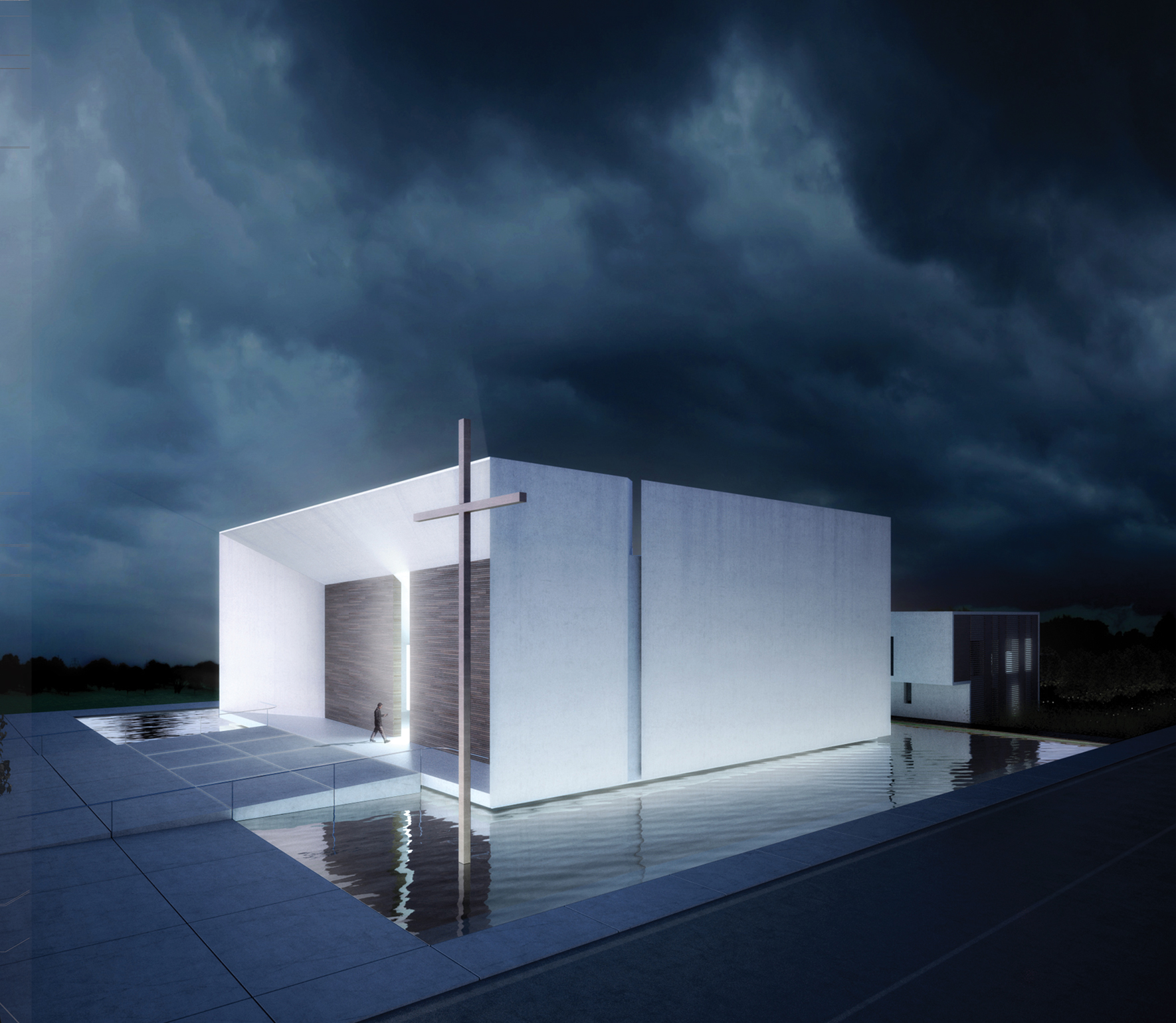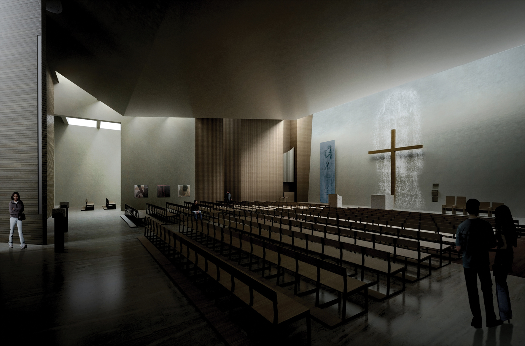 Un importante volume massivo e fortemente geometrico in grado di imporre nel territorio un punto di riferimento orizzontale e verticale. Un edificio dove l’economia formale diventa la cifra per aumentare la necessaria tensione tra luce, forme e materiali. Dal punto di vista urbanistico l’architettura della nuova chiesa di Cavernago deve stabilire un nuovo baricentro urbano in grado non di estraniarsi bensì di inserirsi e sovrapporsi con forza alla rigorosa e forse banale ortogonalità dell’impianto urbano e quindi porsi sul territorio come ricerca di immunità dallo spazio esterno cresciuto troppo distante dalla complessità della natura e dei suoi cicli.