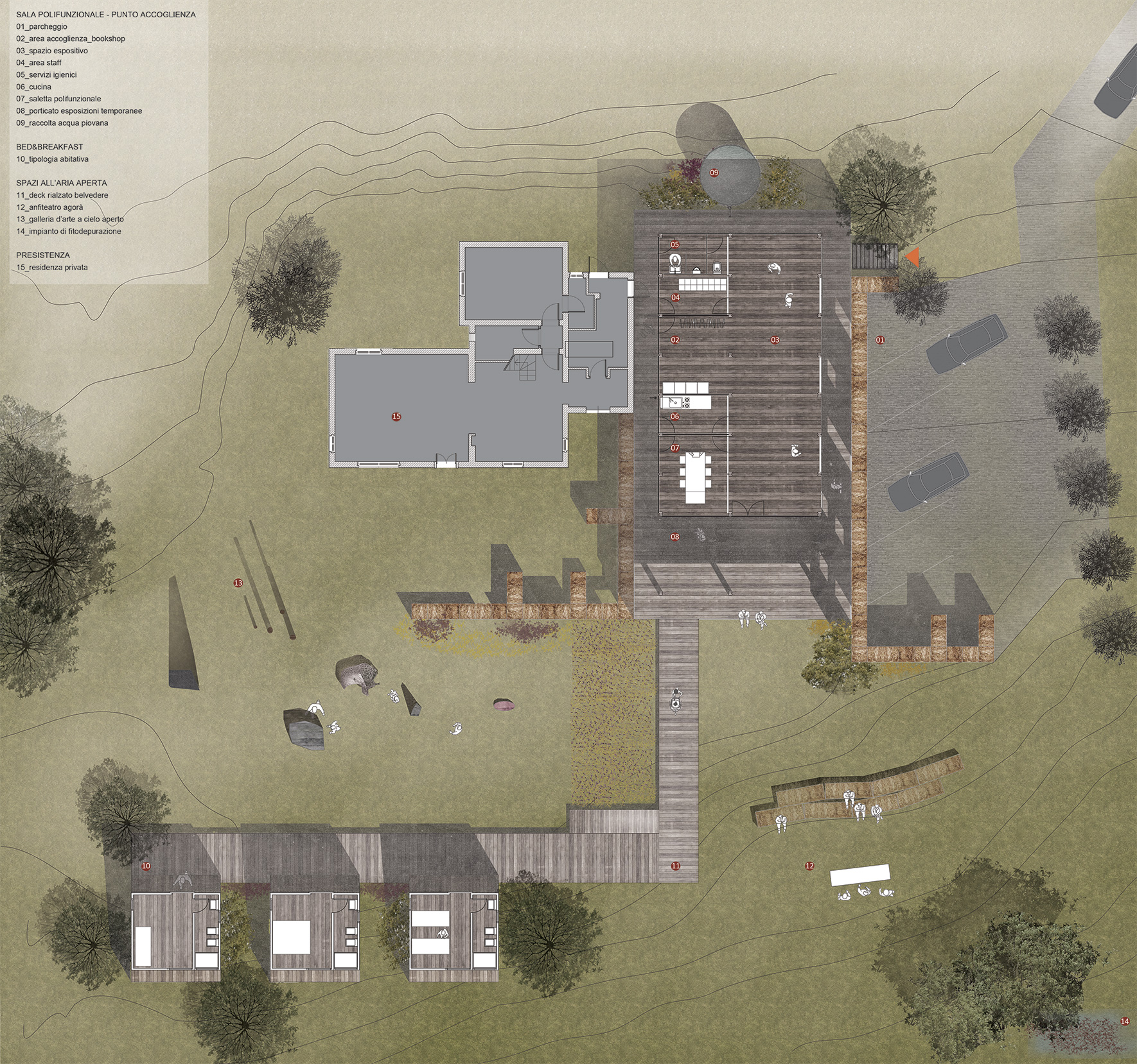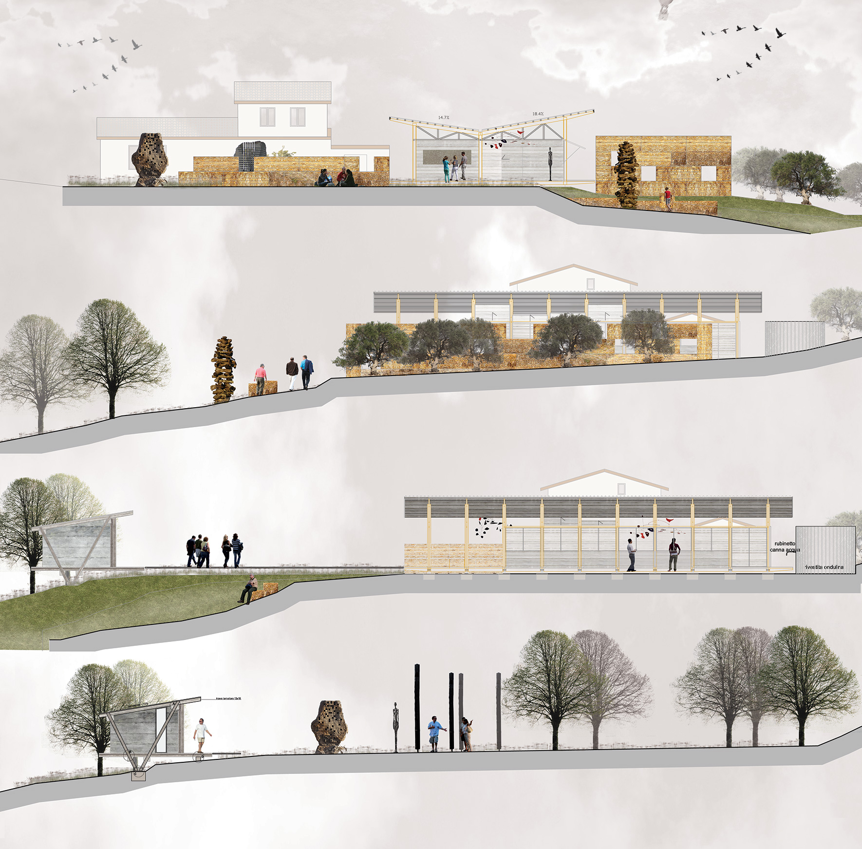 Un concorso di idee finalizzato alla progettazione di un centro rurale per l’esposizione di opere d’arte e per la ricettività di artisti e visitatori. La nostra proposta si dipana a partire da alcune considerazioni sul rapporto tra edifici rurali e patrimonio agricolo. Una relazione che si è evoluta modificando non tanto il modo di fare agricoltura ma il rapporto tra essere umano e attività agricola.