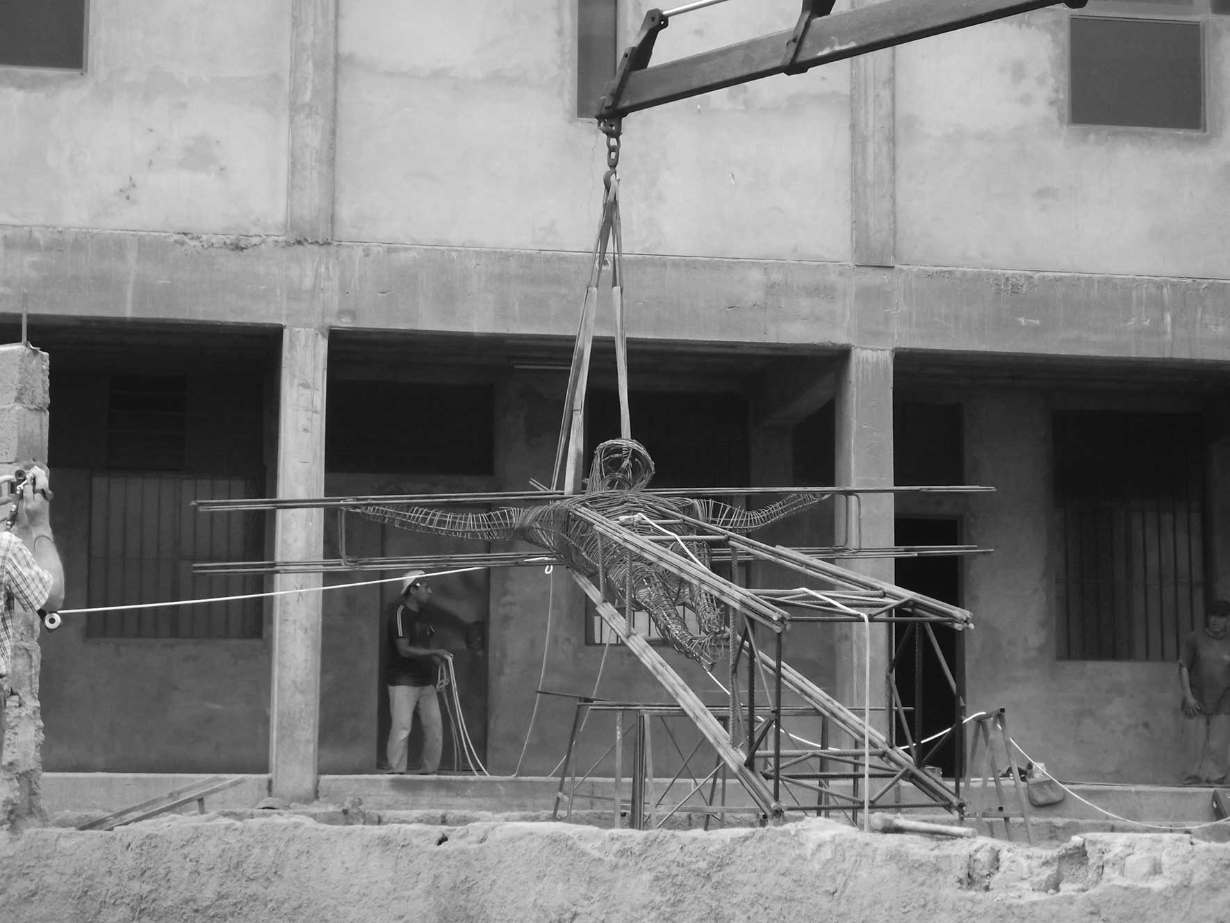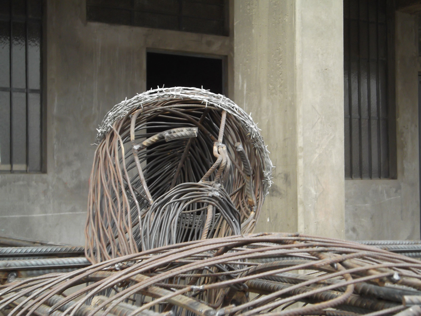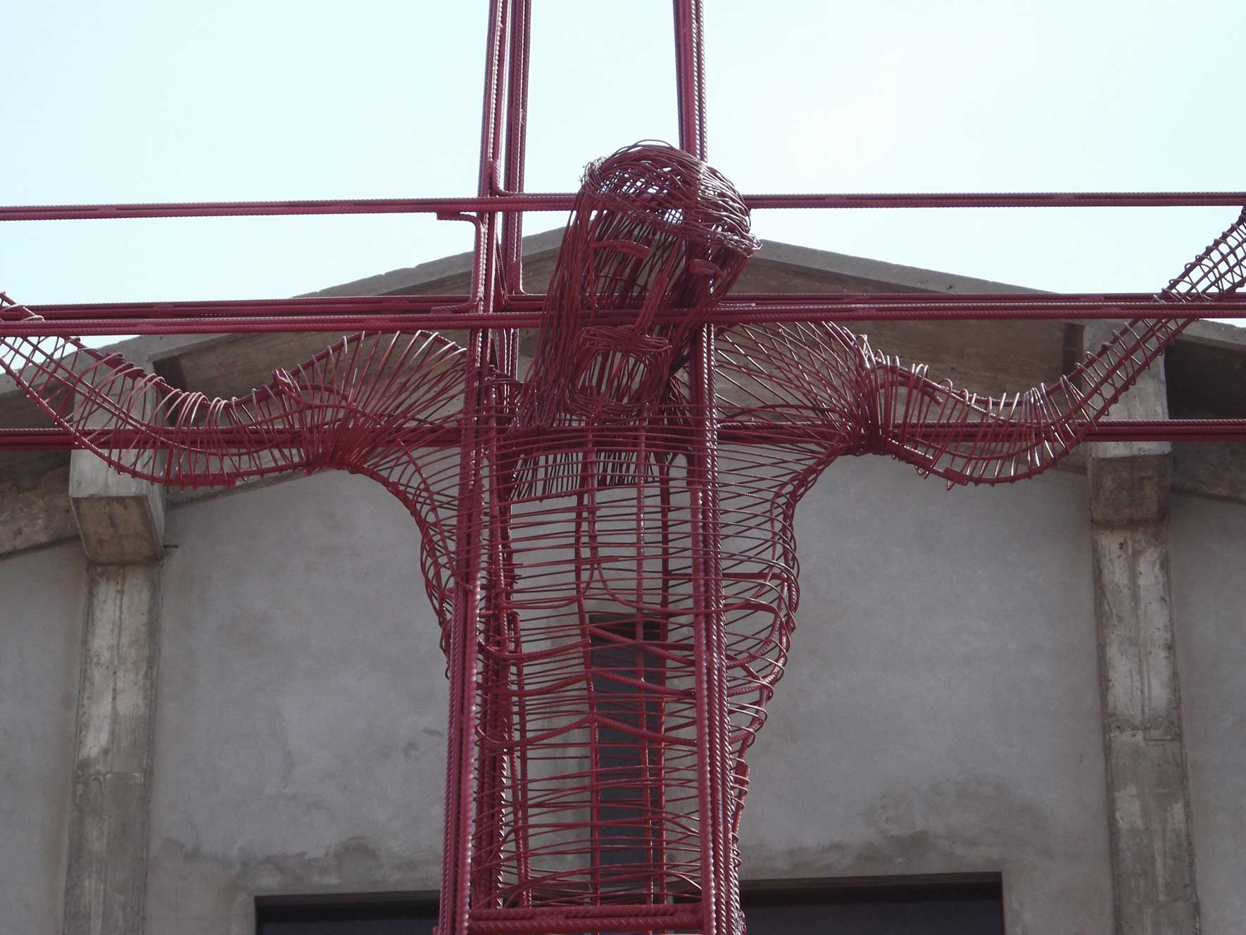 Ho subito pensato a una croce e a un Cristo che potessero uscire dalle loro mani con i materiali più semplici del loro mestiere. Barre di ferro di diversi diametri quotidianamente usati come ossatura del calcestruzzo.