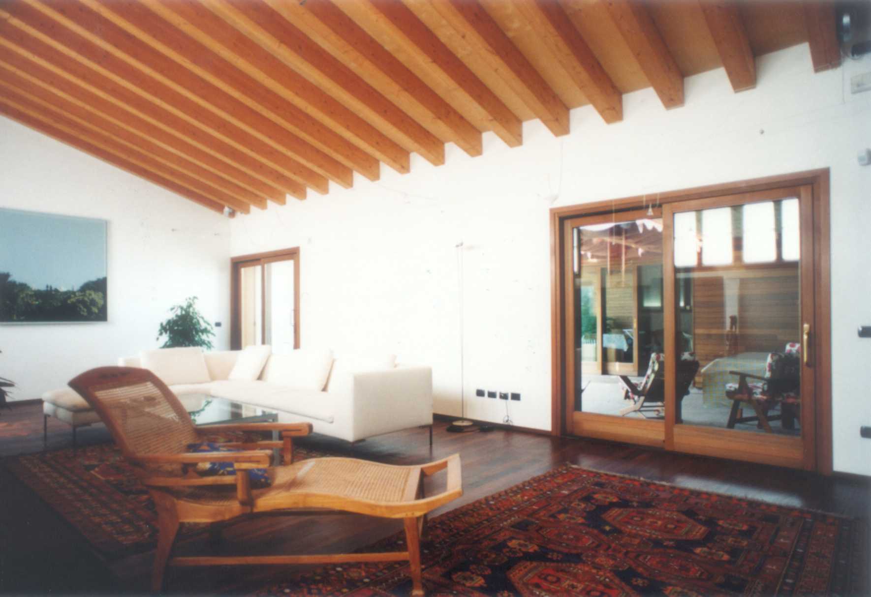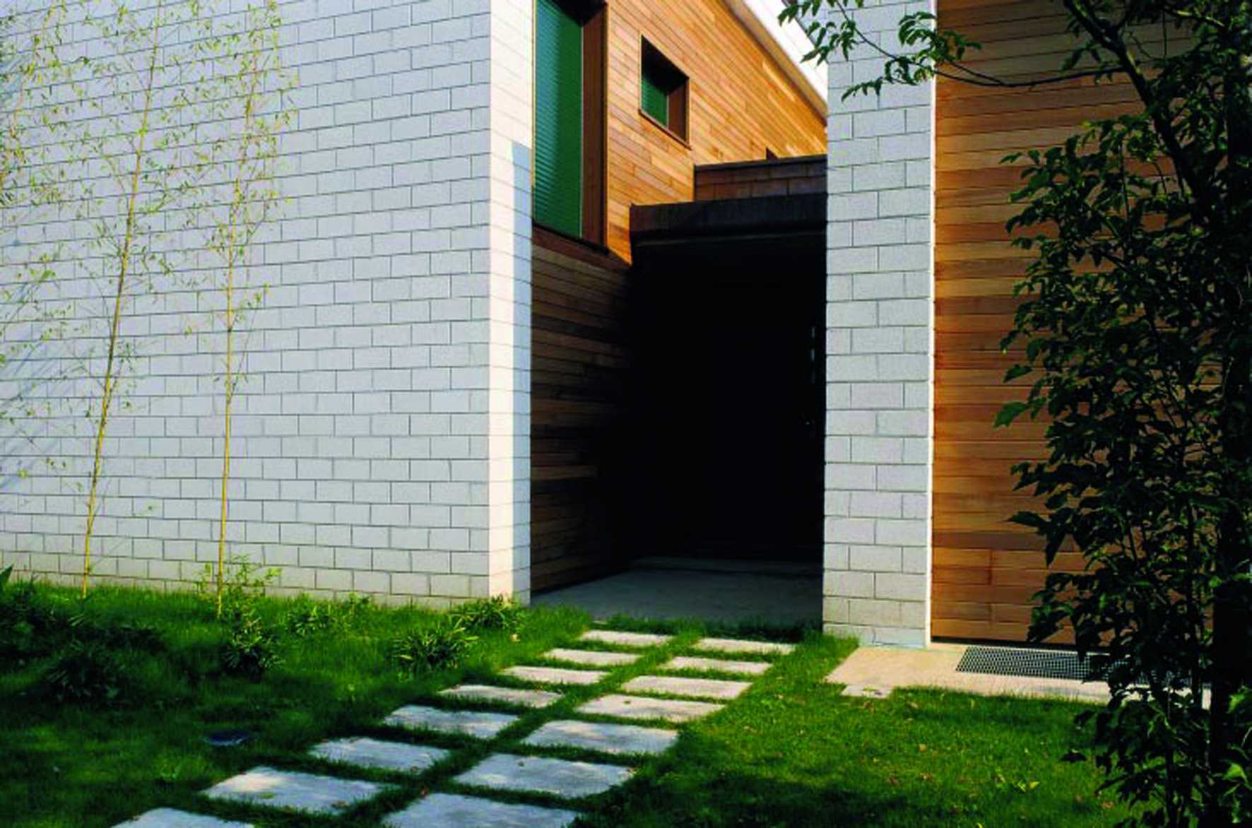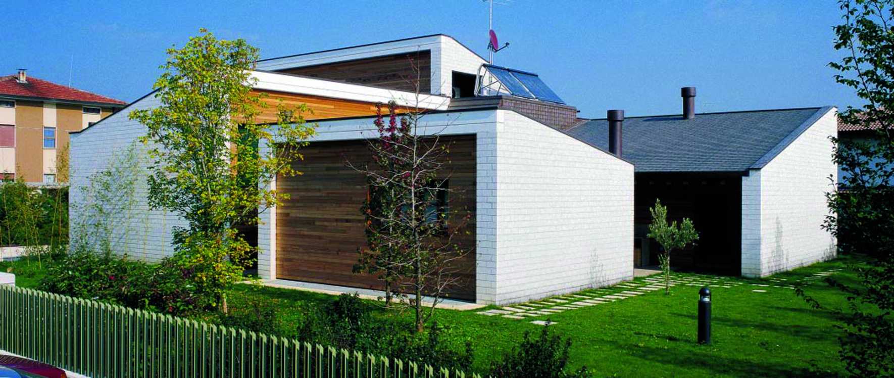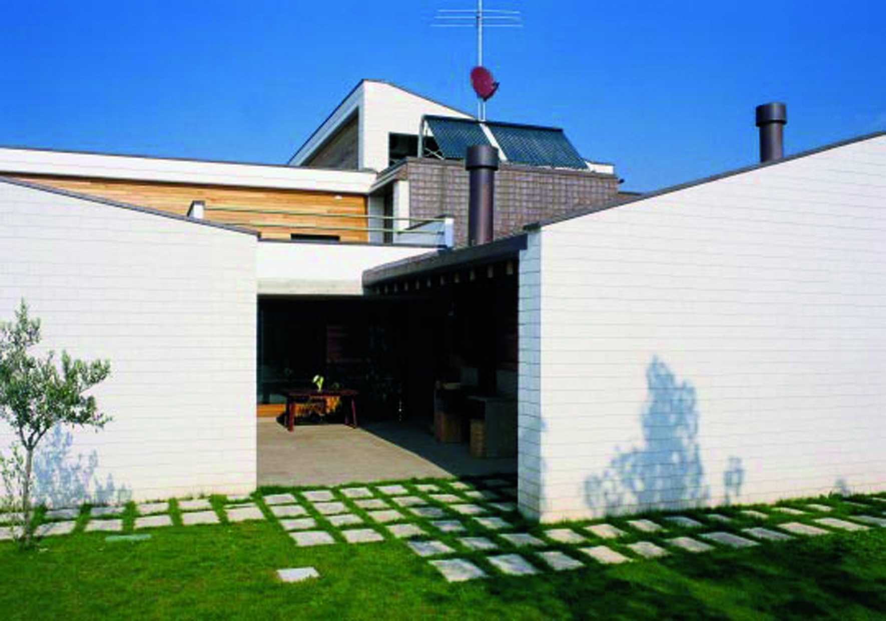 Tre volumi a scatola che si articolano su un patio centrale. Un edificio teso all’introversione, affatto relazionato con la compromessa e discontinua realtà architettonica circostante. Lo spazio misto diviso tra casa e lavoro è garantito da percorsi separati mantenendo tuttavia una omogeneità morfologica tra la zona destinata all’abitazione e quella riservata al magazzino e al laboratorio.
