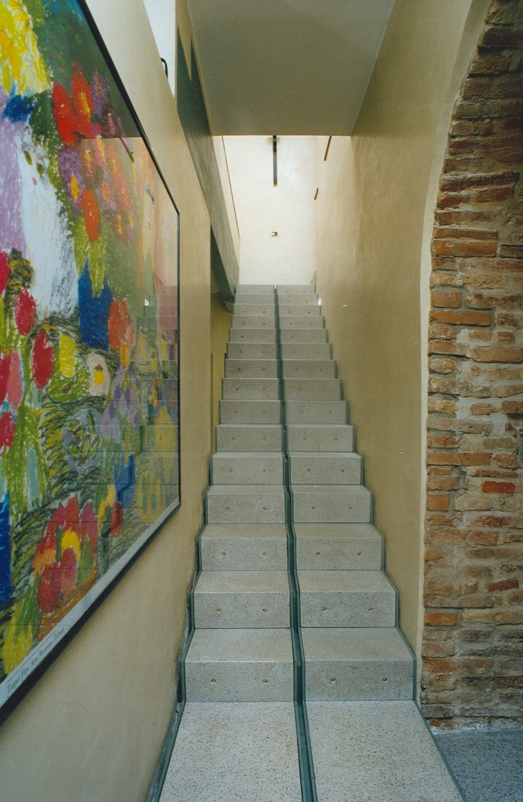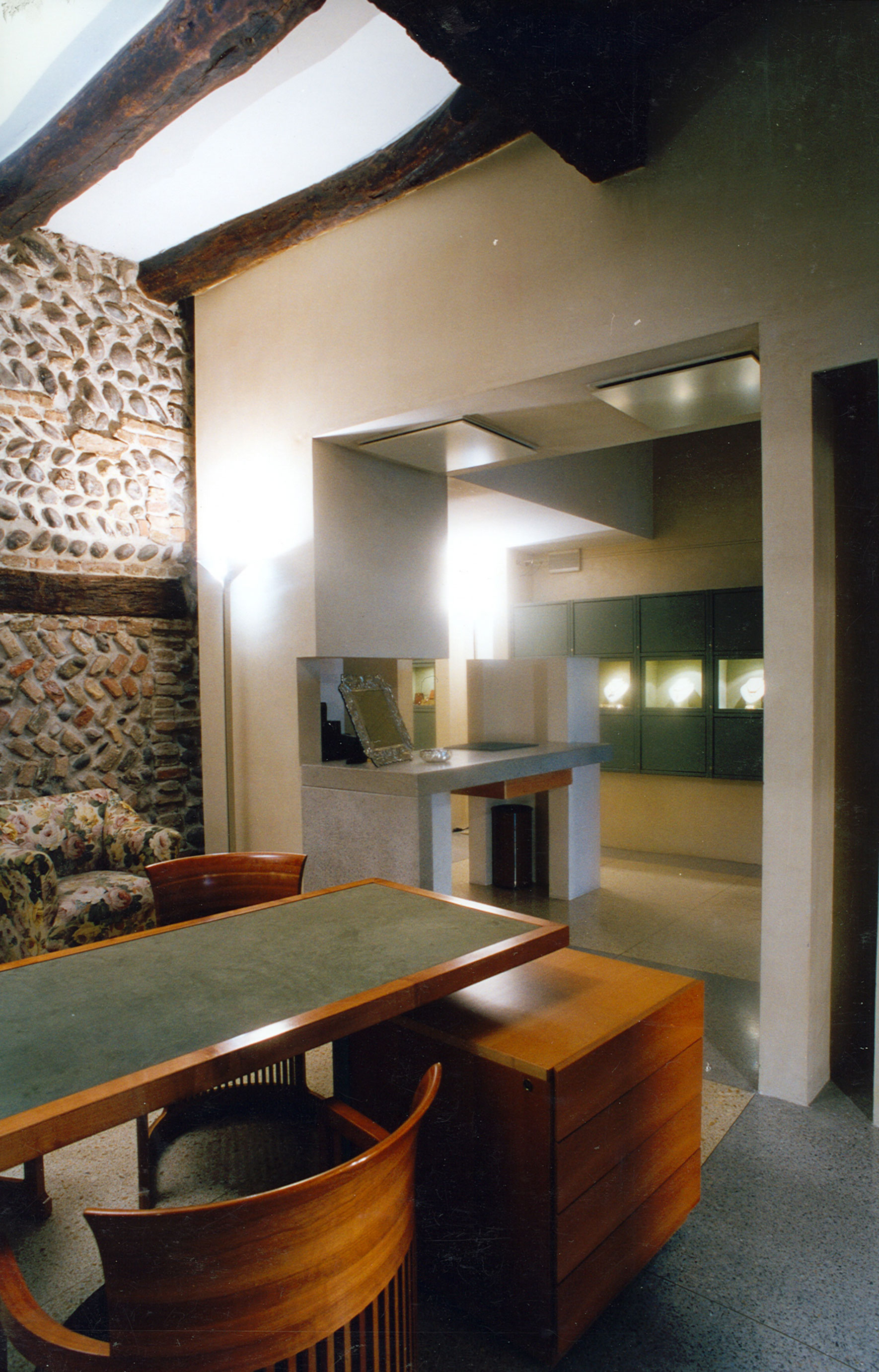 Seminato veneziano, intonaco di calce schiacciato a spatola, ferro e legno di ciliegio per i gioielli dell’orefice di Martinengo. Le vetrine sono scatole semoventi su cerniere con perni di bronzo. Anche troppo evidente l’influenza di Carlo Scarpa, mio professore a Venezia.