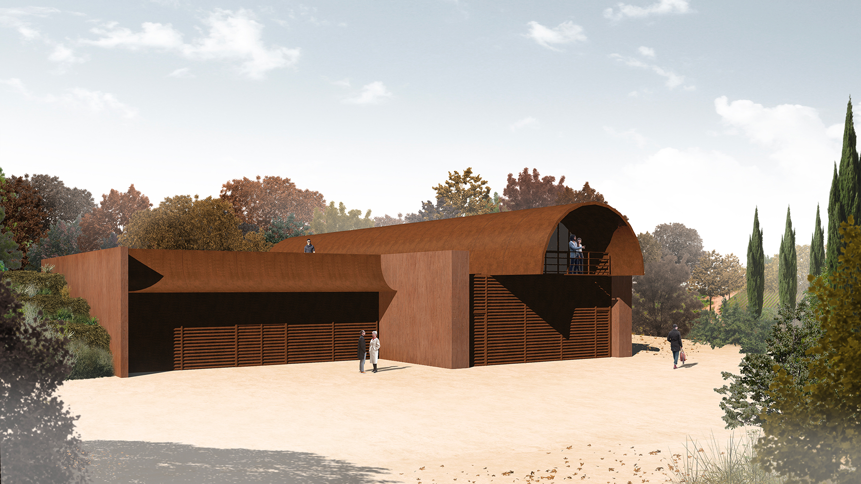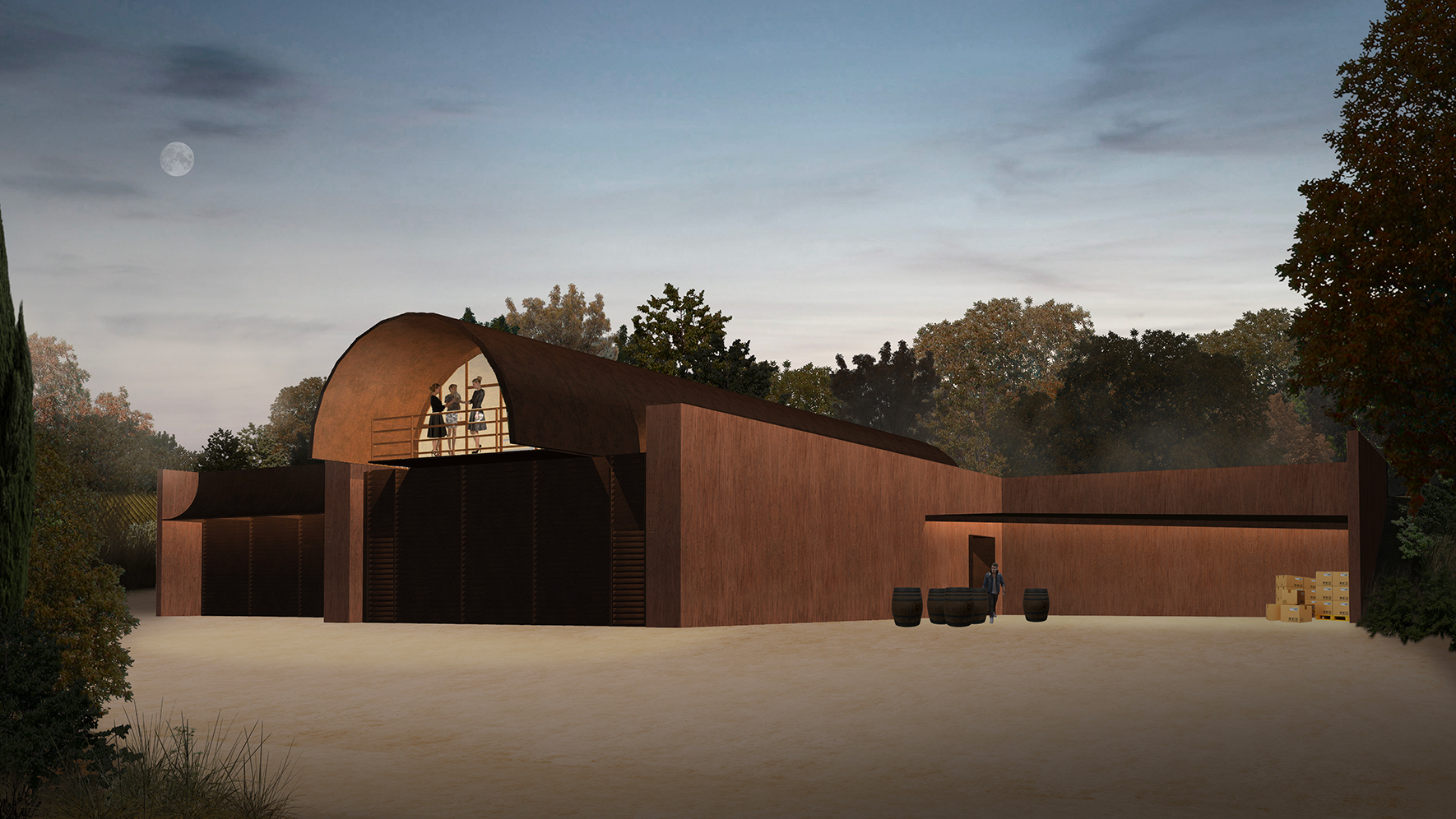 Il cuore del progetto è un corpo centrale dedicato alla vinificazione, affinamento e imbottigliamento, sovrastato da una copertura a botte che ospita una passerella sospesa e un’area panoramica per le degustazioni. L’uso dell’acciaio corten rafforza il legame materico con la terra, accompagnando la trasformazione del vino con un’architettura sobria, resistente e fortemente evocativa.