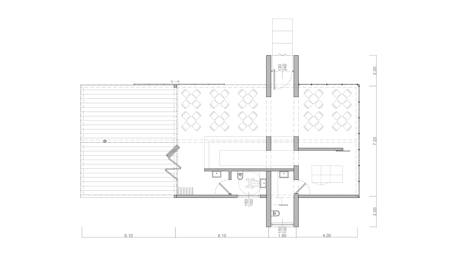 Il piccolo edificio diventa così una sorta di piattaforma galleggiante, nella quale i fruitori possono liberamente muoversi. I serramenti - scorrevole sul lato lungo e impacchettabile sul lato corto - consentono di modificare l’aspetto dell’edificio a seconda delle esigenze, delle stagioni e degli eventi. Aprendo infatti l’infisso impacchettabile si ottiene rapidamente un unico spazio coperto, dove la continuità tra interno ed esterno è regolata dal secondo infisso scorrevole lungo tutta la parete lunga.